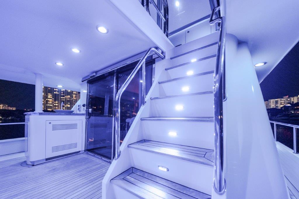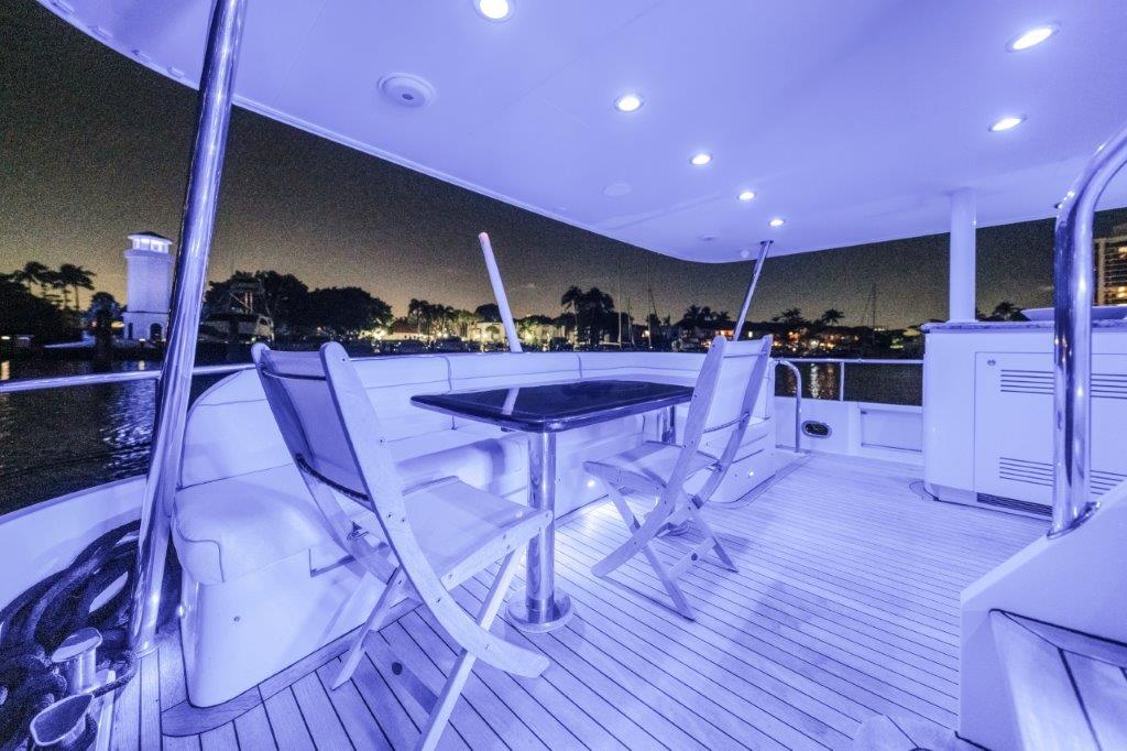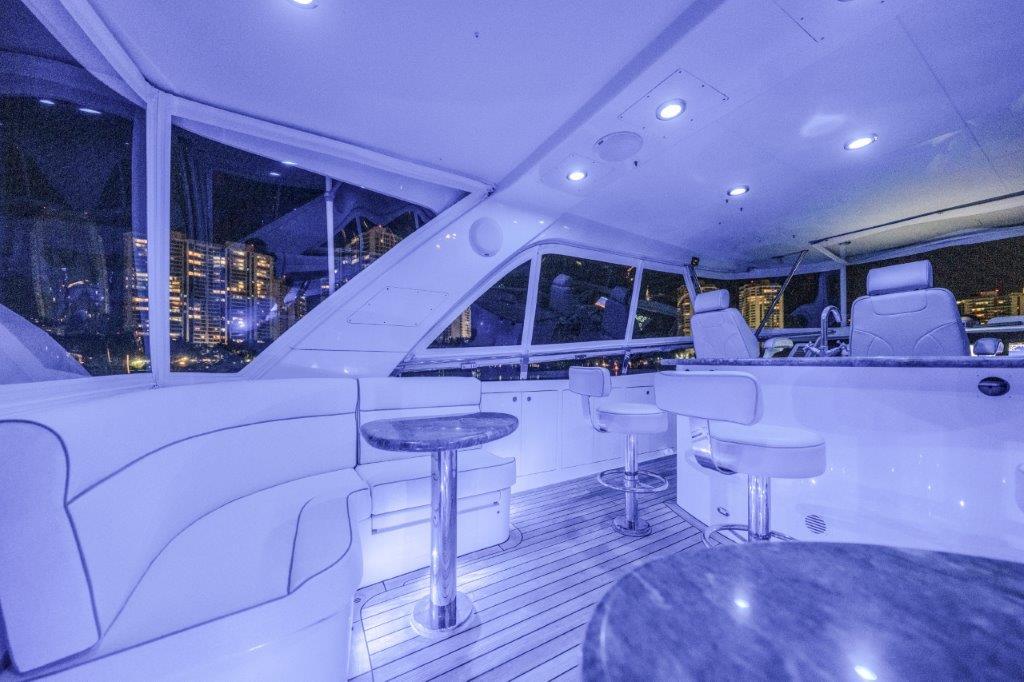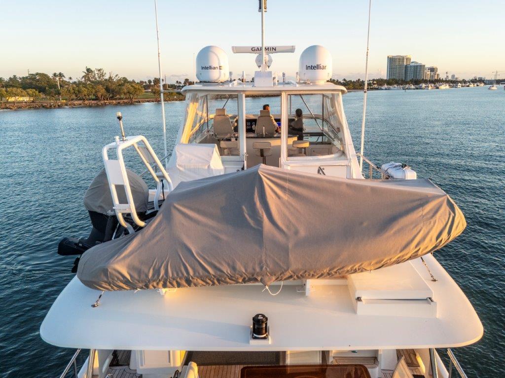 Portside aft wired control remote plugin, Naiad 254 hydraulic stabilizer fin system, Naiad Hydraulic bow and stern thrusters, AGM batteries. Updated MarineAir chilled water air conditioning/heat climate system, 35-gallon hot water heater, FCI 1500 Watermaker, ACR Epirb Beacon, newly replaced custom 4-sided flying bridge enclosure with EZ2CY Polycarbonate Panels, exterior teak decks throughout, staples and tender cleats on swim platform, Glendinning Cablemaster, Nautical Structures HCR 1500lb electric/hydraulic yacht crane and never used new 14' Highfield RIB center console tender with new Yamaha 60 hp 4-stroke outboard.