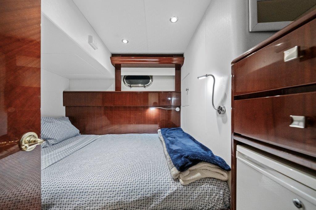 - Double island berth with mattress, bedspread, pillows, pillow shams, and throw pillows