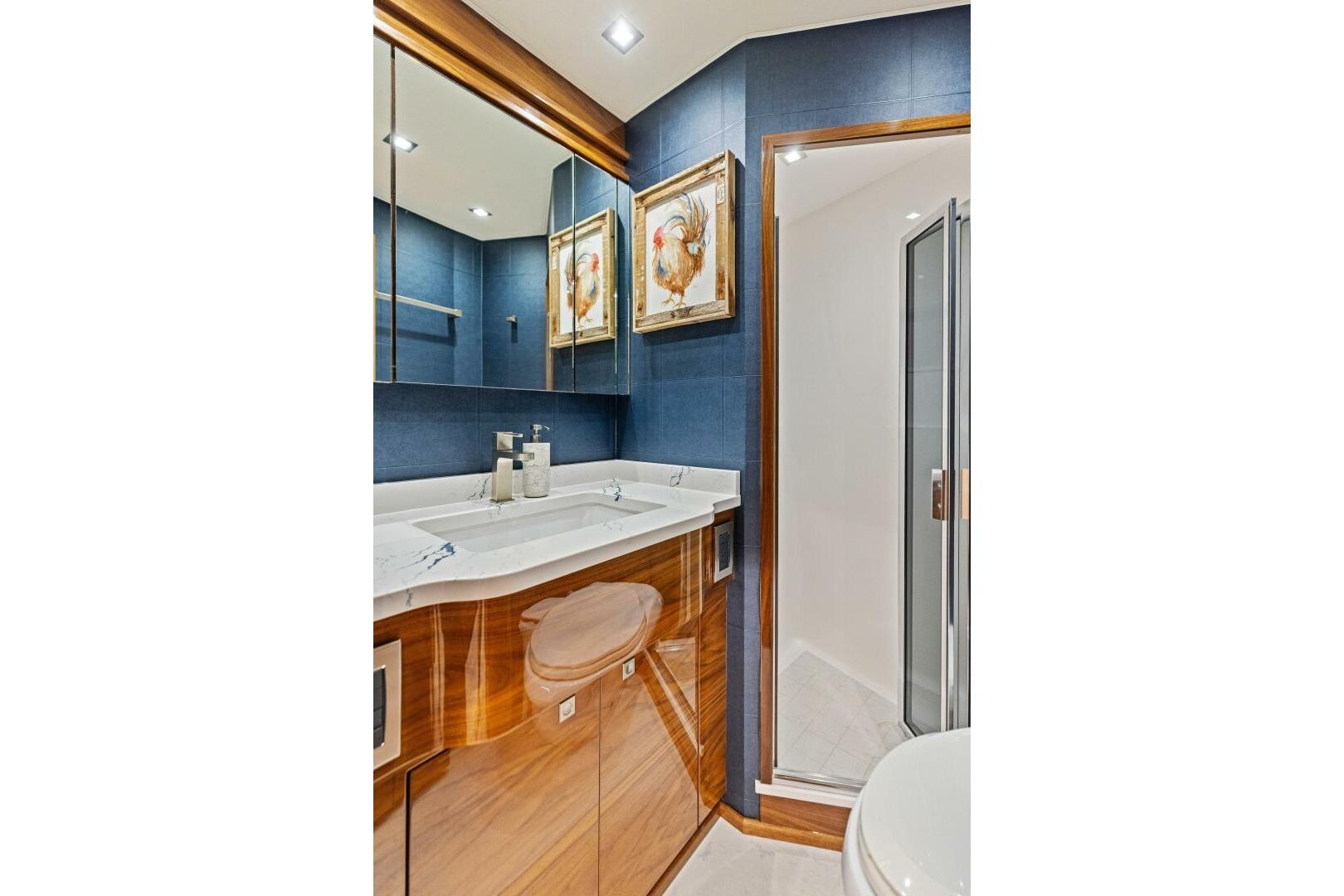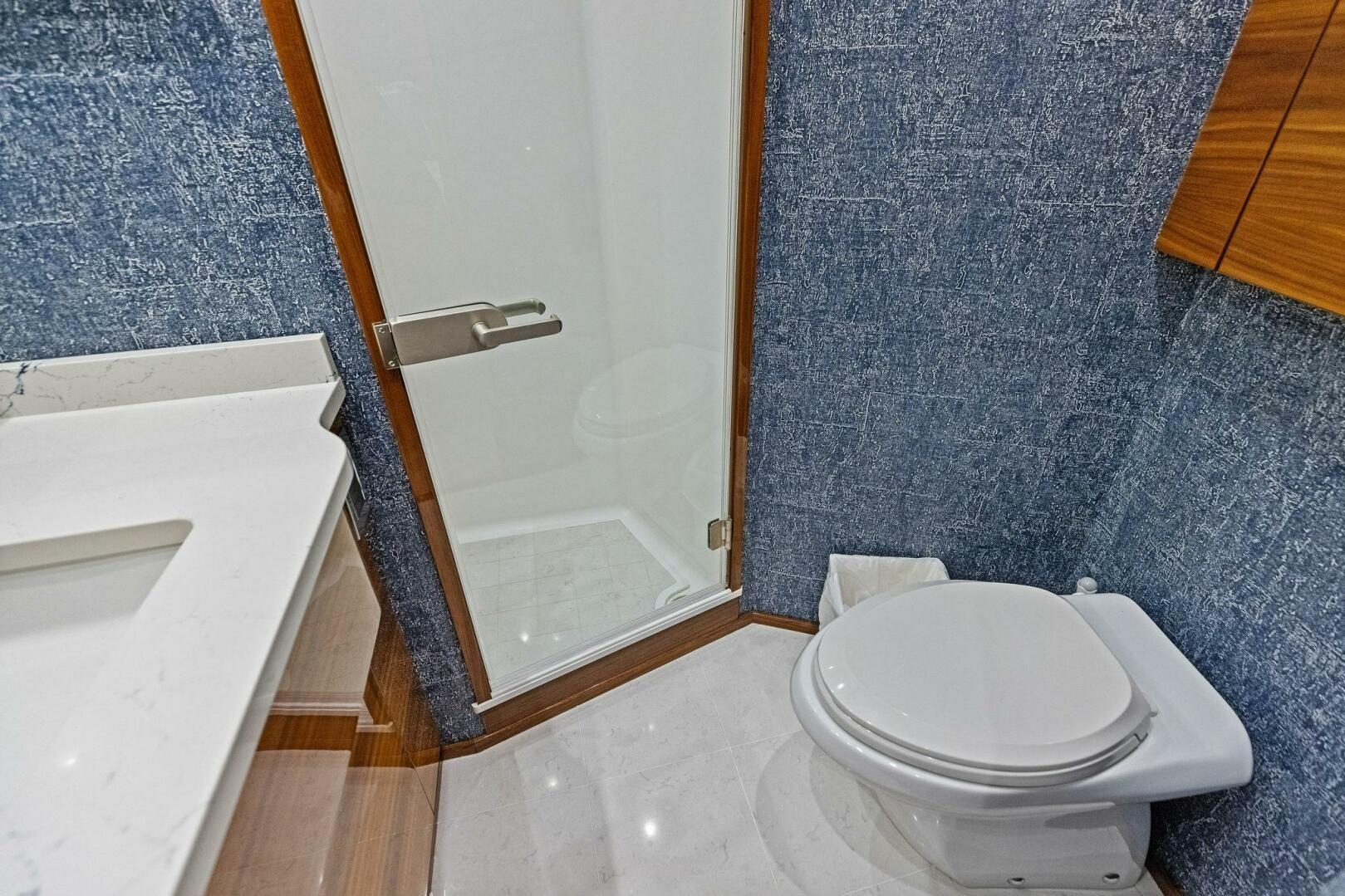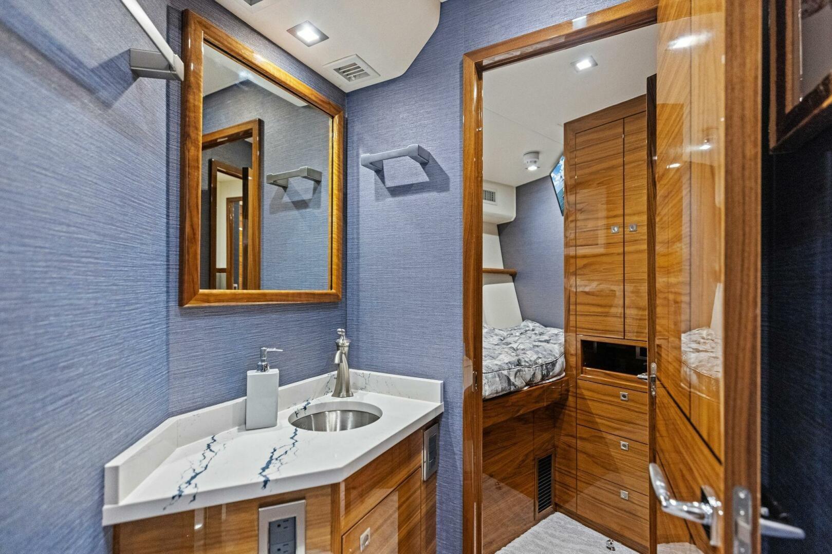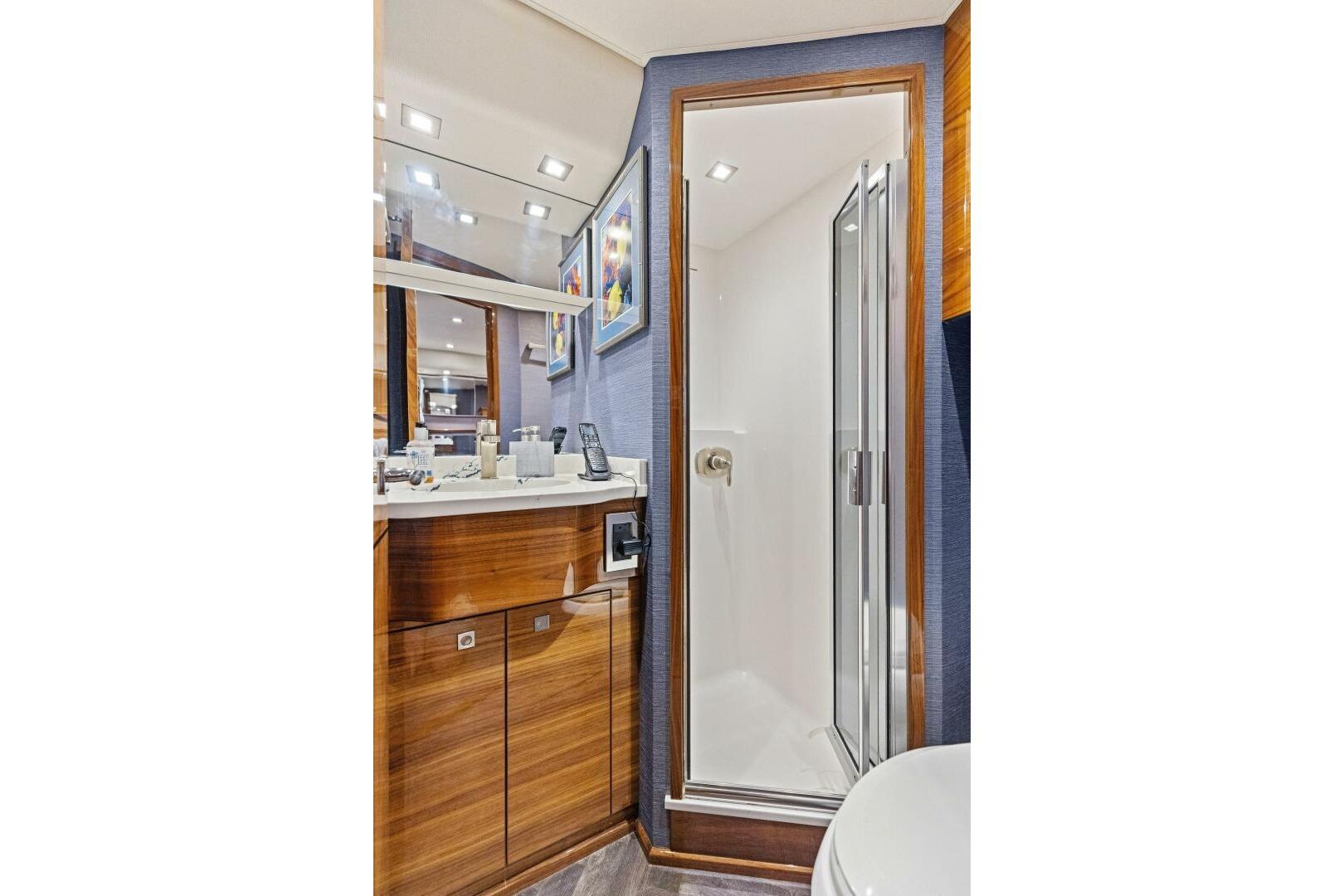 Salon/GalleyThe salon area of “Backlash” features an open galley design with L- shaped storage sofa surrounded by a wood framed sculpted carpet area. There is horizontal grained gloss walnut interior throughout and all flooring through the salon and dinette is a herring bone washed timber pattern. The galley counters and backsplashes are of white stone with blue veins with an oversize “Blanco” split sink. The custom oversize galley island is Lumix stone with waterfall edges and is back-lit. The beauty of the island is further enhanced by 3 custom release Dubliner 3 barstools with polished stainless bases. Other features include a dinette table with rod storage drawer beneath, pop up TV, and extra refrigeration in the galley as well as a dishwasher and oven. Forward of the galley there is a pantry area with custom storage drawers for everyday dishware and rod storage racks. There is also a day head positioned in the aft end of the salon behind the enclosed bridge stairway.
