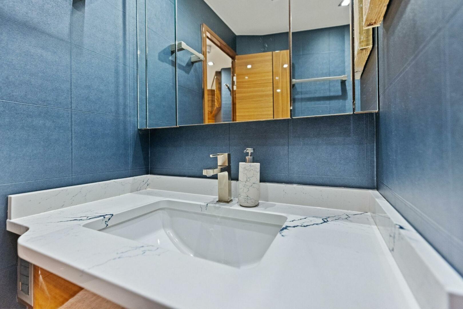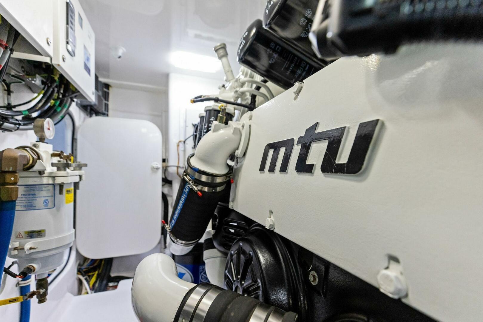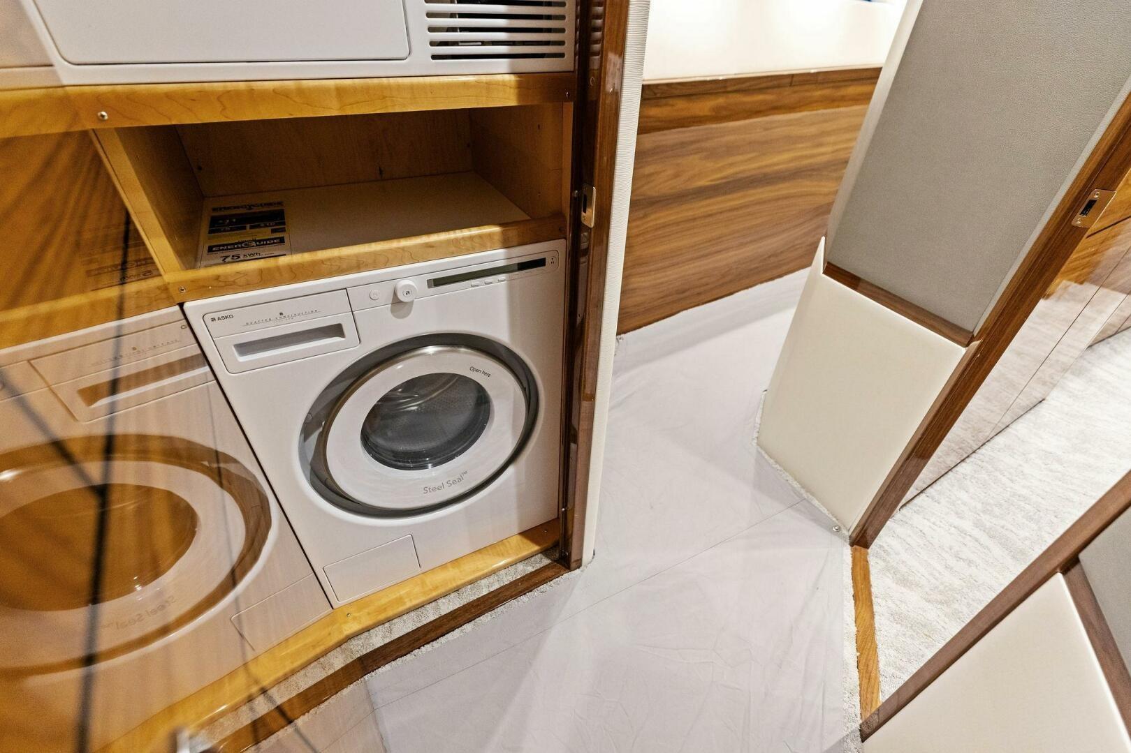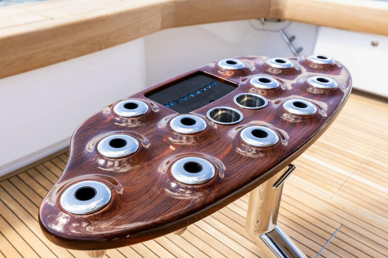 Salon/GalleyThe salon area of “Backlash” features an open galley design with L- shaped storage sofa surrounded by a wood framed sculpted carpet area. There is horizontal grained gloss walnut interior throughout and all flooring through the salon and dinette is a herring bone washed timber pattern. The galley counters and backsplashes are of white stone with blue veins with an oversize “Blanco” split sink. The custom oversize galley island is Lumix stone with waterfall edges and is back-lit. The beauty of the island is further enhanced by 3 custom release Dubliner 3 barstools with polished stainless bases. Other features include a dinette table with rod storage drawer beneath, pop up TV, and extra refrigeration in the galley as well as a dishwasher and oven. Forward of the galley there is a pantry area with custom storage drawers for everyday dishware and rod storage racks. There is also a day head positioned in the aft end of the salon behind the enclosed bridge stairway.