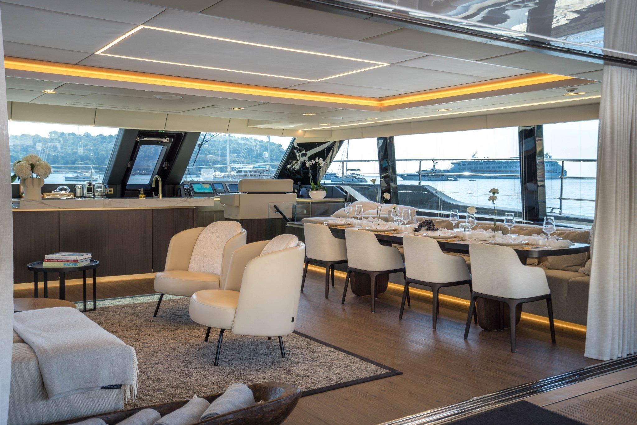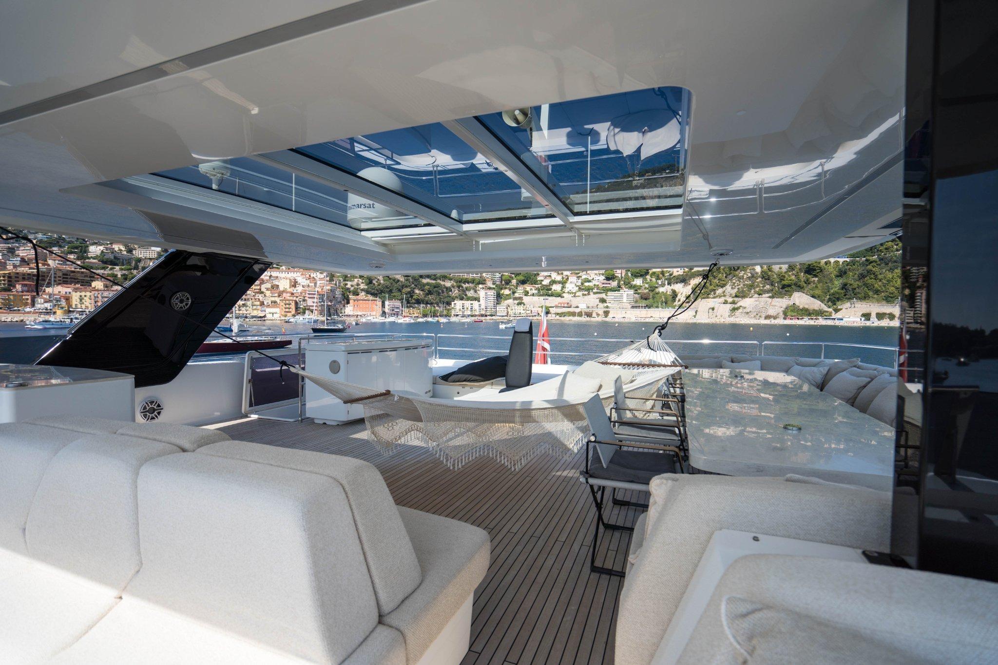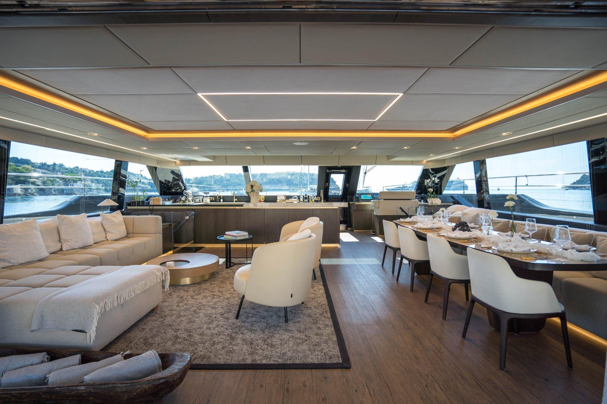 Alfresco relaxation options onboard include a flybridge, a full-beam aft cockpit with a generous dining space, a swim platform, and a garage welcoming a 3-seater jet ski along with water toys and a refueling station.