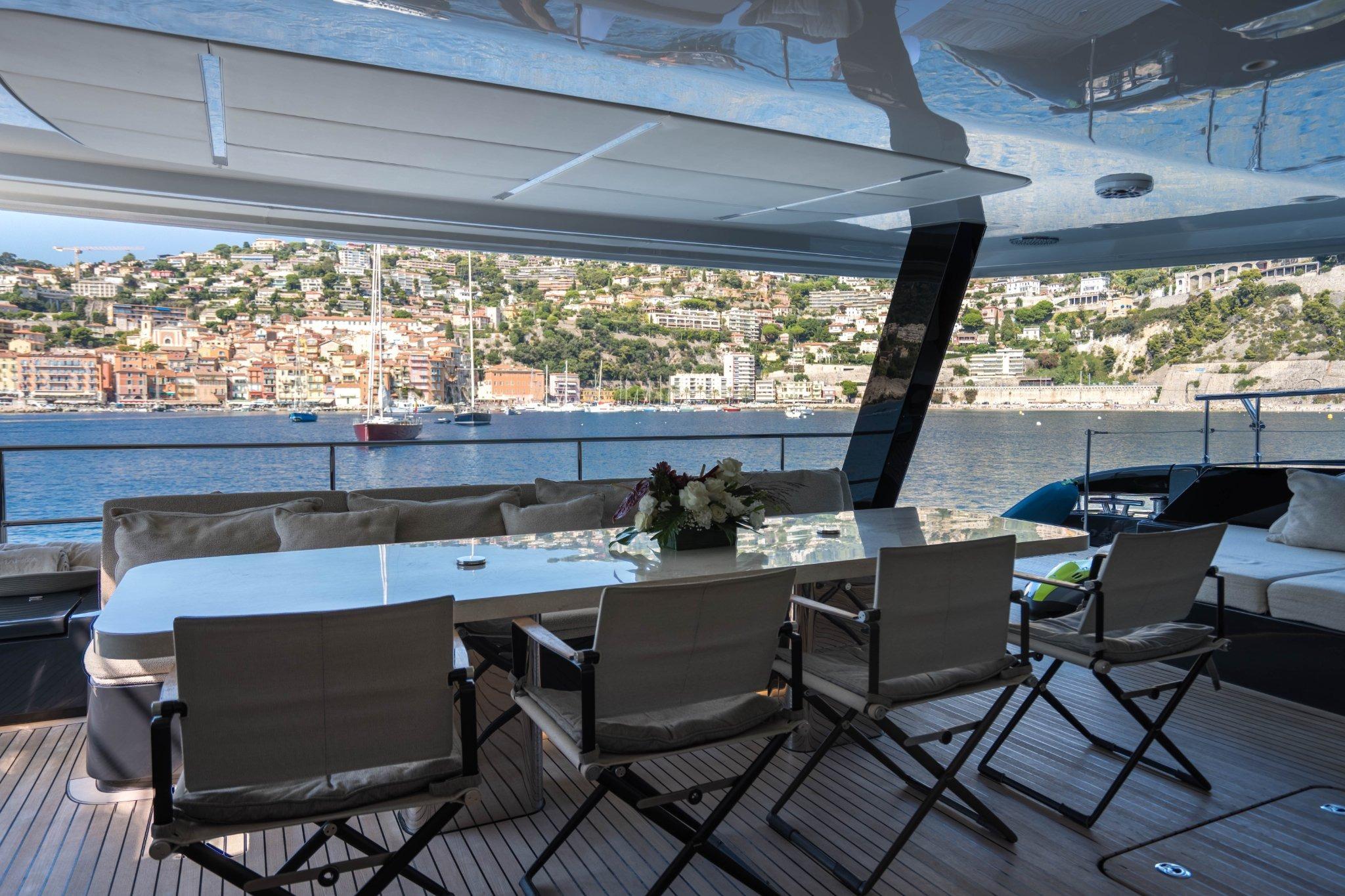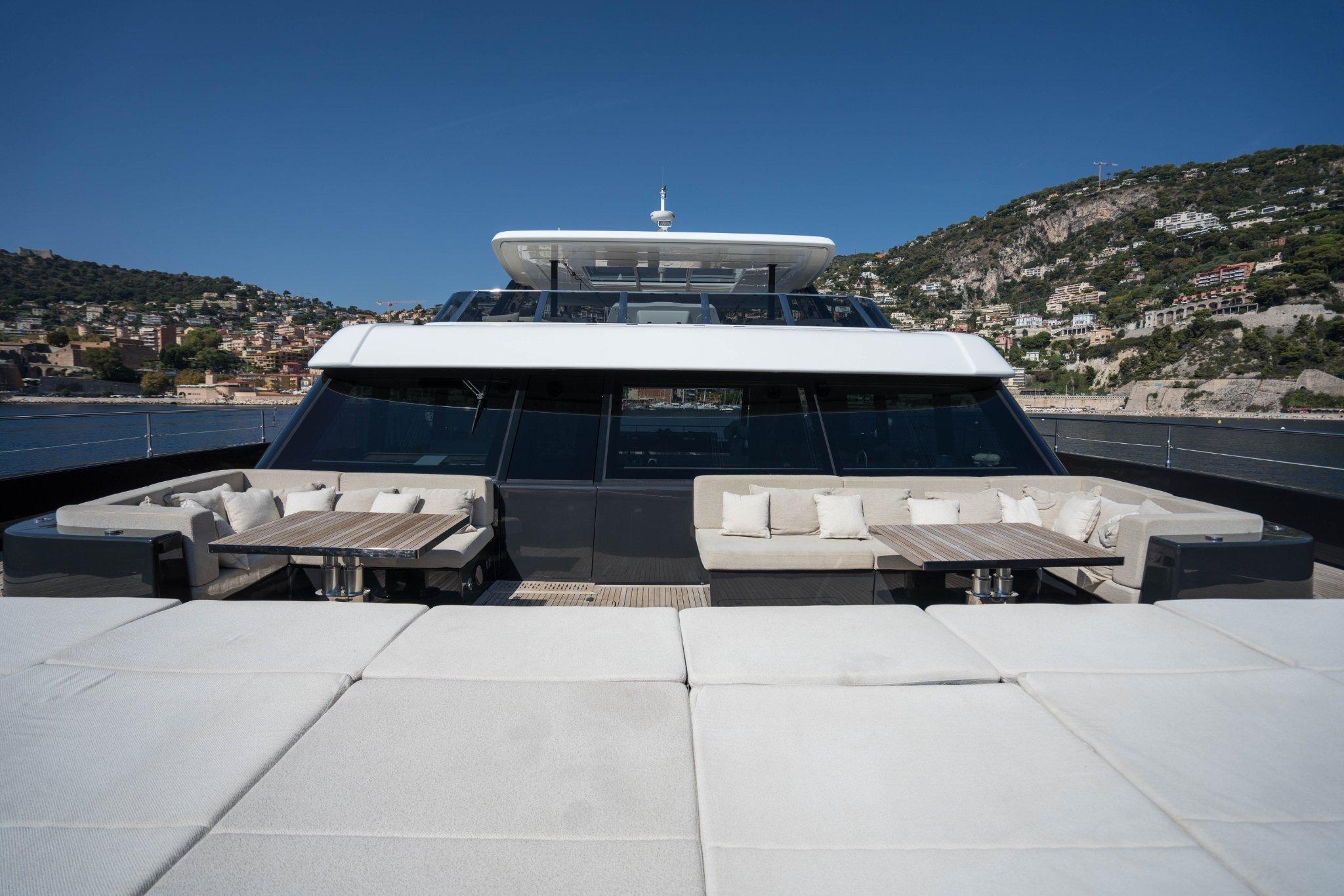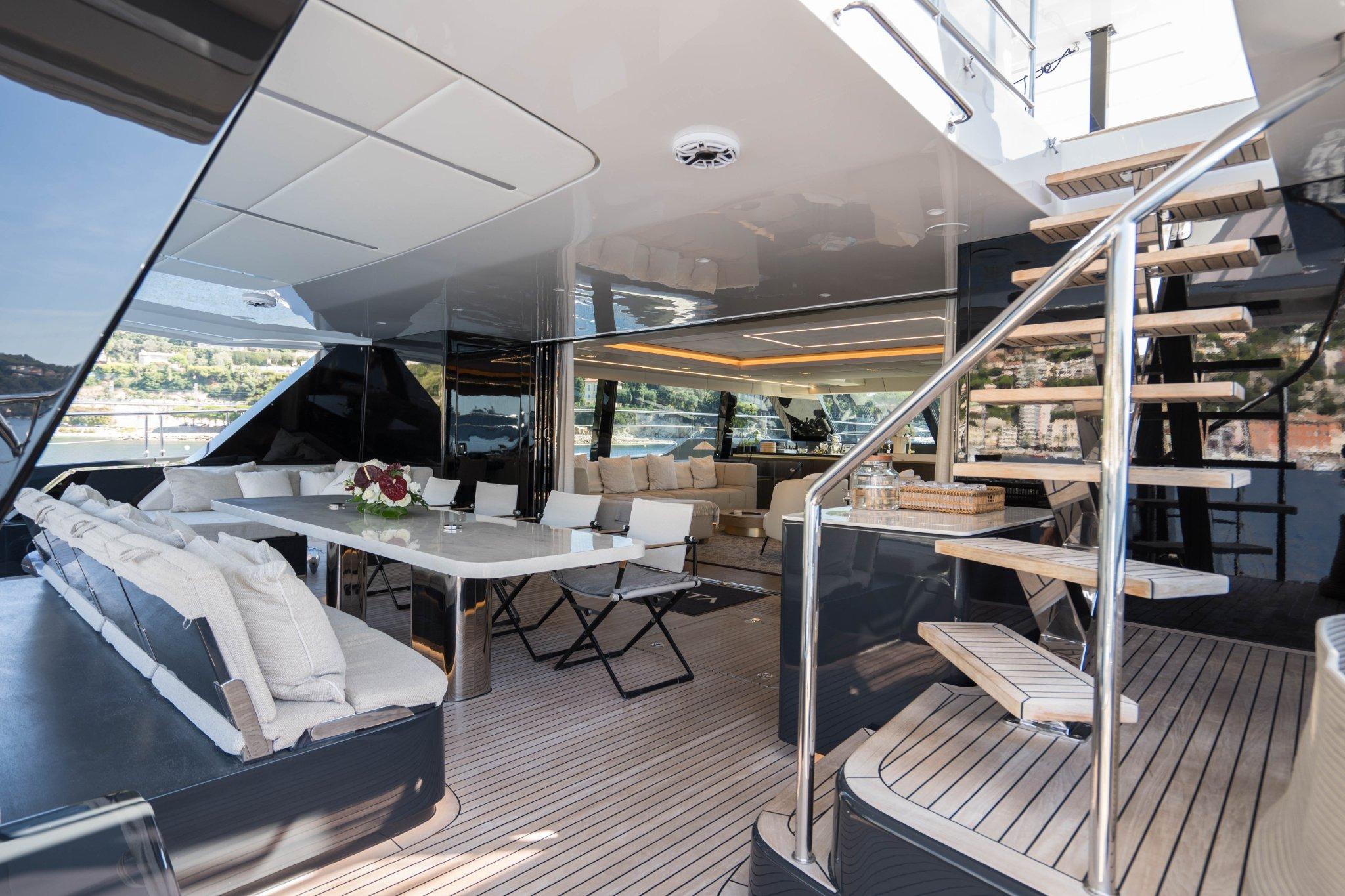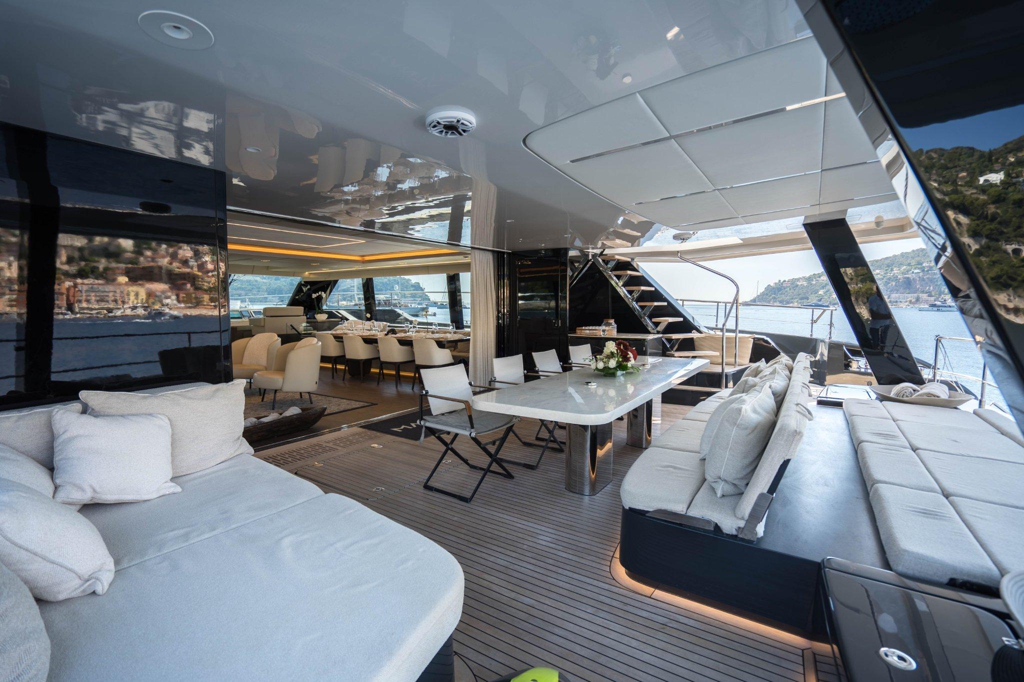 Alfresco relaxation options onboard include a flybridge, a full-beam aft cockpit with a generous dining space, a swim platform, and a garage welcoming a 3-seater jet ski along with water toys and a refueling station.