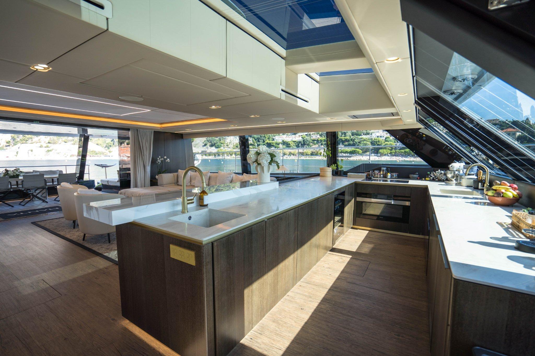 The power catamaran’s fully equipped galley is situated in the bow part of the main saloon. Its large countertop is the perfect spot to serve drinks and starters or to host live cooking shows. The galley also provides direct access to the motor yacht’s impressive full-beam bow terrace.