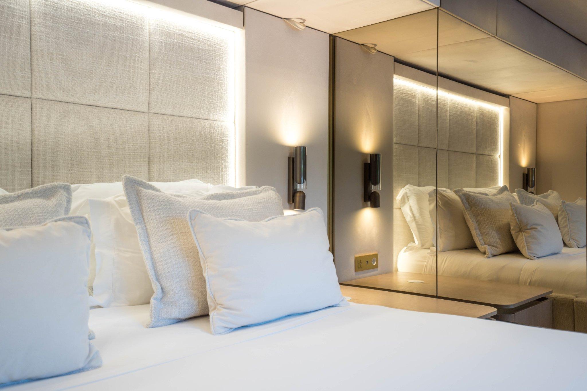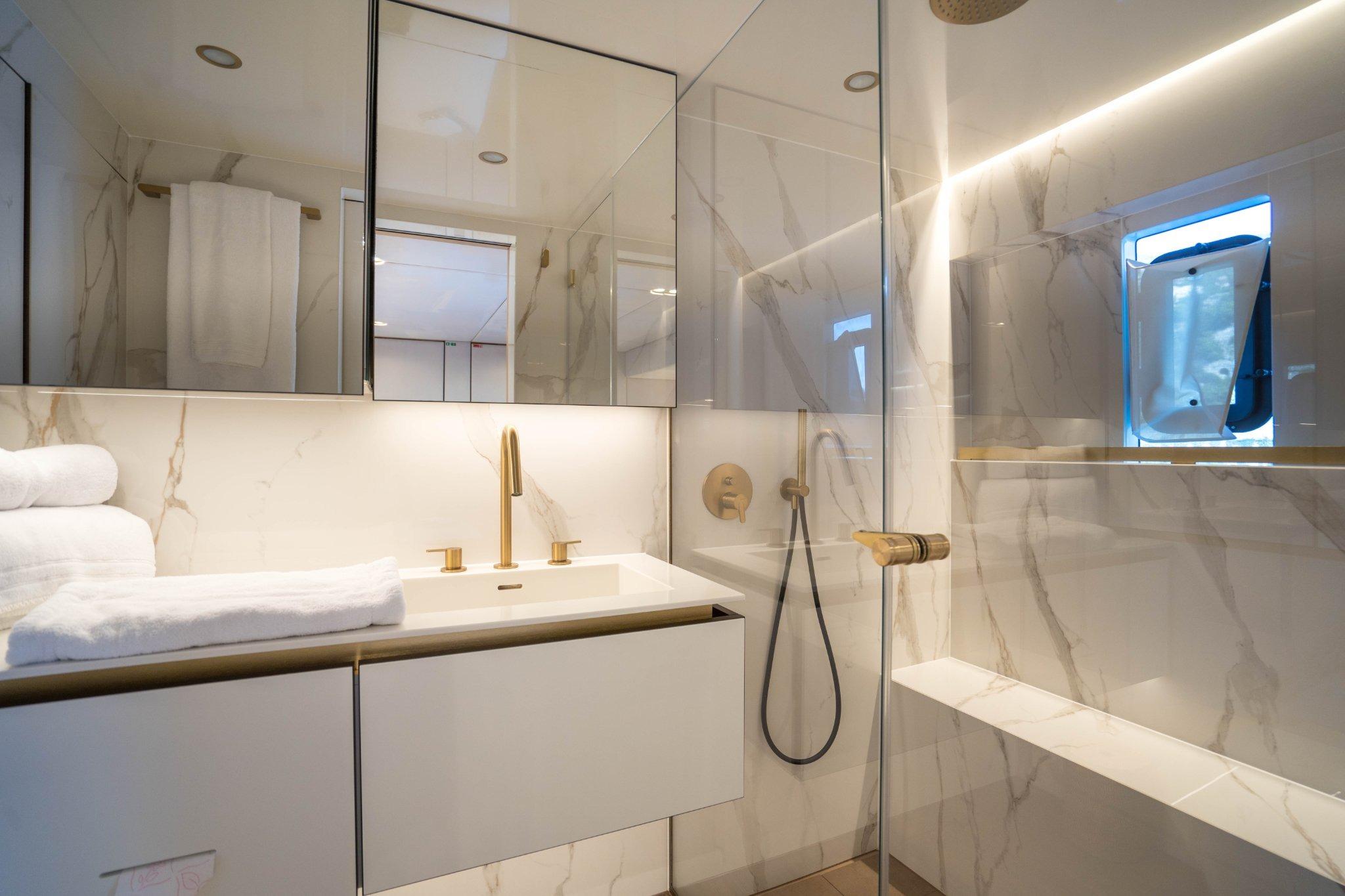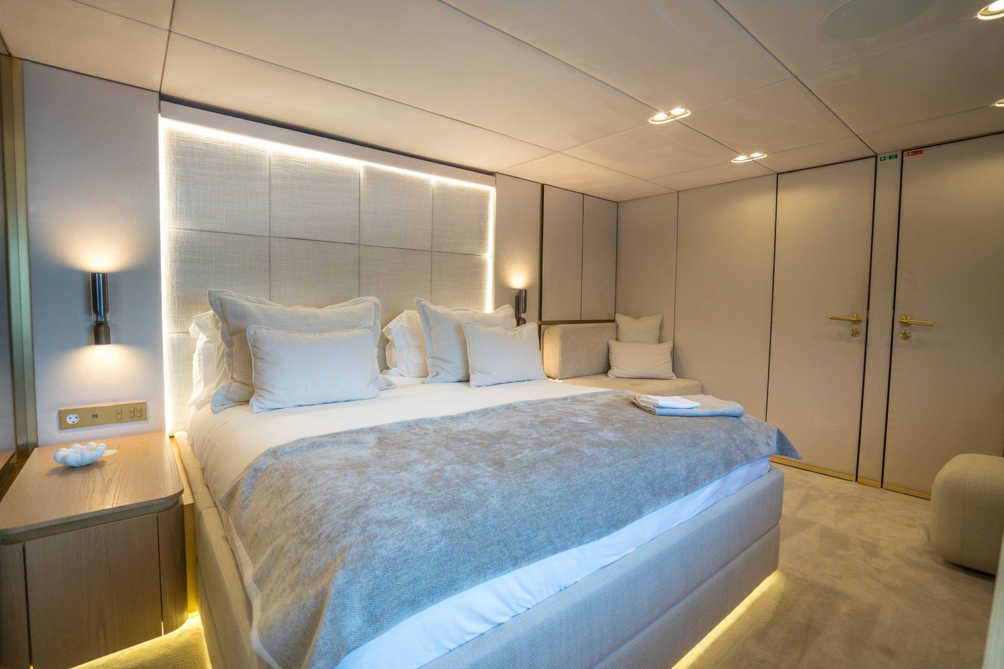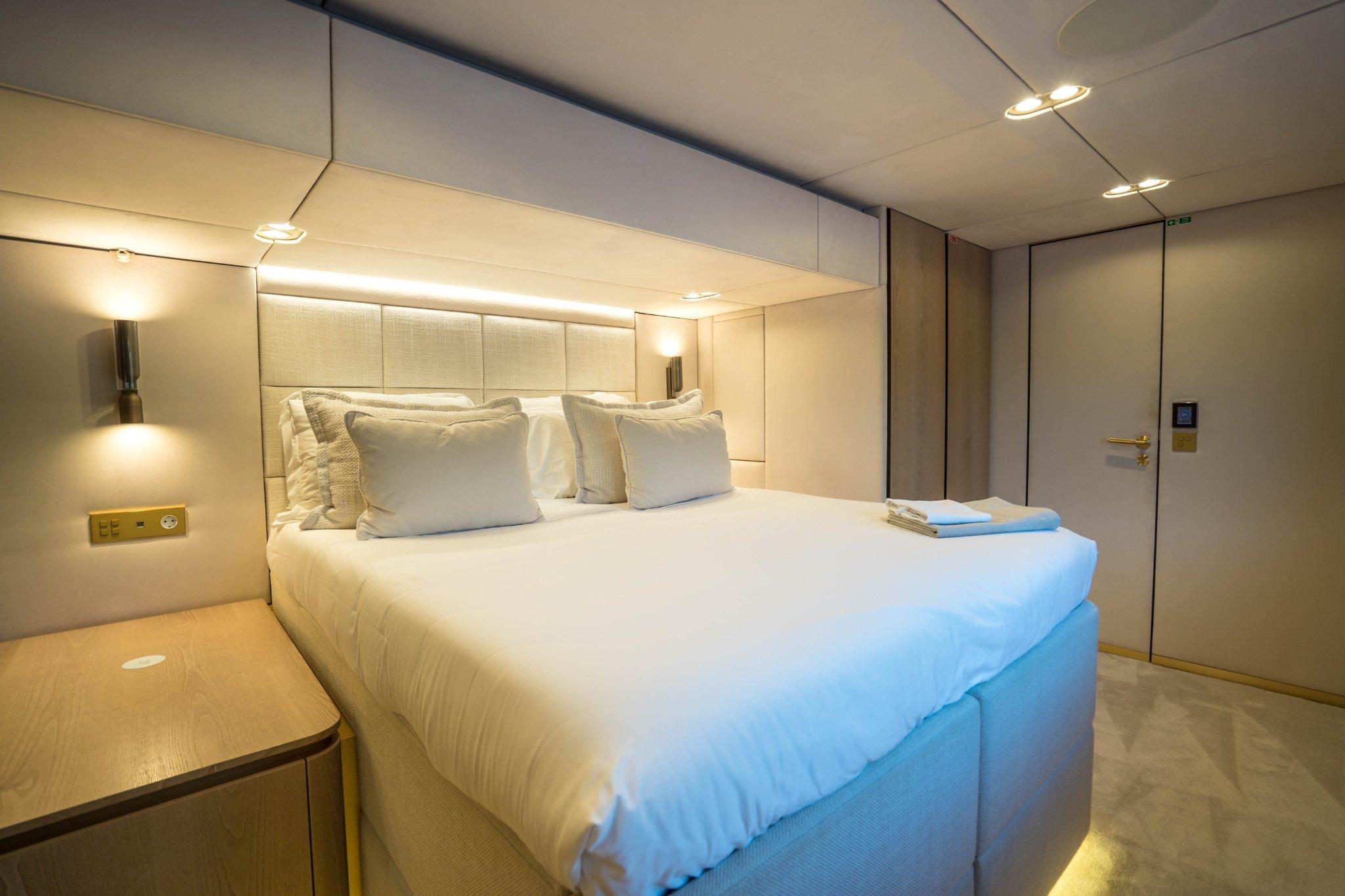 Manta’s five cabin layout includes a large master suite with a double bed, a walk-in dressing, a vanity desk, and sofa. Additionally, guest accommodation also feature a VIP cabin and two guest cabins with convertible twin beds. Not to forget, this 80 Sunreef Power also presents a cozy kid’s cabin with bunk beds.