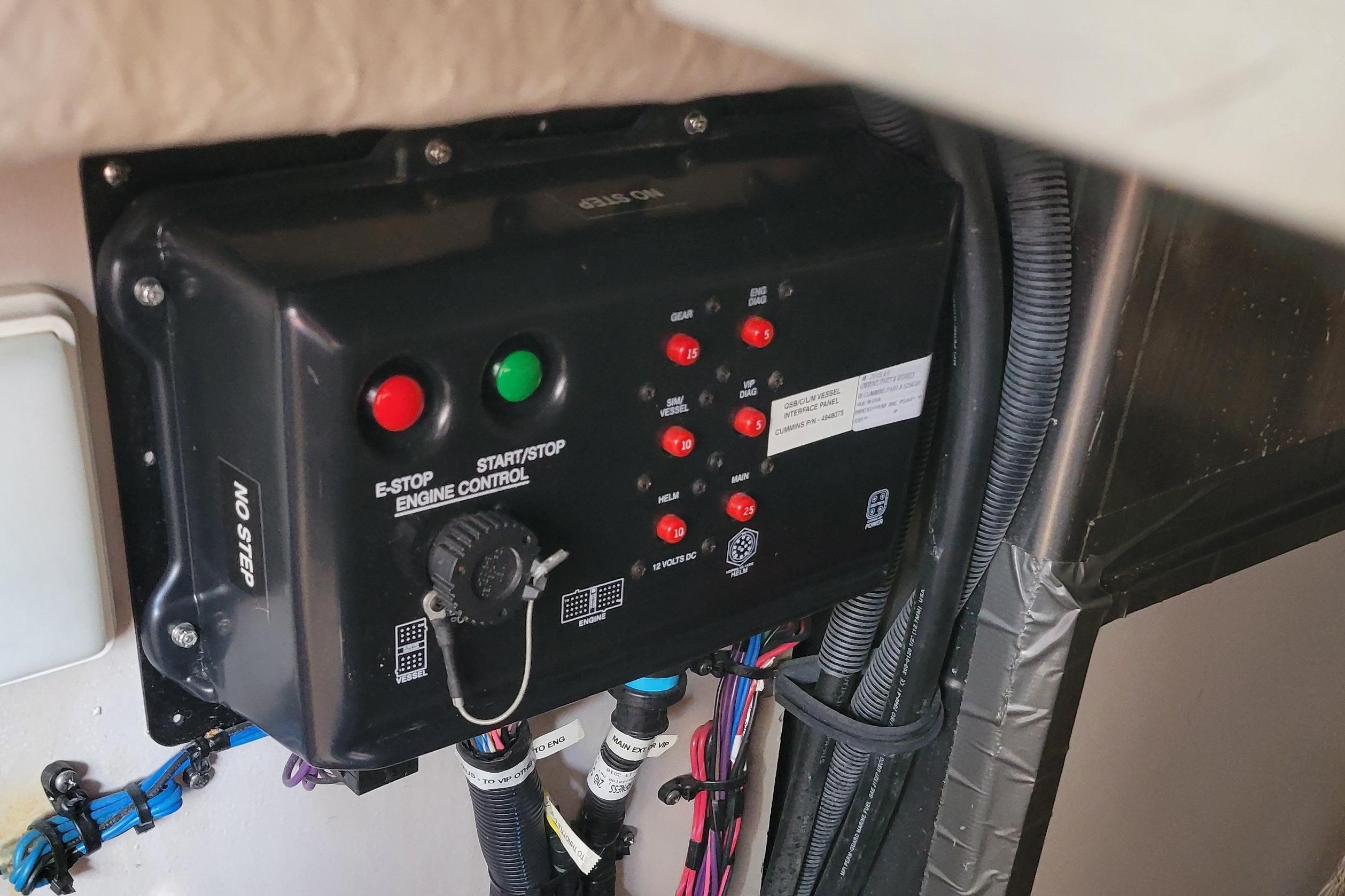 - Cockpit wet bar with sink and faucet, solid-surface countertop, stainless-steel handrail, trash receptacle, and storage cabinet.