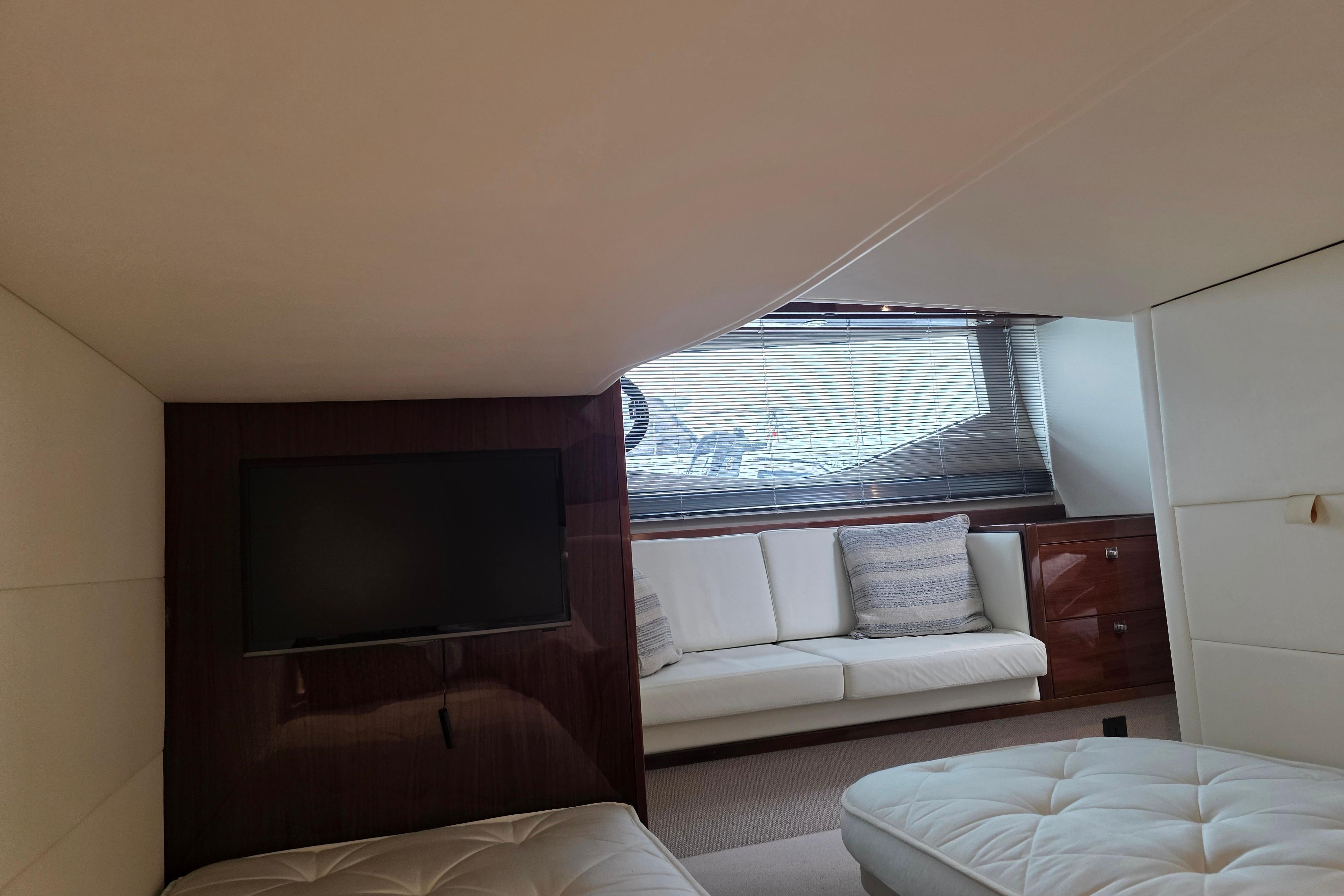 Descending below deck, the Princess V40 (2017) impresses with its well-organized layout and top-quality materials. The use of fine woods, lacquered finishes, and refined fabrics gives the interior a warm and elegant ambiance.