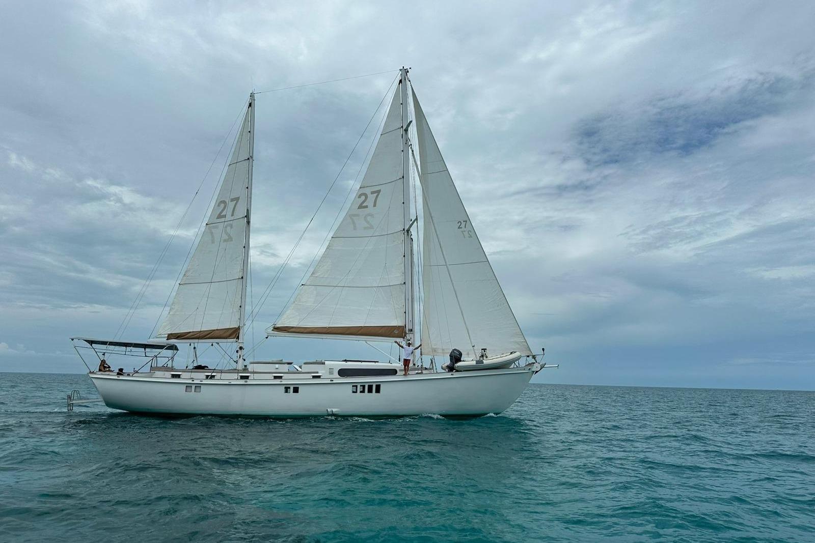 Between 2014 and 2016 ~MiSCHKA~ was rebuilt at Lauderdale Marine Center in Ft. Lauderdale. She was completely gutted/sandblasted to bare aluminum, surveyed; about 30% of the tanks and bottom were re-plated. Awlgrip paint systems were applied throughout. Every piece of equipment inside the yacht was replaced with top-of-the-line products. The deck house was removed and was artfully redesigned & lowered to a flush deck house center and aft cockpit profile above with her beautiful sheer line using sections of the original S&S Burger structures. The interior configuration was transformed into an expansive, wide-open, light-bathed, 2 bed/2 ensuite bath modern bamboo, beach house cruising villa (3rd stateroom option). She can reach anywhere there is 5’6” of water with the centerboard up (15' with centerboard down) and 64' of air draft (Bahamas & ICW Friendly).