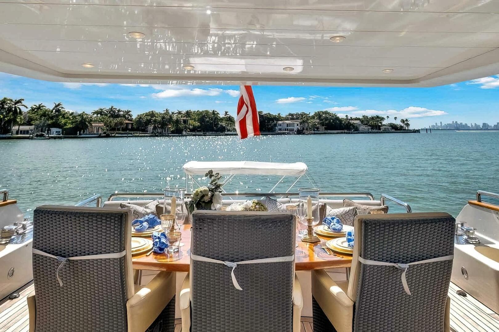 The yacht's exterior decks are thoughtfully designed for a seamless blend of luxury and outdoor enjoyment. The expansive flybridge serves as a centerpiece, featuring a sun lounging area ideal for relaxation and breathtaking views. The main deck aft offers a stylish al fresco dining space, perfect for memorable meals with picturesque surroundings. A generously sized swim platform ensures easy water access and integrates smoothly with the transom for effortless transitions.
