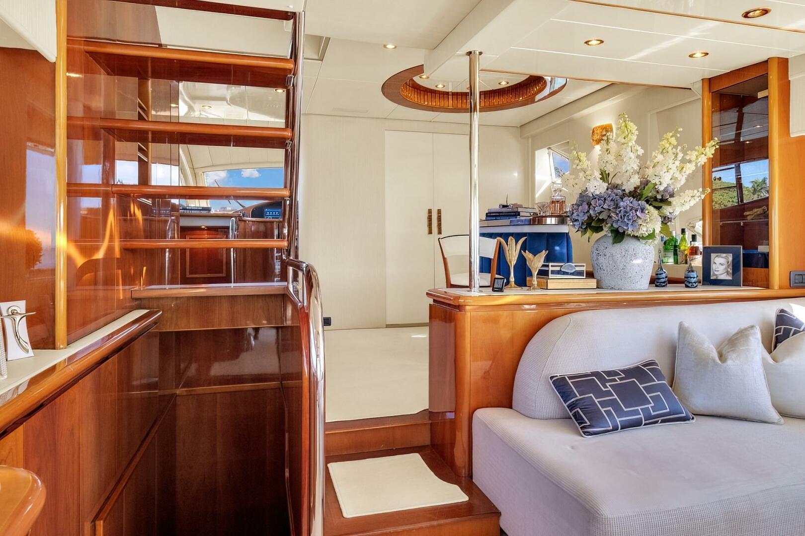 The interior showcases a sophisticated blend of bright white carpeting, Armani vinyl wall coverings, and custom-designed fabrics. The main salon features an open layout with a spacious lounging area to starboard, complemented by a forward bar in place of the traditional dining space. Large windows provide abundant natural light, creating a welcoming and well-lit environment for relaxation and entertainment.