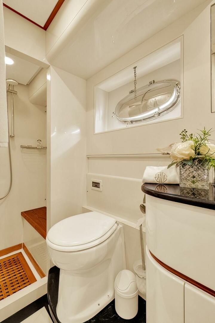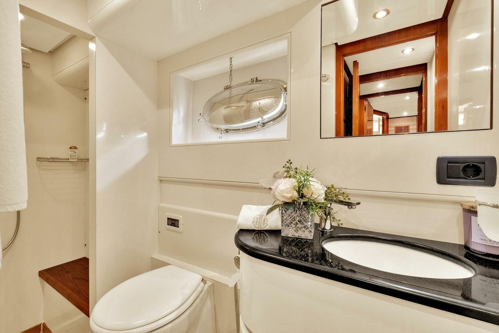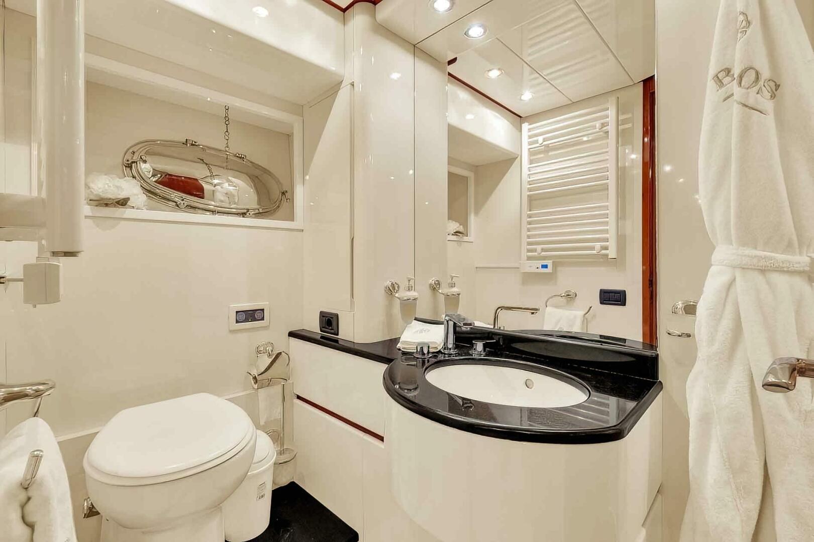 BOULOS accommodates up to seven guests across three cabins, with an additional pullman berth available for flexibility. The full-beam owner's suite on the lower deck offers exclusive access via a private stairway, ensuring maximum privacy and comfort. Two exquisitely appointed guest cabins with en-suite facilities—comprising one king berth and one twin berth—are located forward on the lower deck. Additionally, a dressing area with a pullman berth can be converted into a fourth cabin as needed.