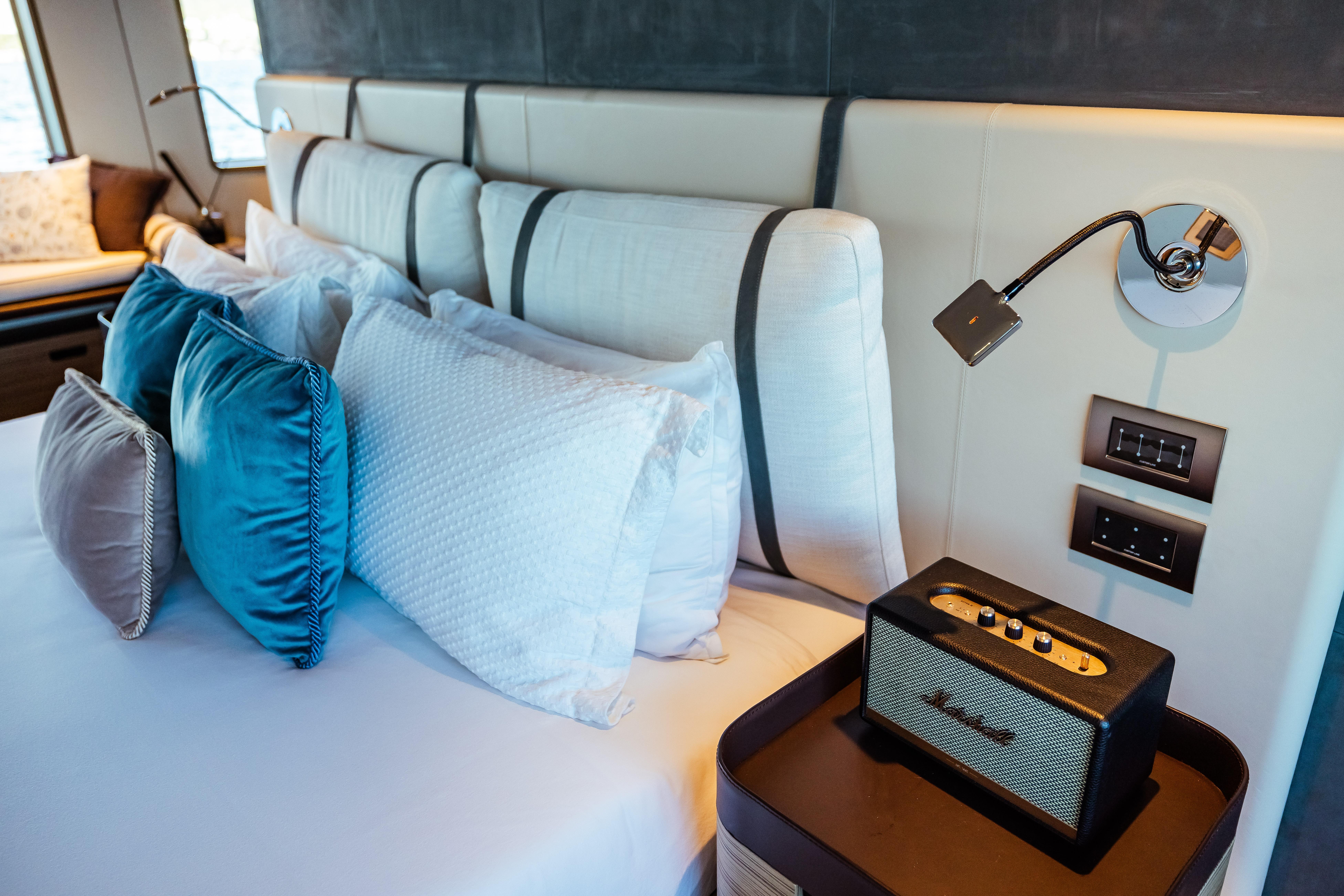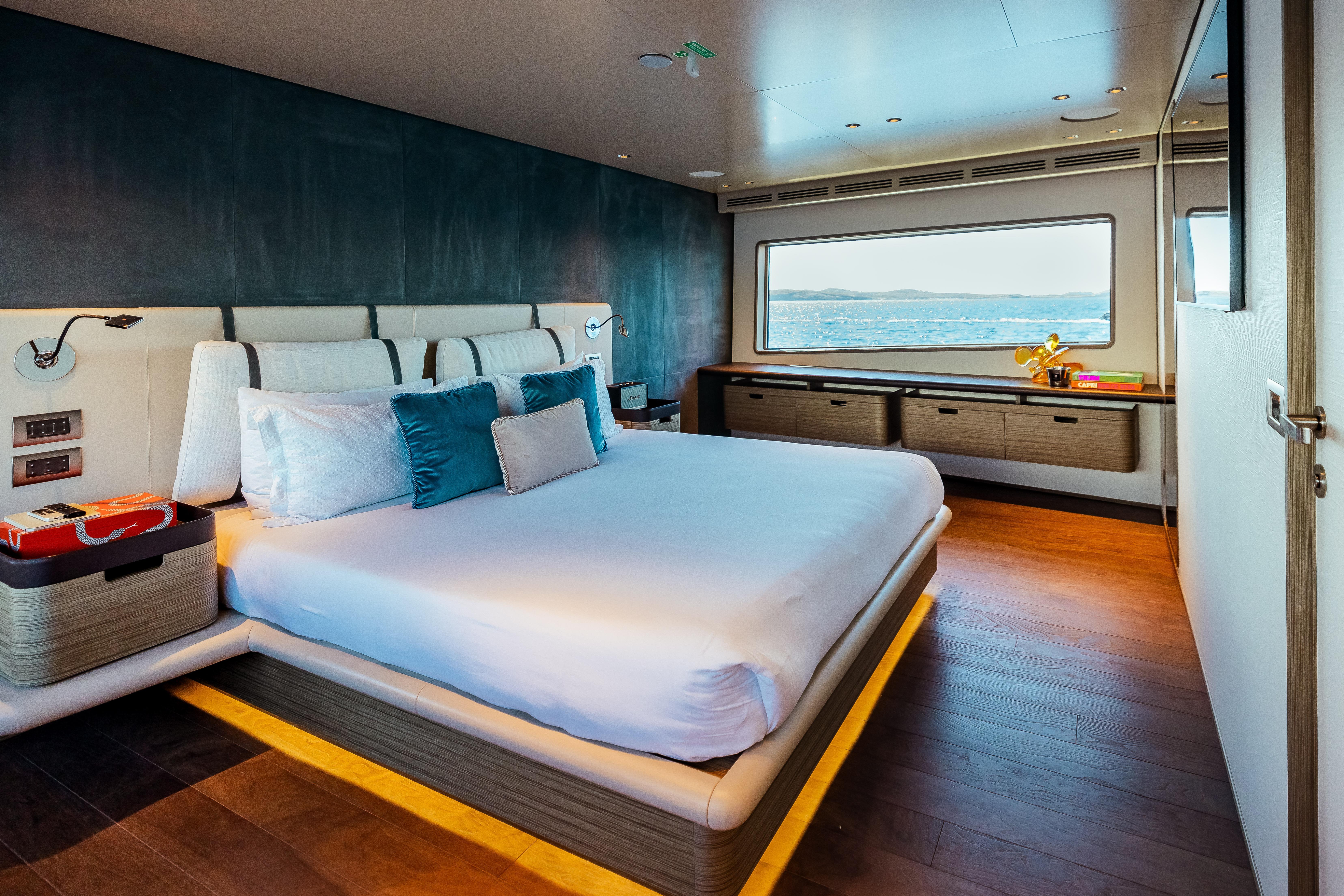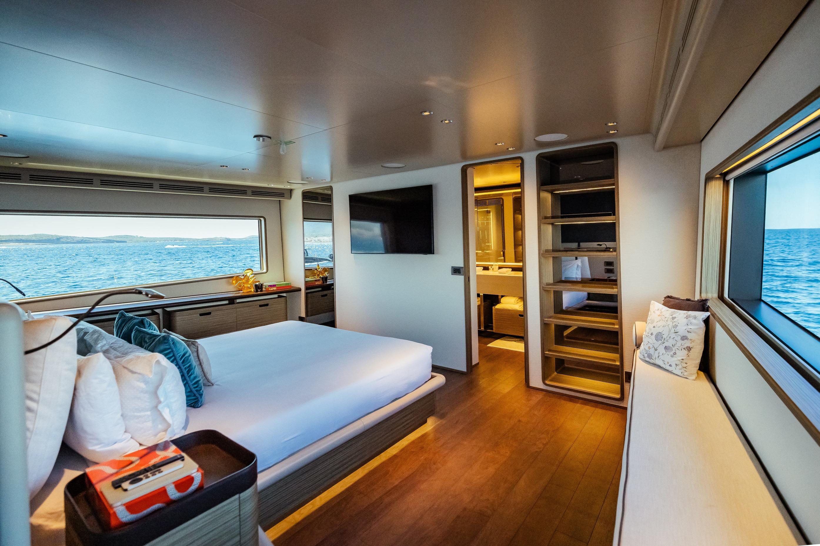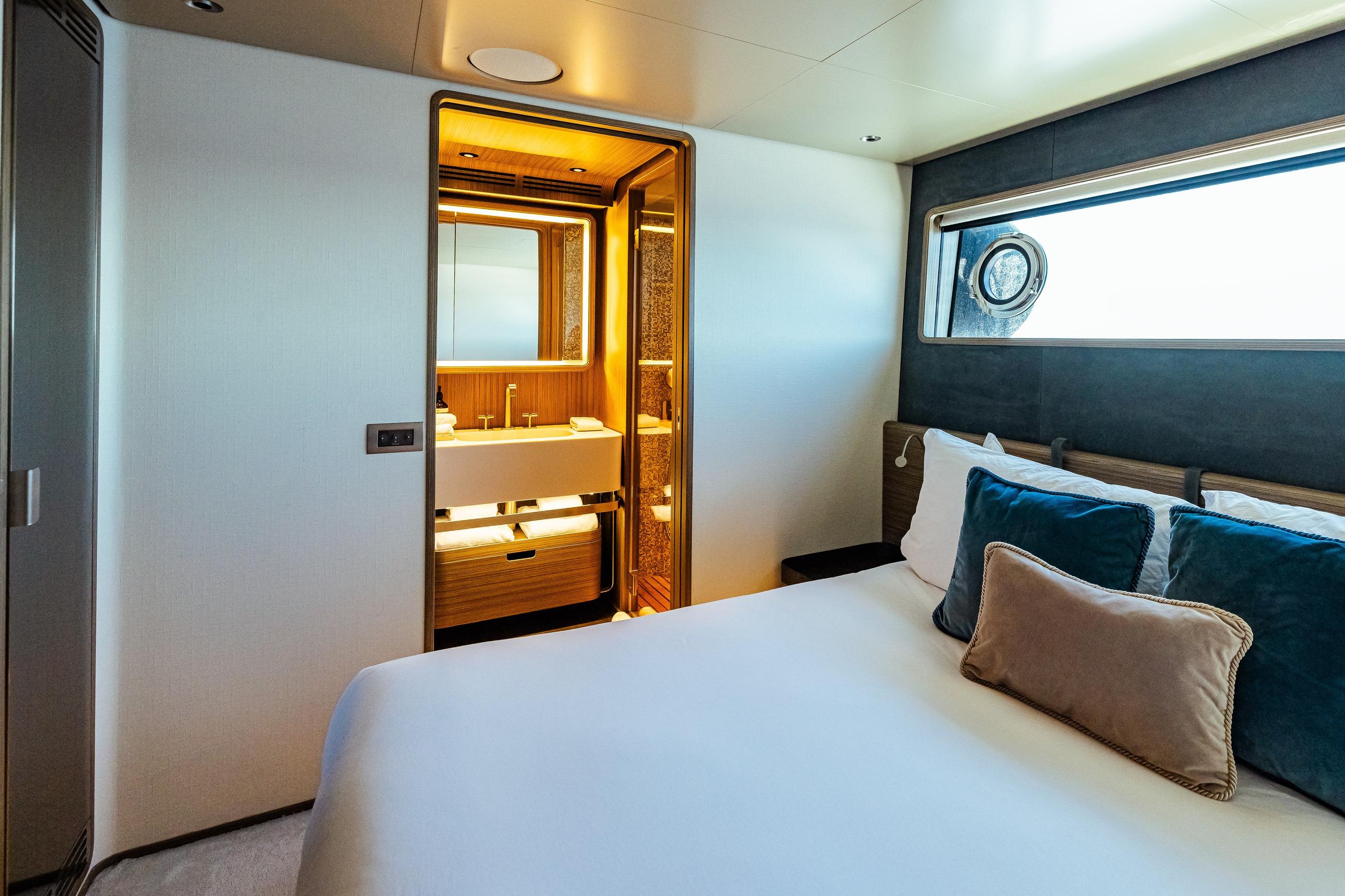 Up to 11 guests are comfortably accommodated in 5 en-suite staterooms on board this CUSTOM LINE NAVETTA 30 for sale, comprising an on-deck master suite, 2 VIPs and 2 doubles on the lower deck (these 2 cabins present flexible accommodation solutions with sliding beds and additional Pullman). The yacht also has accommodation for 5 crew members.
