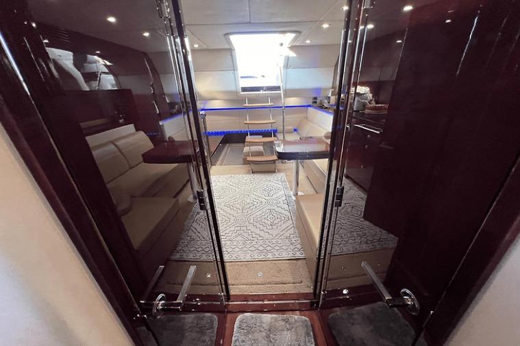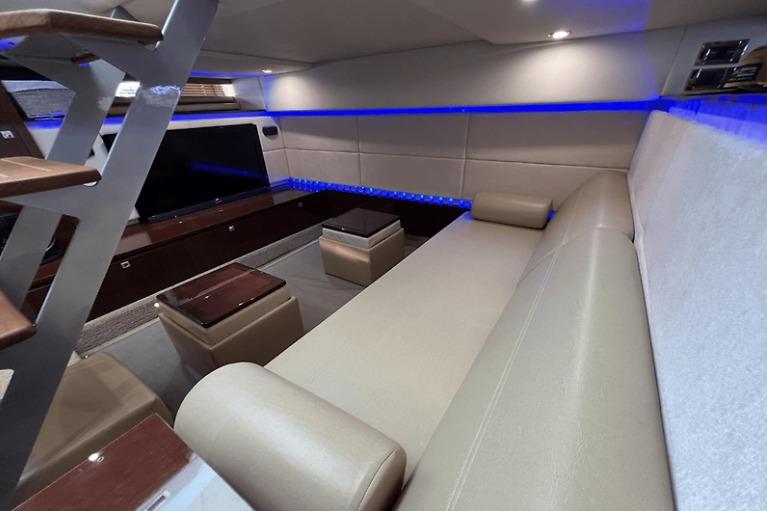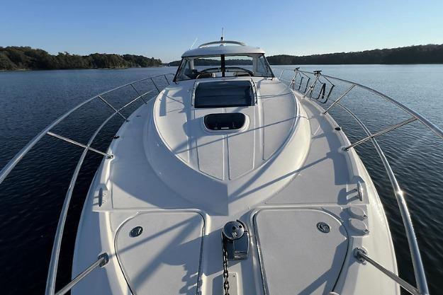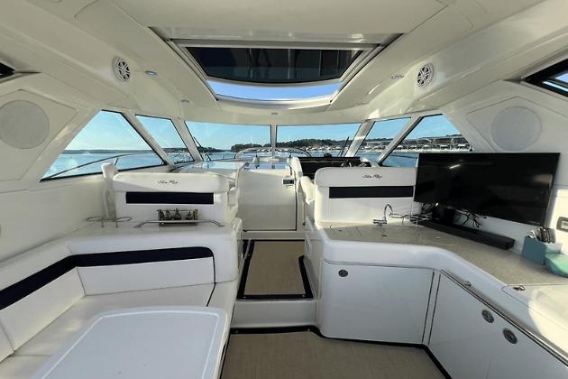 The 450 Sundancer advances Sea Ray's tradition of forward thinking with innovative and trend-setting features like its standard Axius propulsion system with joystick control, a fiberglass hardtop with retractable sunroof, a cockpit entertainment center with optional grill and TV, and a designated "media room" in the cabin. Add all these things together, and you could have the most adaptable, user-friendly express cruiser on the water.Starting topside, the 450 builds upon the versatility of its Sundancer siblings with a seamless hardtop and bonded-in windshield that provide unsurpassed climate control thanks to a forward vent, sunroof, and optional cockpit air conditioning/heating. The benefit is comfortable boating in all kinds of weather. Two, doublewide benches with flip-up bolsters and armrests serve the helm and port console. The helm itself comes with a full complement of driving and navigation aids to make operation easier than ever, from the SmartCraft VesselView display, to the Axius or Zeus joystick control, to the amazing Skyhook station-keeping feature. .Leisure possibilities abound at the large, U-shaped cockpit lounge with removable table. The aft-most backrest of this seat is split, and the two sections pivot open to create an extension of the sun pad, which has abundant storage below for lines, fenders, and other necessary items. On the starboard side of the cockpit, a big, L-shaped wet bar with icemaker will keep everyone hydrated, and owners can choose to add an optional grill, refrigerator, and removable 19" flatscreen TV to create an "outdoor galley" atmosphere. Under the sleek exterior of the 450 lies a classic-contemporary interior, with top-of-the-line cabinetry from Sea Ray's Cape Canaveral Woodworking and Finishing Facility, Ultraleather seating, brushed chrome accents, and optional wood floors. Ambient light from the oversized hull windows and skylight gives a natural glow to the earthy materials used in the cabin.The forward stateroom features a full-size island V-berth with memory foam mattress and electric extension and Posturepedic backrest, plus a Shoji-style sliding door and separate head and shower compartments with tile floors. The main cabin houses a spacious galley with stainless-steel appliances and loads of storage along the port side; to starboard, a dining area with folding table easily coverts to a sleeper. The Sony stereo located here comes fully outfitted with an iPod docking station, CD player, Sirius satellite receiver, amplifier, subwoofer, and more.At the heart of its entertainment-ready interior, the 450 features a unique media room abaft the salon that comes complete with theater seats, accent lights, and an entertainment system boasting a gaming system port, MP3 port, DVD player, and a 32-inch TV. If it's true surround-sound feel you're looking for and a large-screen experience, select the optional entertainment package that offers the Bose 3-2-1 System and 37-inch flatscreen. Those two options will surely keep any child or adult happy. A pair of ottomans serve double duty. These ottomans not only have storage inside, but the tops are reversible - one side has a wooden tabletop; the other is cushioned. You can either place your drinks and snacks on the table side, or flip it over and throw up your feet and relax! (There are also hanging lockers to port and starboard, as well as a storage cabinet). The theater seats convert to a double berth by way of their slide-out base, and a curtain provides nighttime privacy.