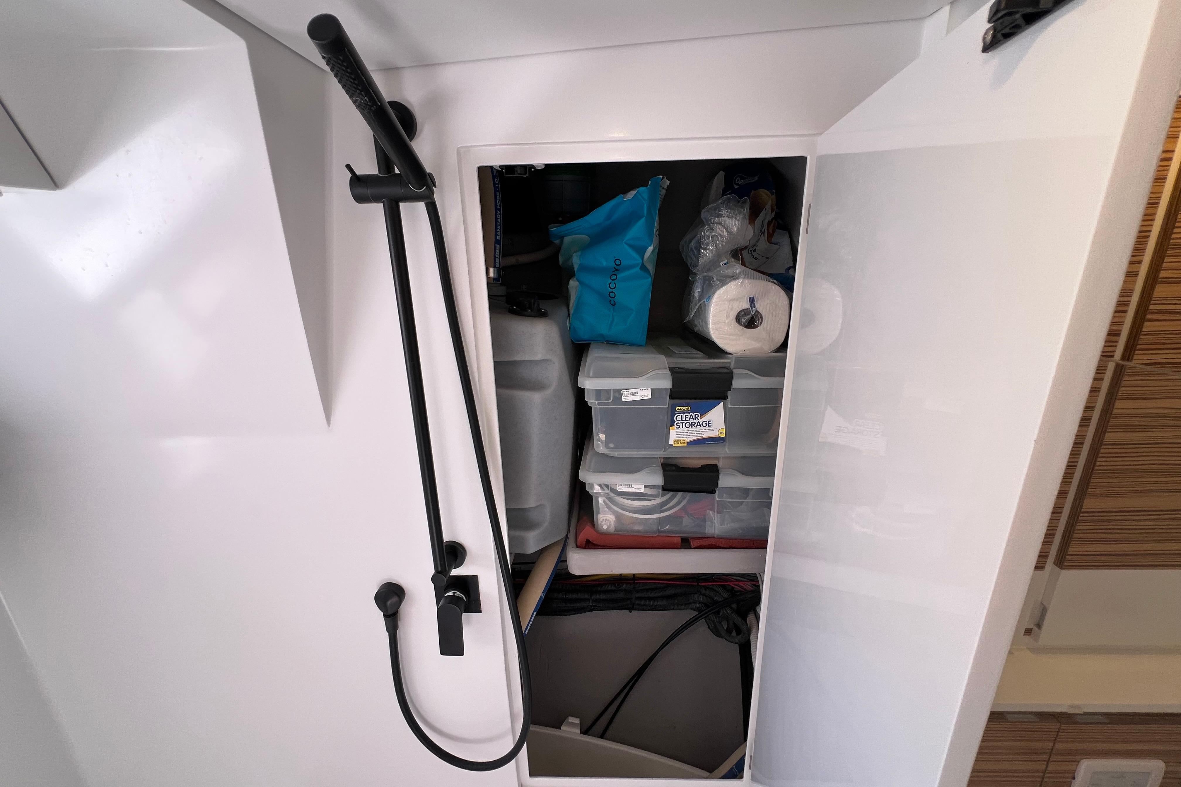- Forepeak locker shelving and hard spots for attachment of hanging rails custom organizers