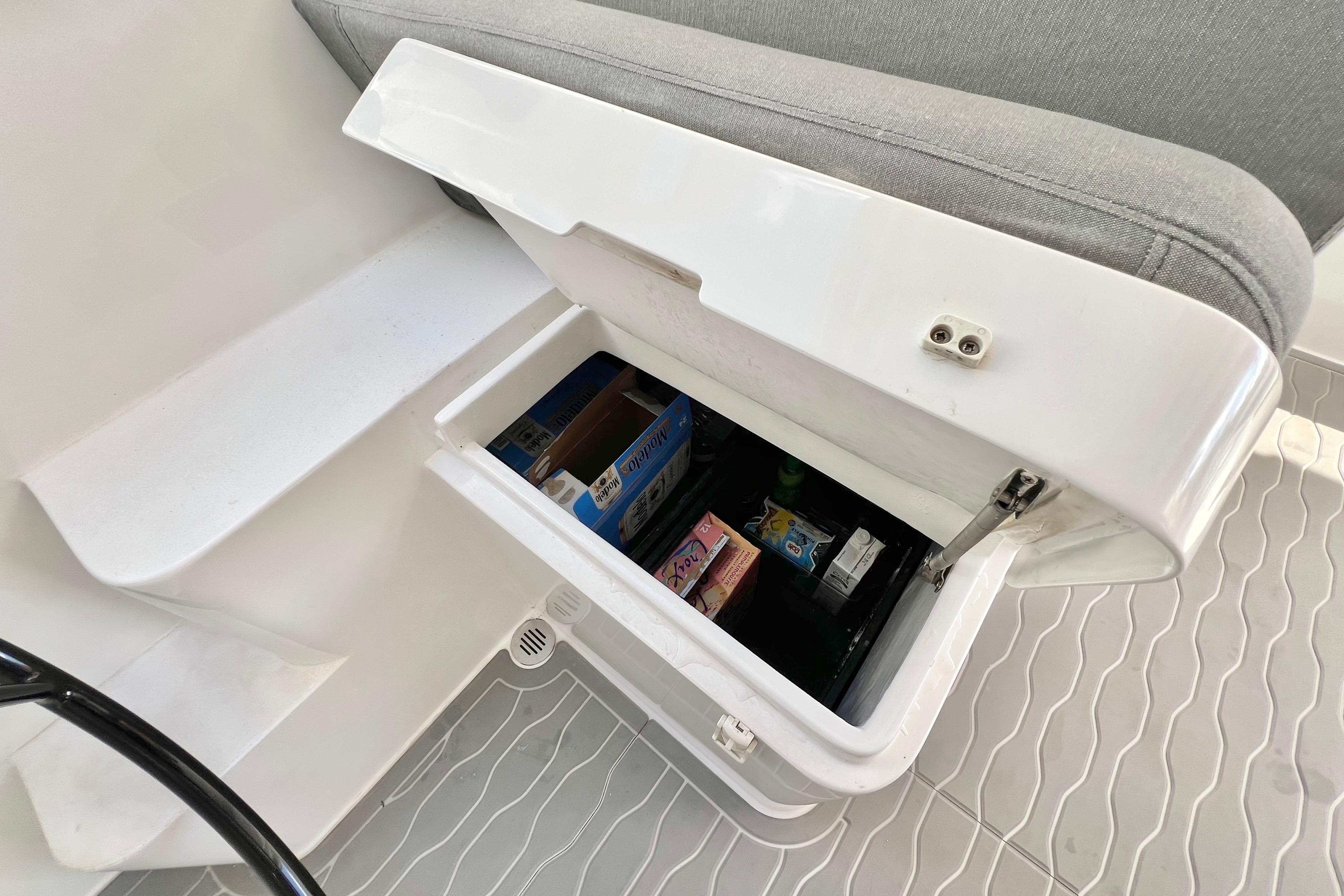 - Large Chest-style fridge under Cockpit helm seat – Vitrifrigo cold plates and thermostat / compressor