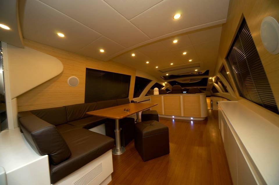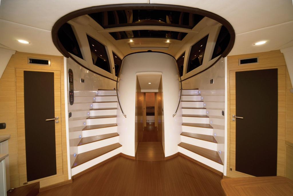 The zenithal light illuminates from the large windshield the galley below, and from the glazed broadside - for the first time in "shatterproof Lexan" - one can fully enjoy the sea and its coastline. The futuristic lines of a performance boat are contrasted by the safety of the wide "walk around" and the child-proof handrail.