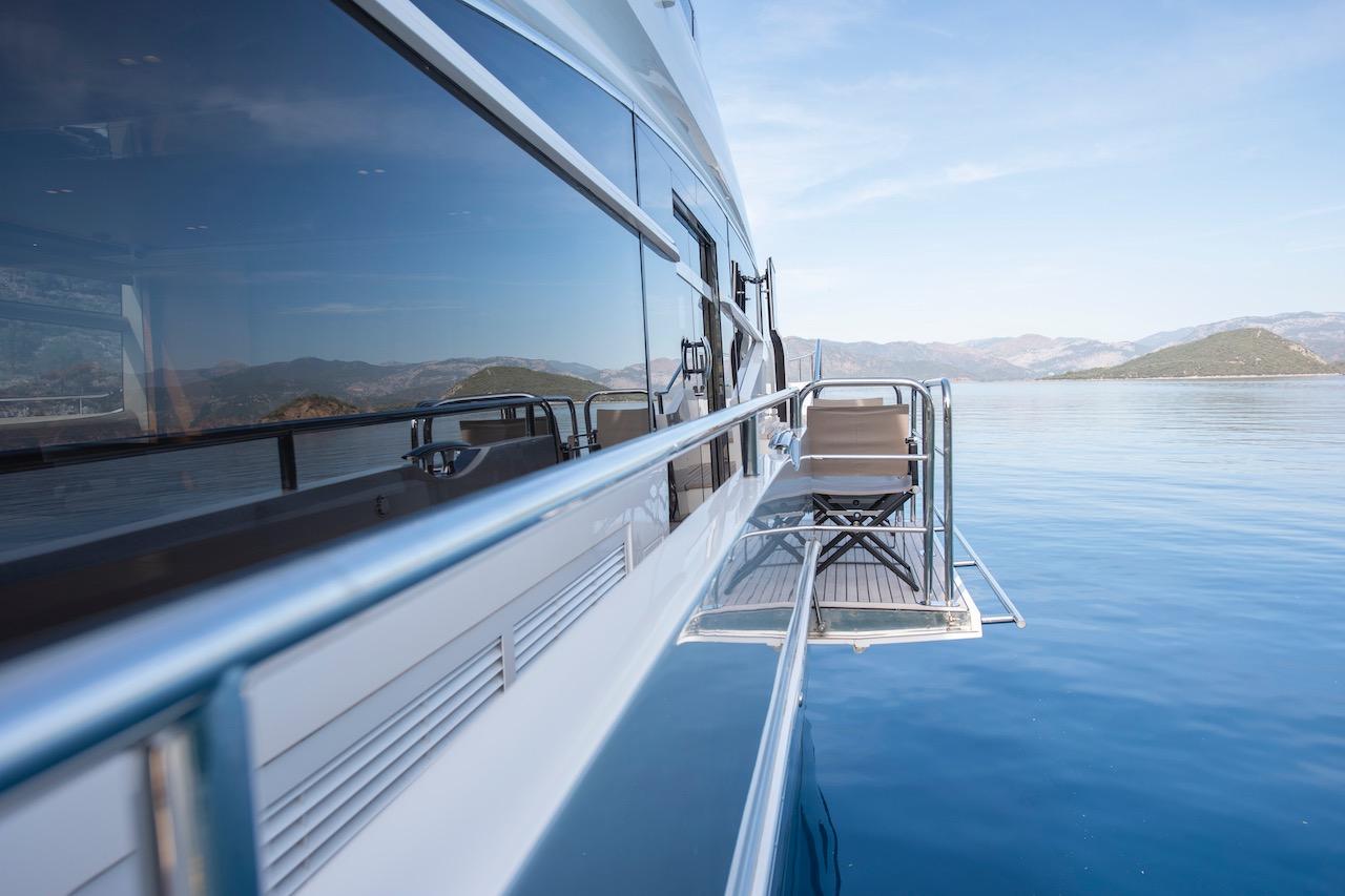 - Twin transom gates leading to bathing platform with electrohydraulic raise/lower mechanism, foldaway swimming ladder, hot and cold shower