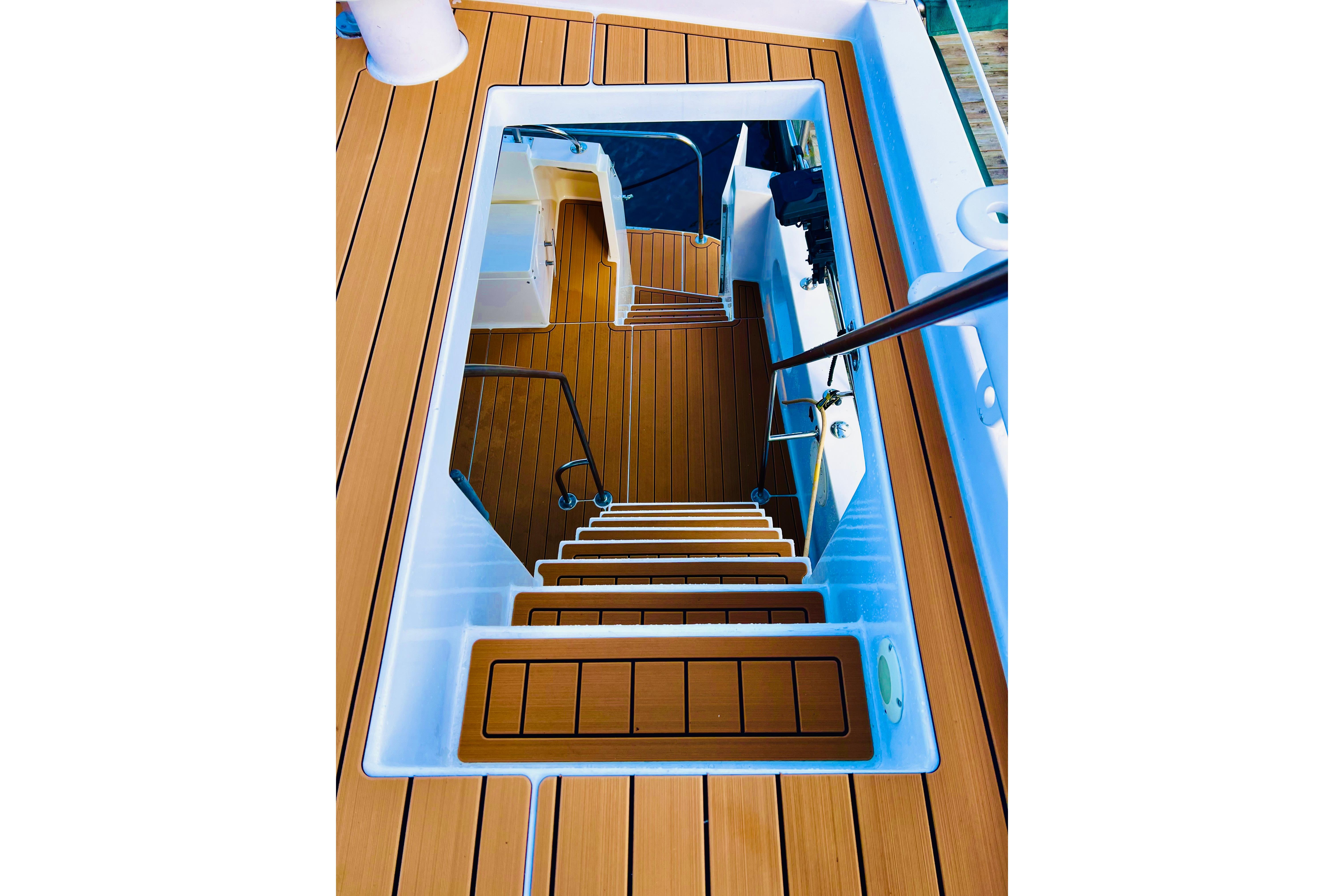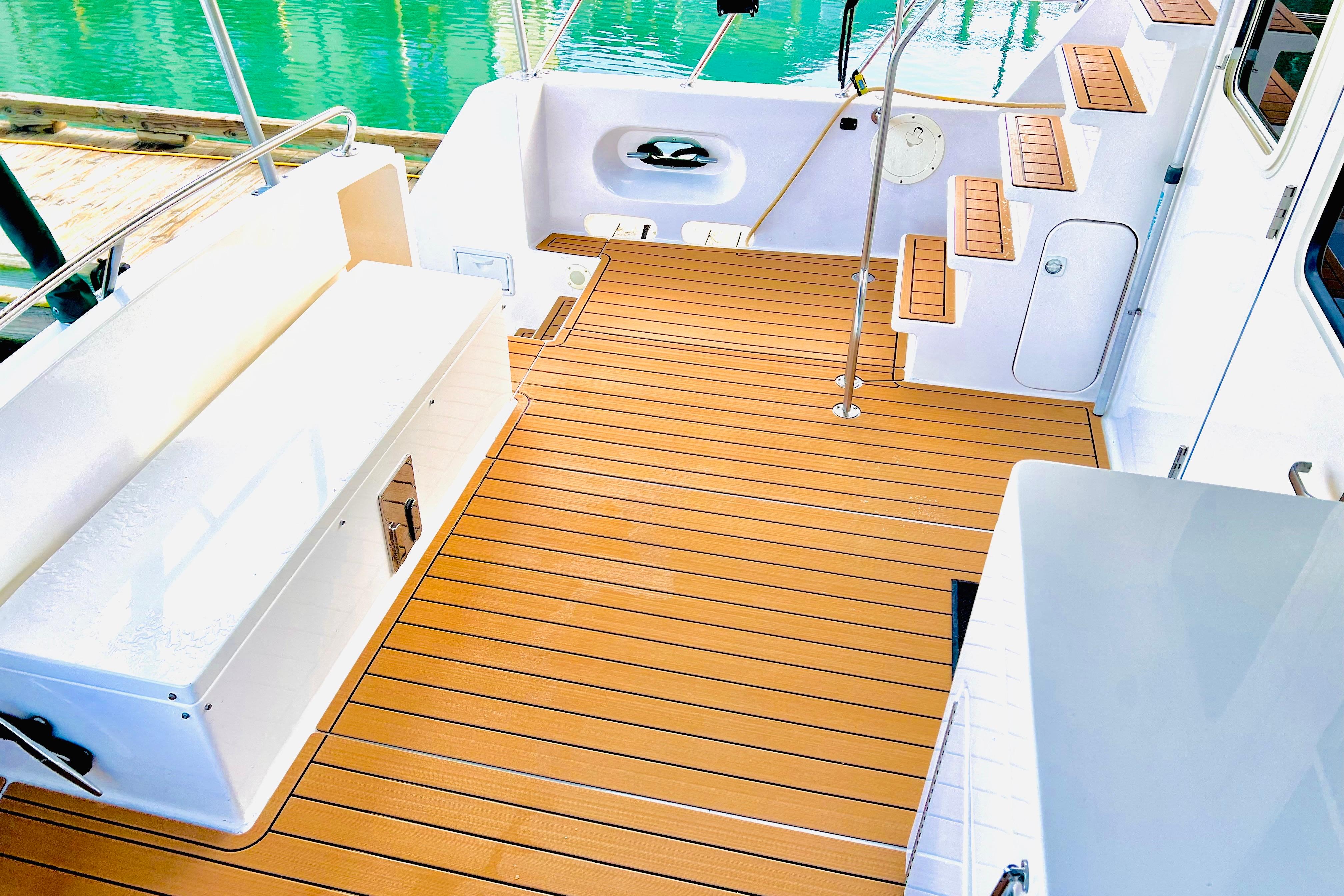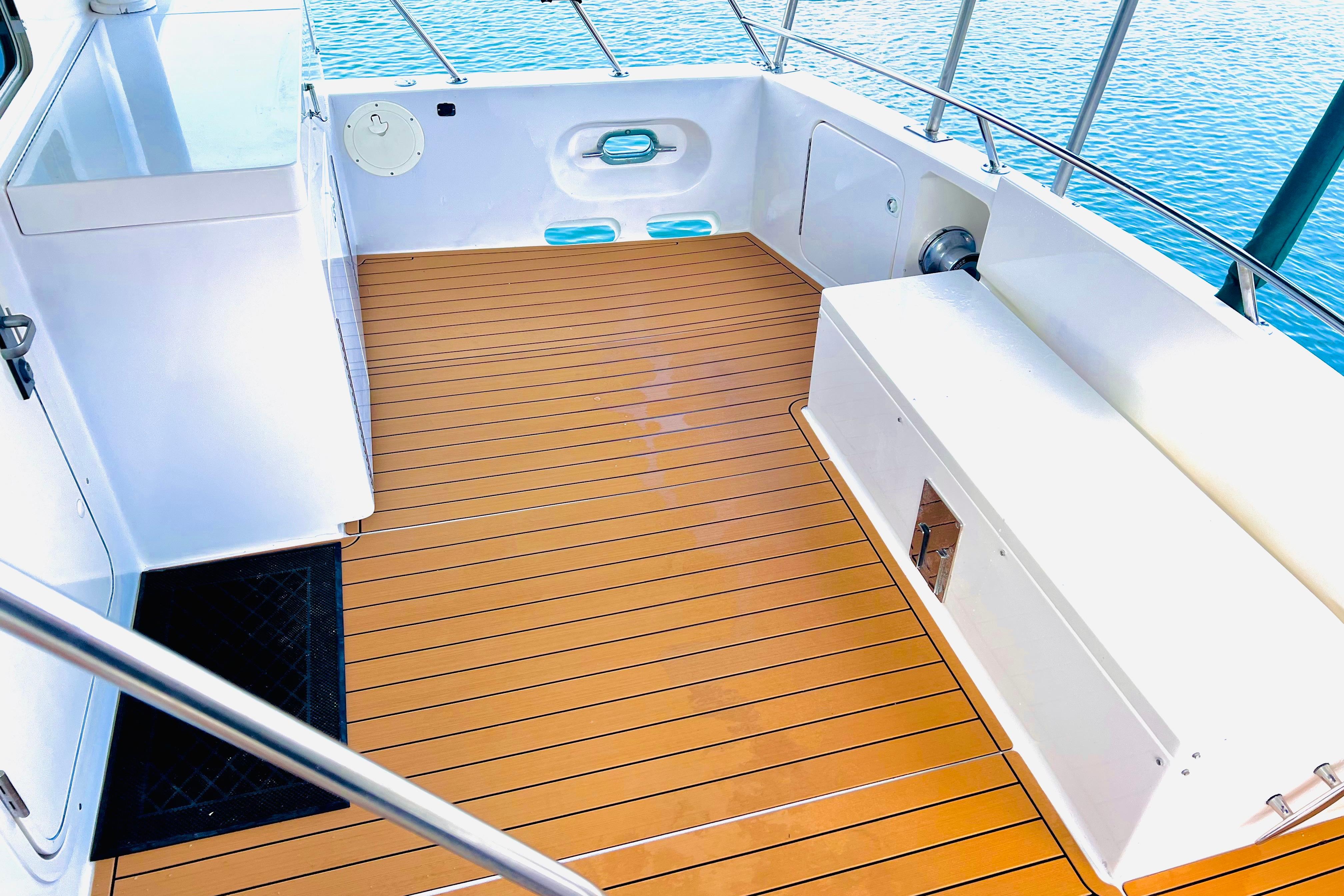 - Large boat deck aft of the flybridge that accepts the 12’ tender.