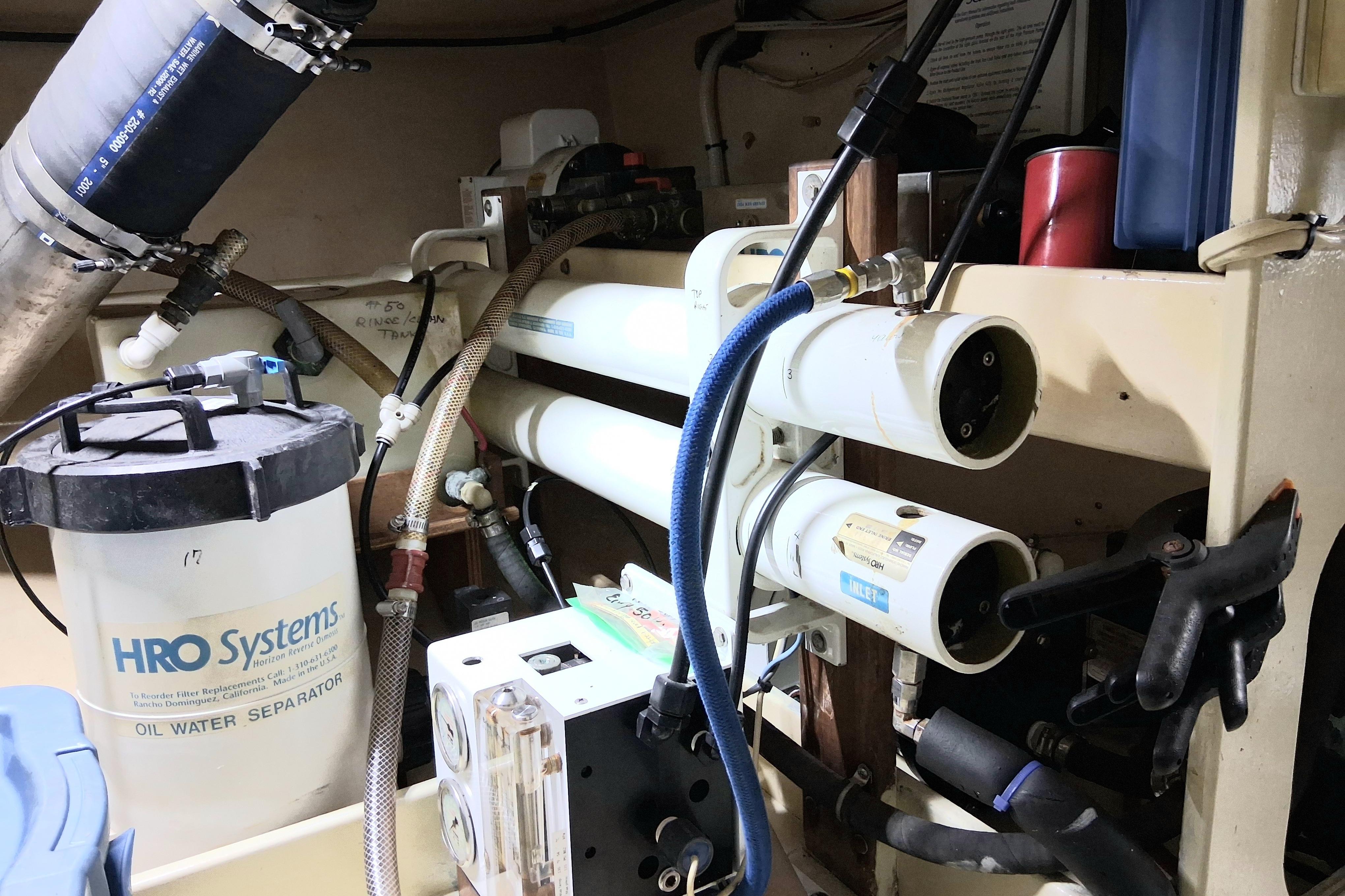 Walk-in stand up engine/systems room; extensive heavy duty hydraulic ships systems includes stabilizers, lift crane and bow & stern thrusters with redundant power takeoff from main engine and generator; hydraulic auxiliary (homer) drive w/separate shaft/prop from generator.