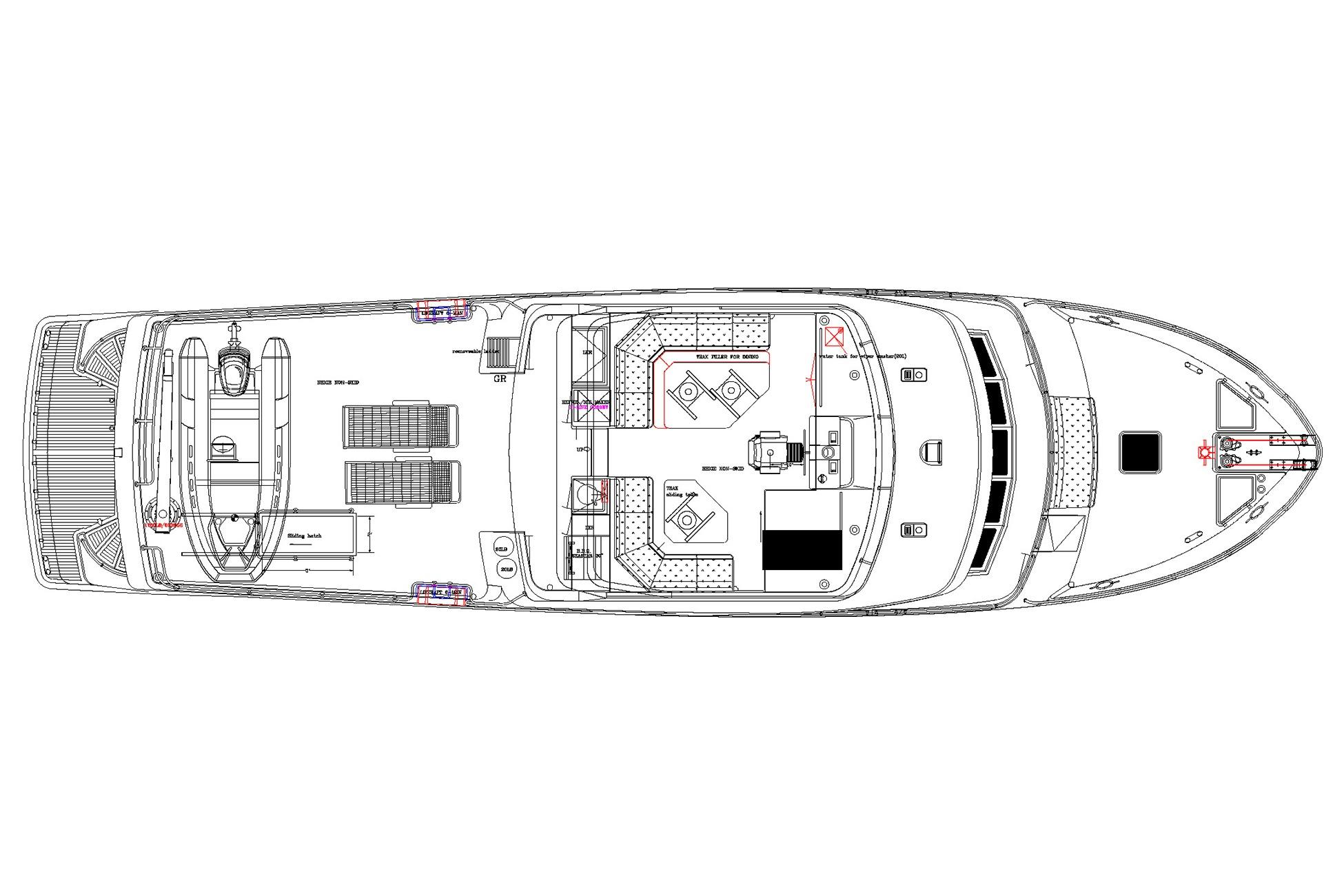 - Wash down outlets for fresh water on fore deck, aft deck and flybridge