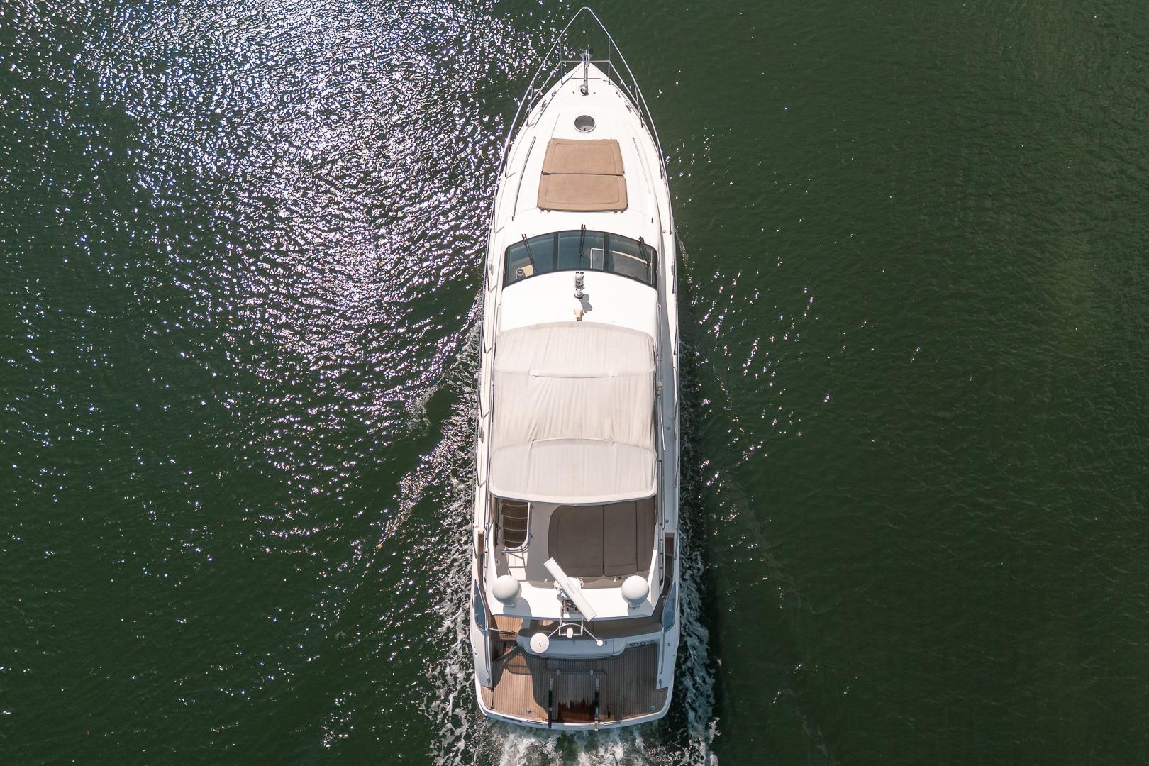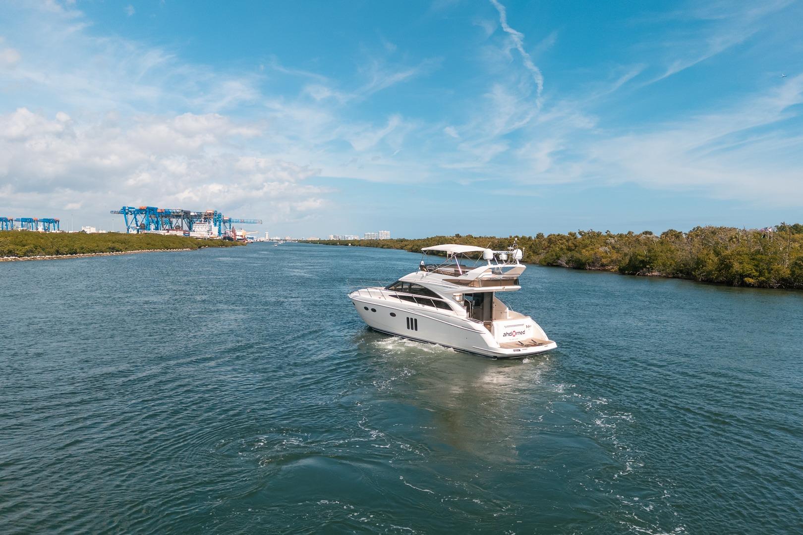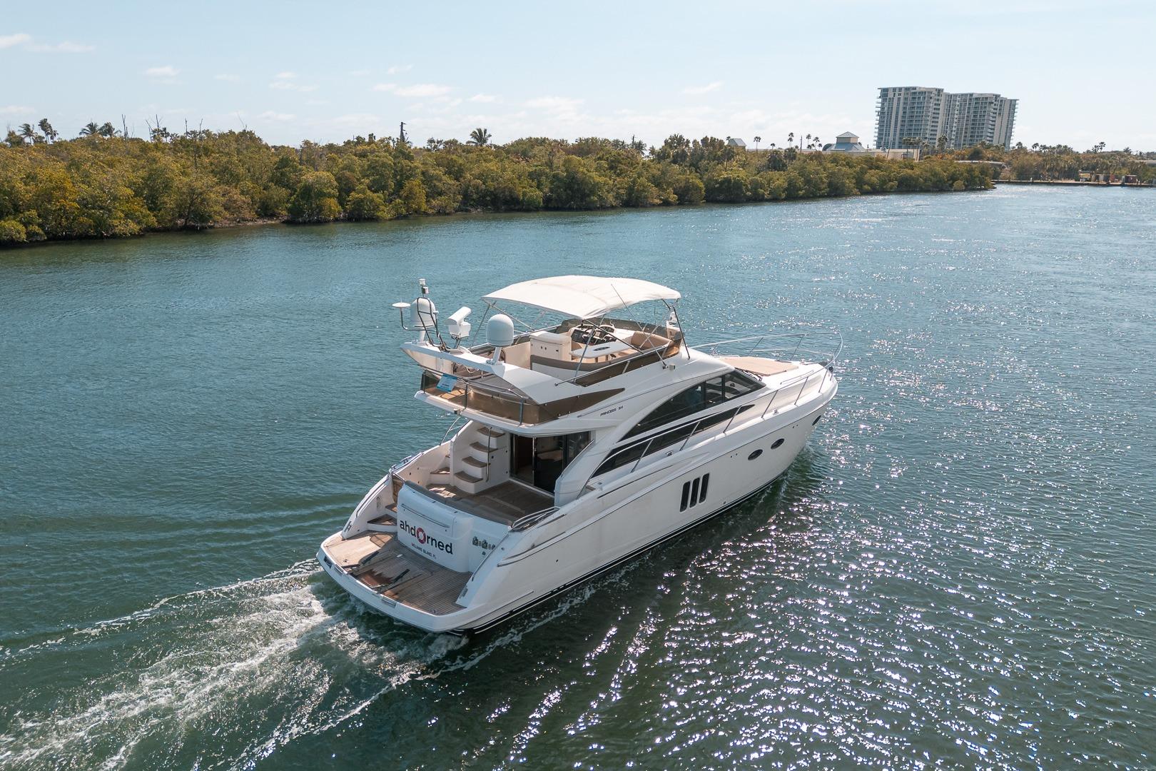 AHDORNED is a 2009 Viking-Princess Yachts 54 Flybridge powered by twin Volvo D12-800 engines producing 775 horsepower each and propelling her to a top speed of 34 knots. She boasts three staterooms including a full-beam master with ensuite head. AHDORNED has a molded-in swim platform with teak overlay and port transom gate that leads to the cockpit with also teak overlay, bench seating on the transom and freshwater shower to port. Port of the cockpit there are steps that lead up to the flybridge which comes fitted with dual helm seats forward and to port, U-shaped seating with table to starboard, sun pad aft, fiberglass arch aft and Bimini top forward of the arch. Side decks take you to the forward deck with over-sized sun pad. Access to the interior is through the glass sliding doors in the cockpit. Main salon comes equipped with U-shaped leather settee with wood dinette table to starboard and wet bar/entertainment center to port. Forward and to starboard of the main salon is the dual helm seat to starboard and a U-shaped guest seating with table directly across. Center line steps lead down to the galley to port and the guest double bunk cabin to starboard. Forward and to starboard of the guest cabin is a private head and shower. Continuing forward is the forward stateroom. Aft of the galley is the main stateroom with en-suite head/shower to port.