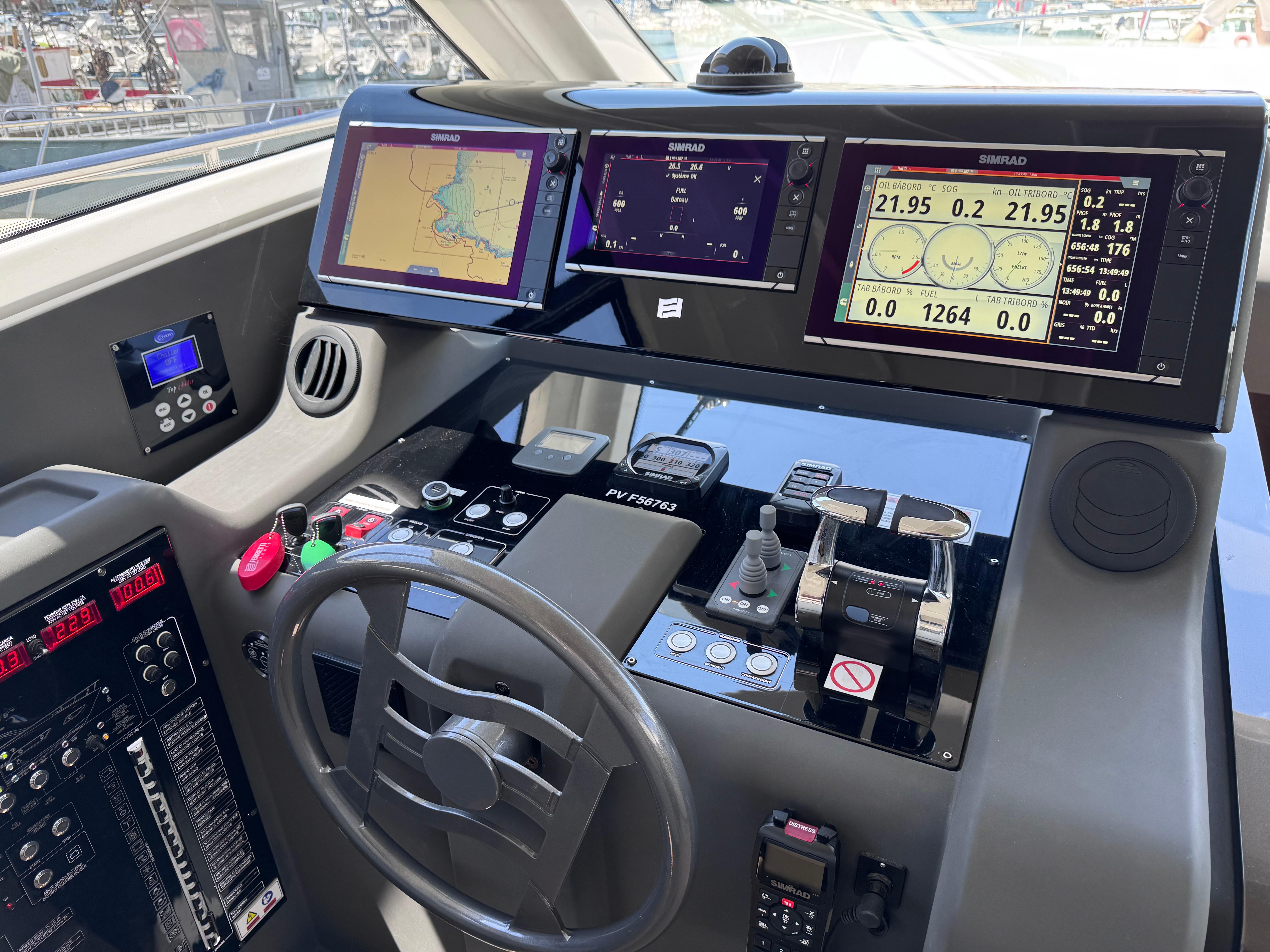 Le salon du pont principal offre une atmosphère conviviale et lumineuse, avec une cuisine ouverte et un poste de pilotage parfaitement intégré, tandis que le pont inférieur abrite trois cabines somptueuses, dont une suite armateur occupant toute la largeur, toutes dotées de salles de bains privatives et d’ouvertures panoramiques sur la mer.