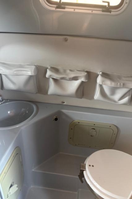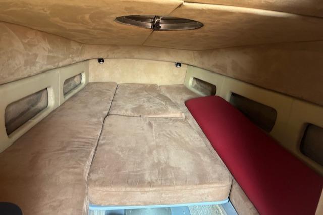 At the front centre of the cockpit there is the door that leads to the forward cabin. Spacious and comfortable it is fitted with a V shaped berth and a table that lifts and lowers on a steel structure. A separate bathroom with sink, toilet and shower is fitted on the right just after the entrance, and opposite is the small kitchen with fridge, sink and electric oven.