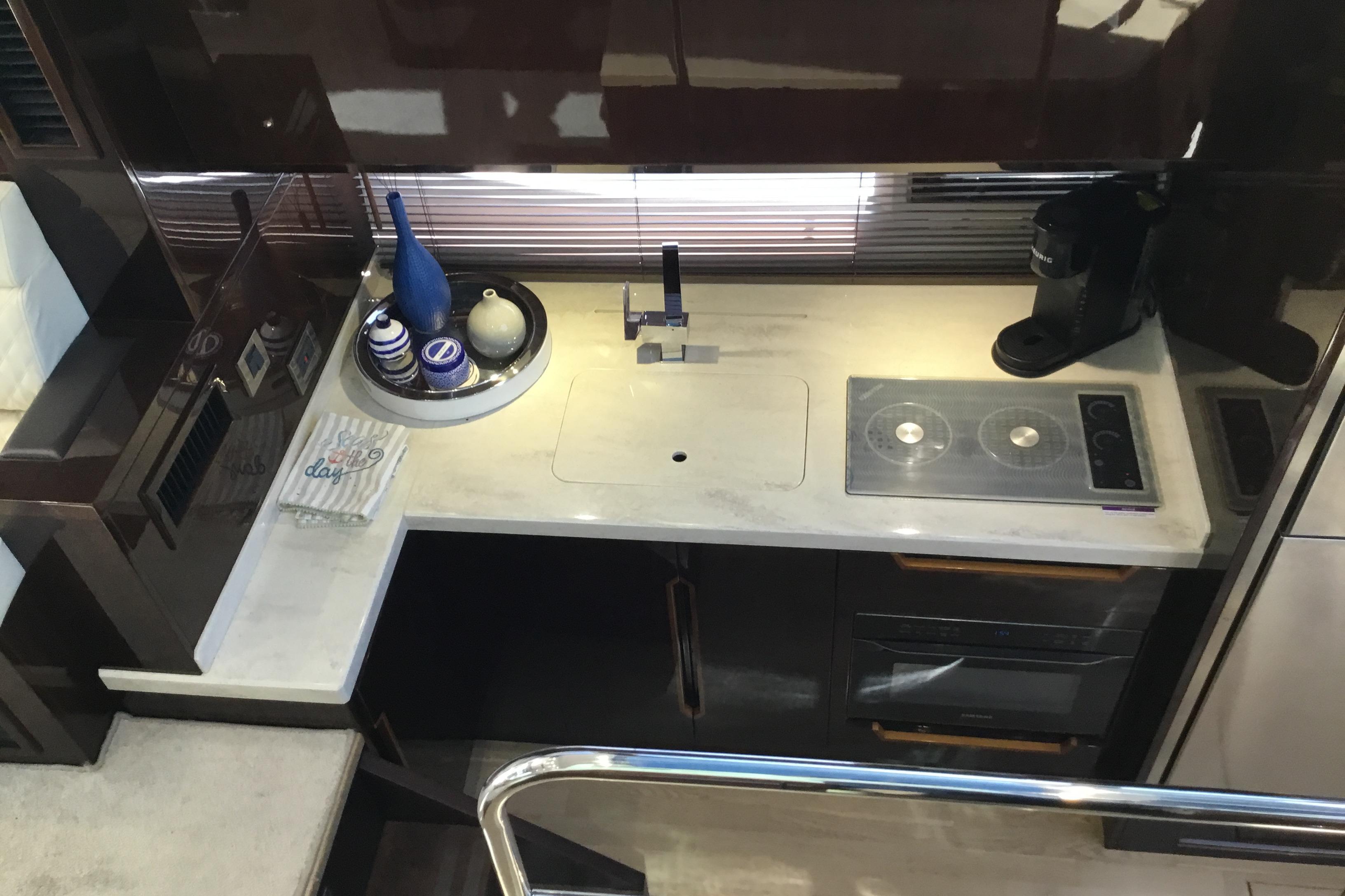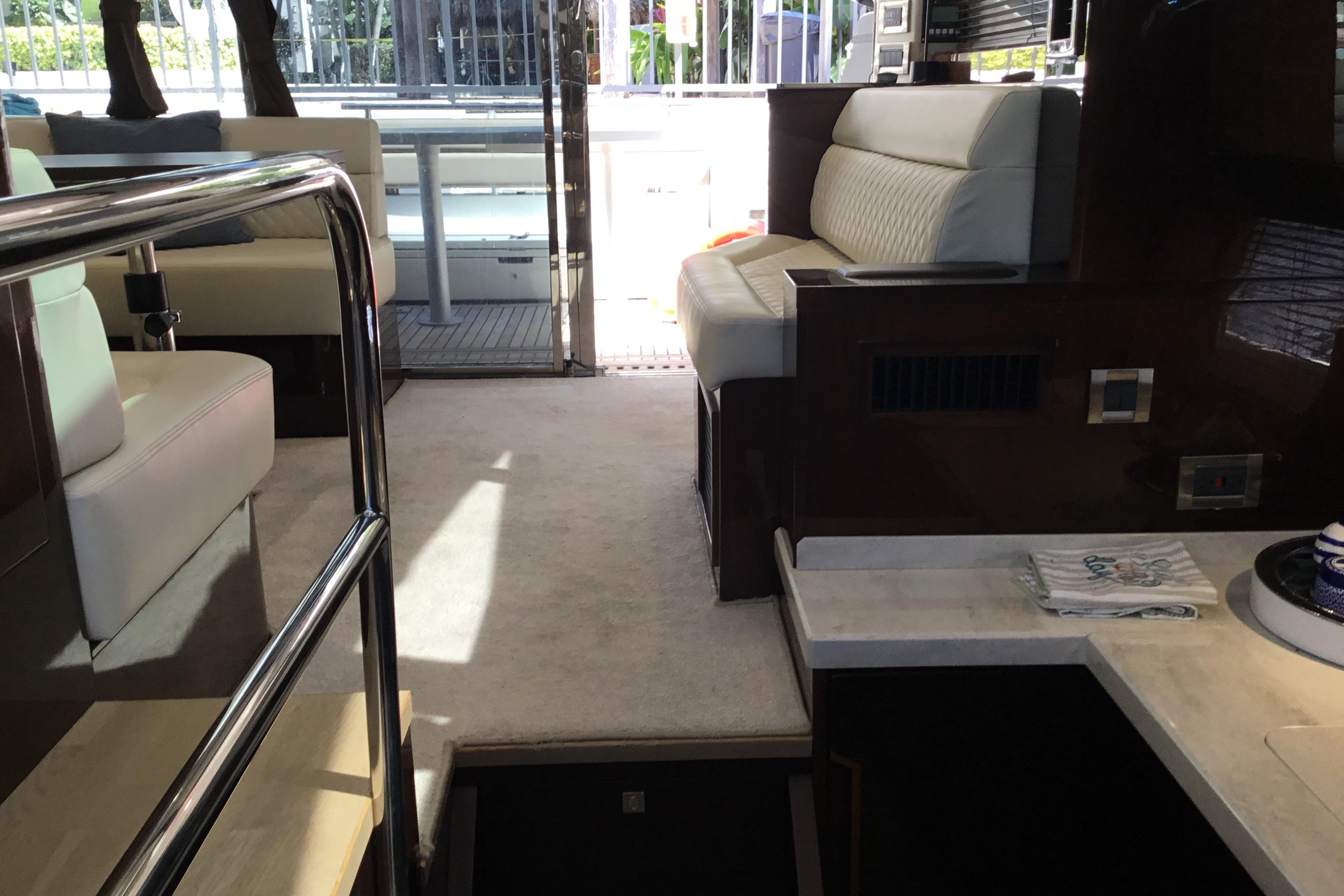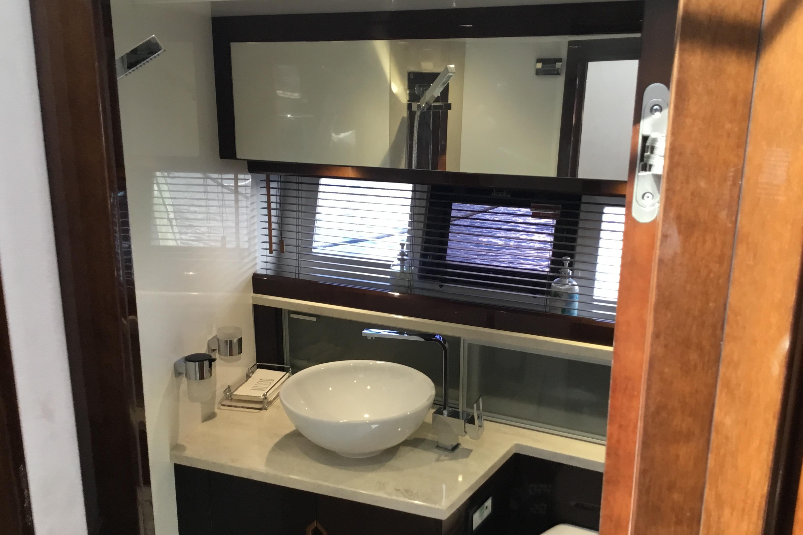 Notice the single sliding, glass panel over the cockpit area as well as the patio doors granting easy access to the saloon. The aft-facing loungers will slide when needed, creating either a great dining or leisure area at the stern. The main deck boasts plenty of space and features a dining table, sitting areas, a well-equipped helmsman’s station and a galley.