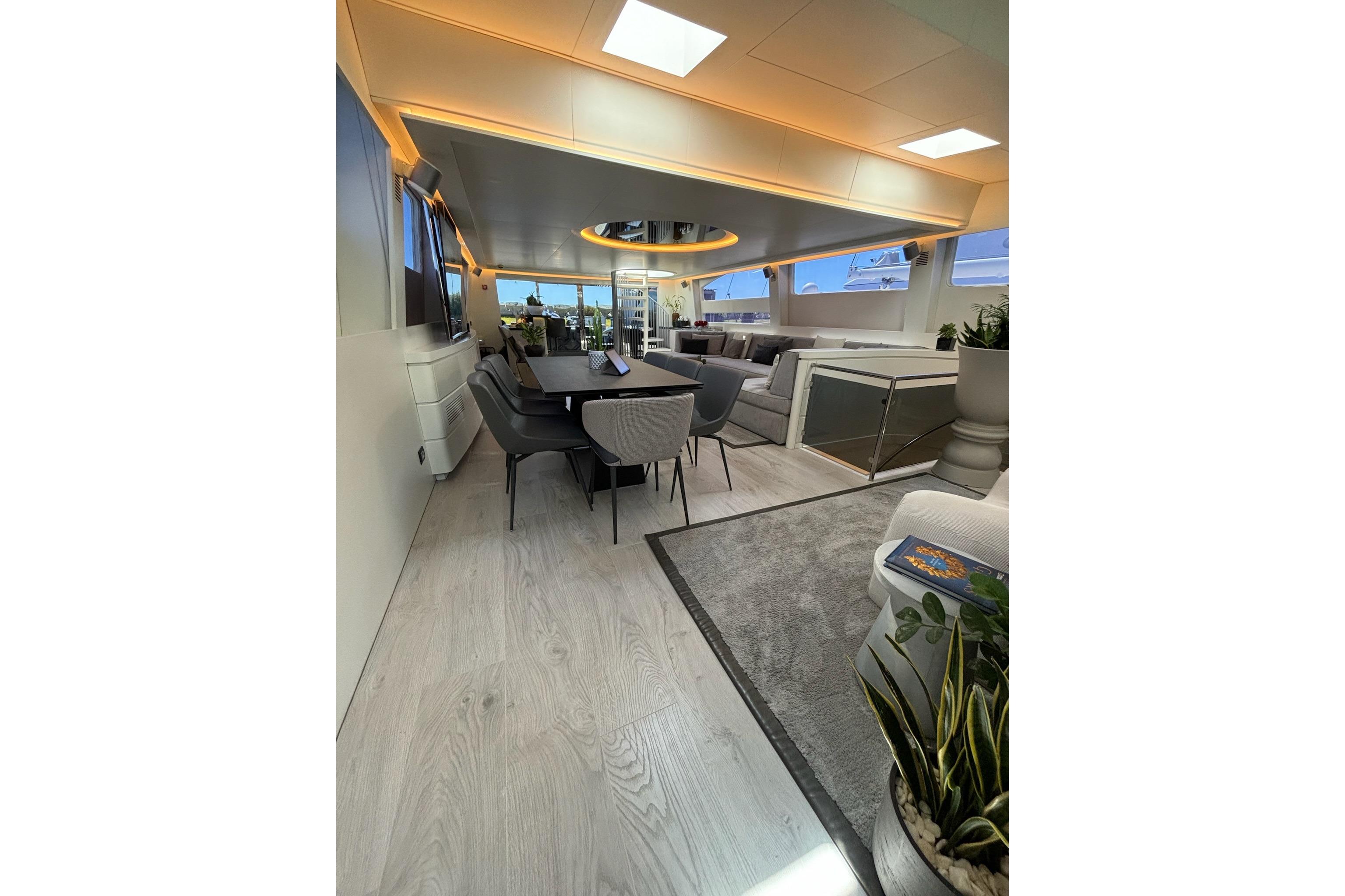Inside, Eva feels bright and modern. The main saloon has been updated with new flooring and now includes a custom bar equipped with an ice maker and fridge. Her dining area and salon were restyled with high-end furnishings and improved natural lighting, providing a functional and welcoming space.