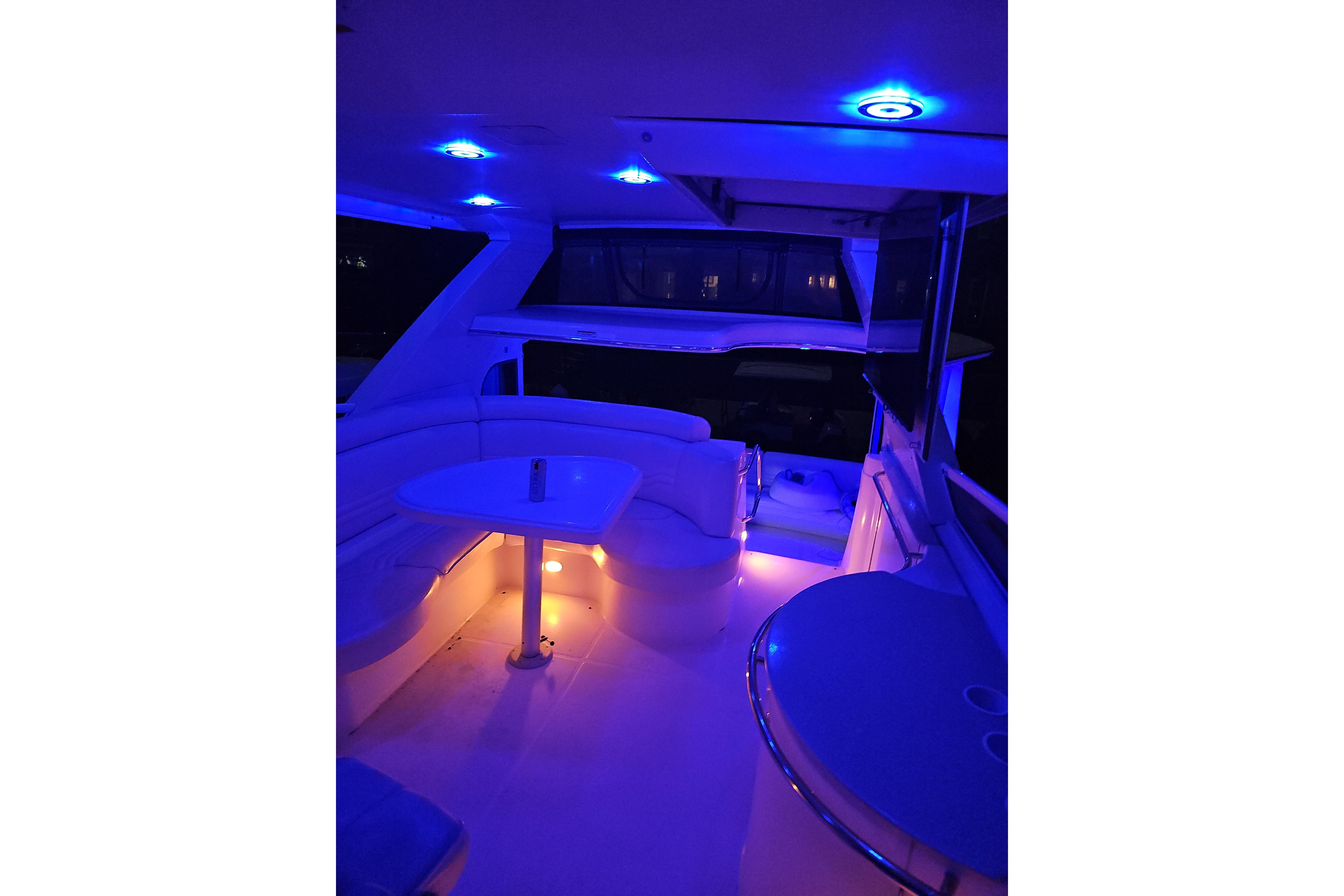 As a bonus, the owner installed a custom drop down flat screen TV mount on the flybridge. You can cruise in comfort on the spacious seating and watch the game on the 50" TV via the KVH Tracvision satellite antenna!