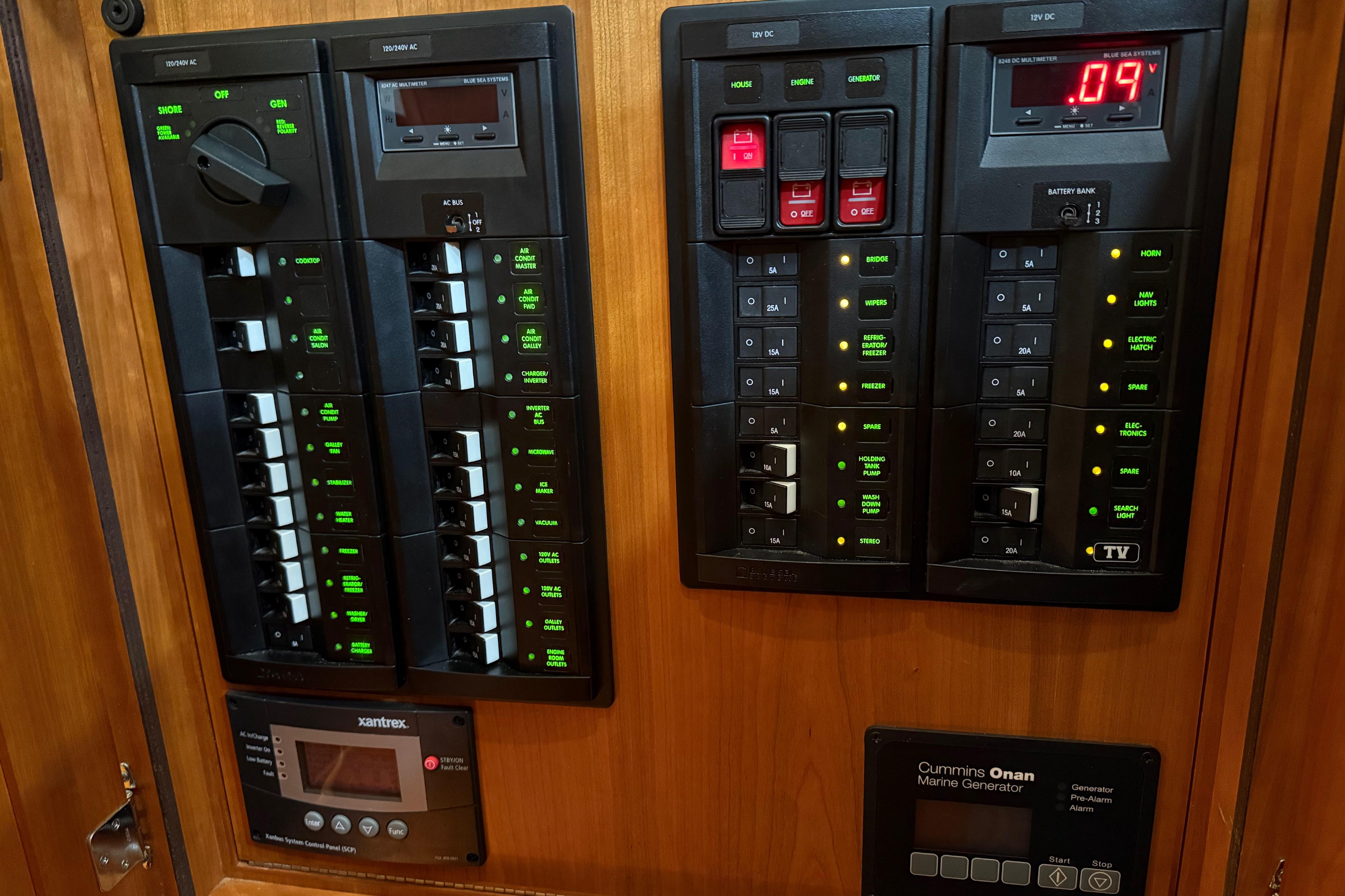 - Command Center: Forward, a double-wide companion seat to port and a well-appointed helm station to starboard with two Stidd chairs and direct access to the side deck via the helm door.