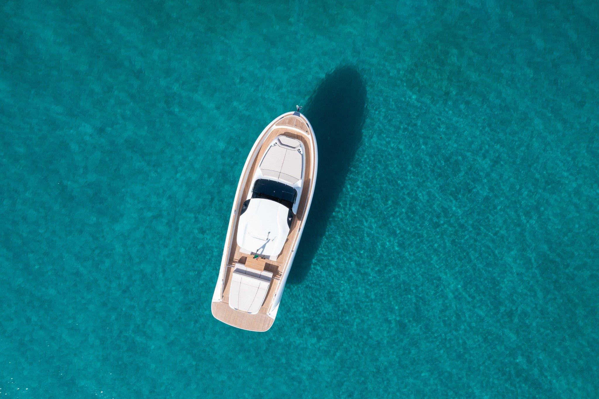 Lo scafo bianco, pulito e senza tempo, esalta le linee tese e bilanciate del modello, mentre il layout open assicura una vivibilità sorprendente, grazie a spazi studiati con attenzione al dettaglio e soluzioni tecniche d’avanguardia. La coperta rivestita in teak con comento grigio, il T-Top rigido, le terrazze laterali abbattibili, e il tenderlift idraulico trasformano il pozzetto in un salotto sul mare, dove funzionalità e stile convivono in perfetto equilibrio.