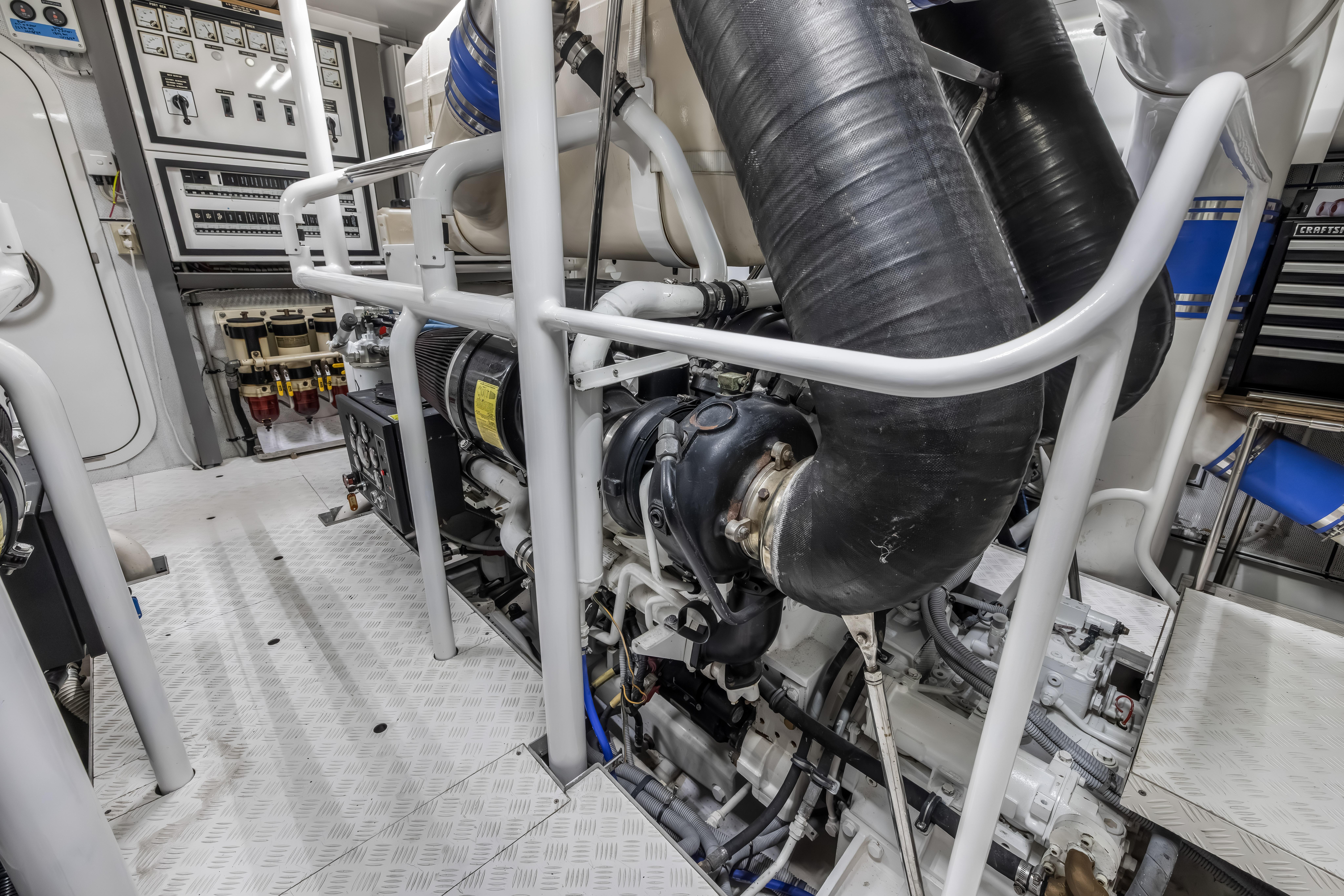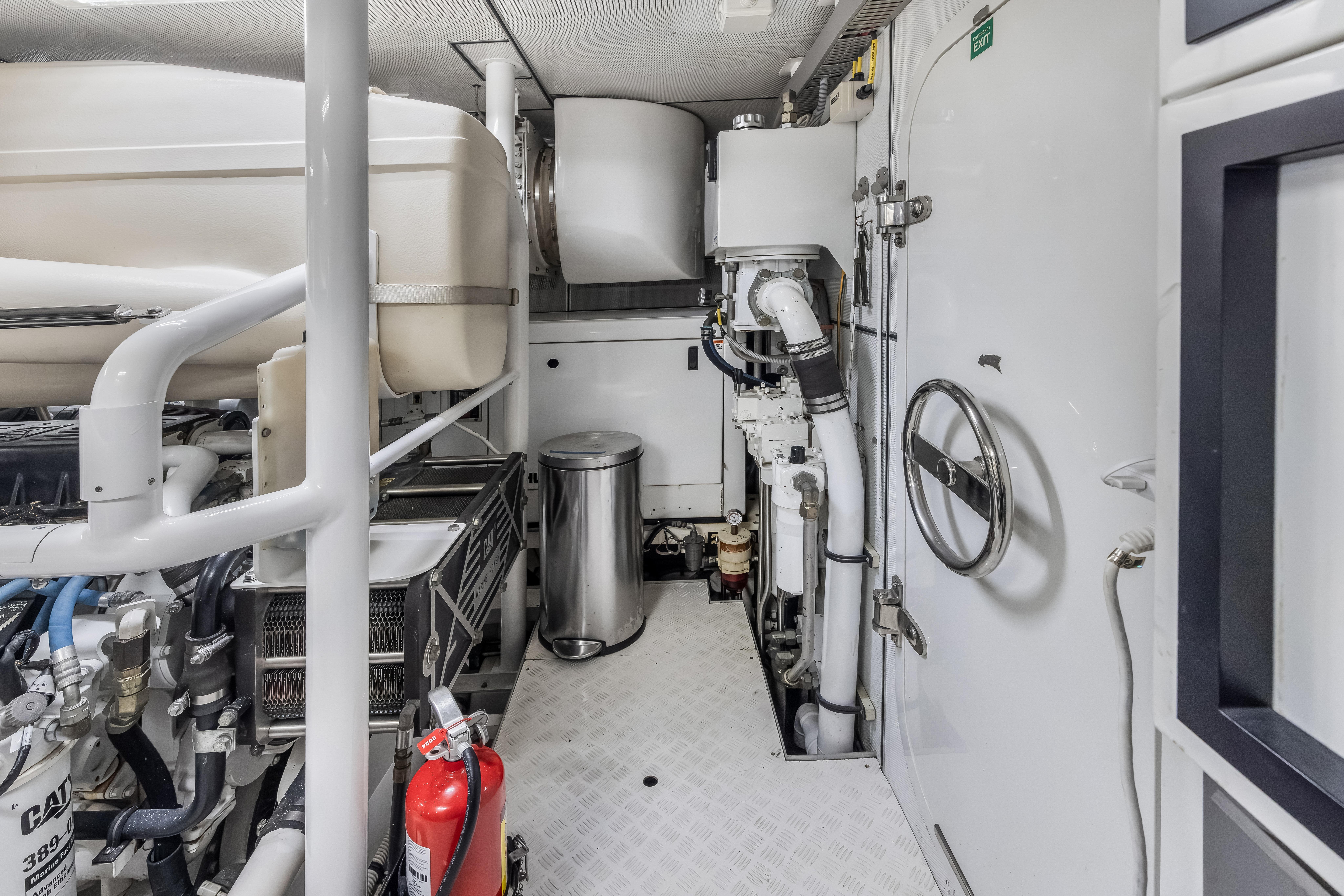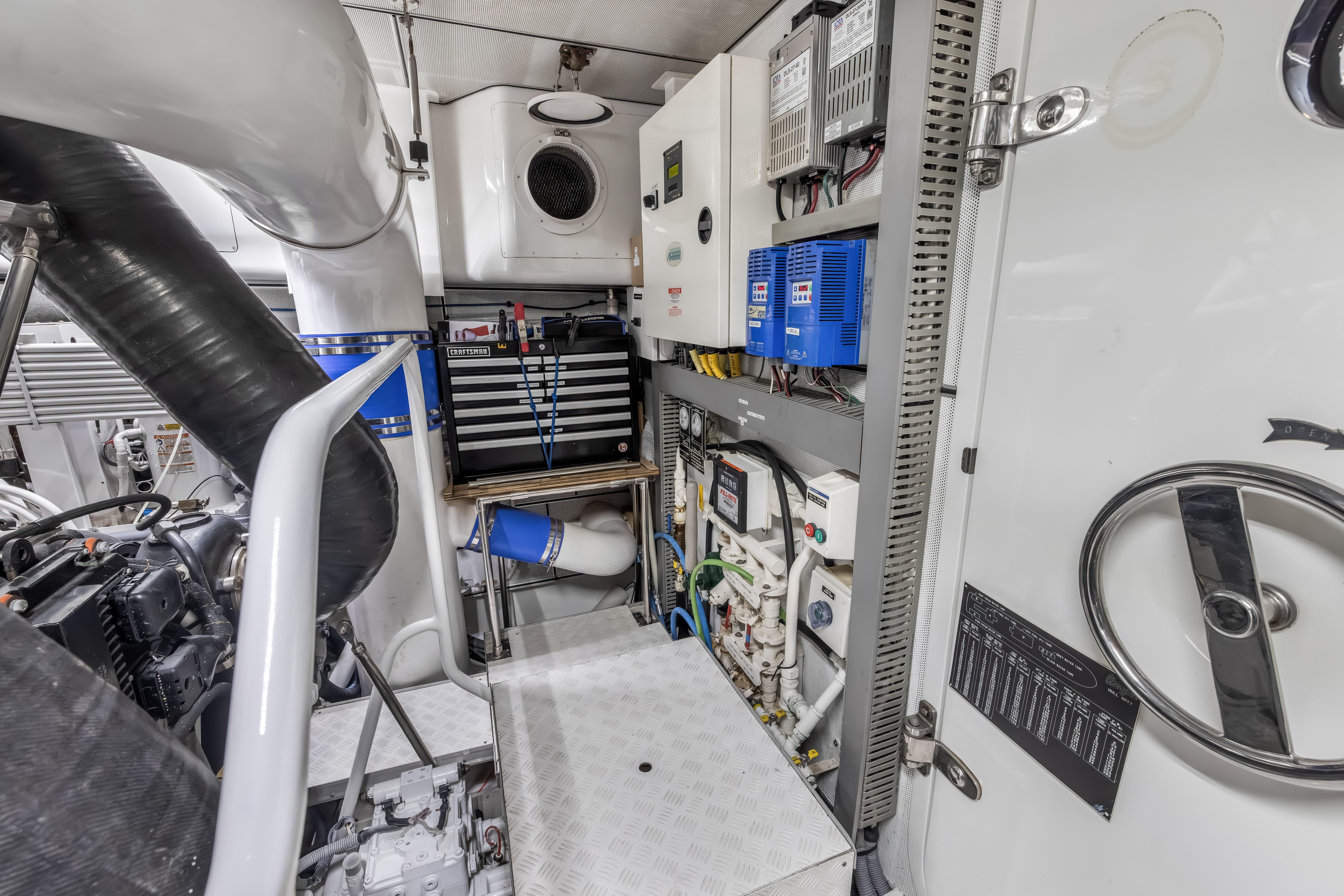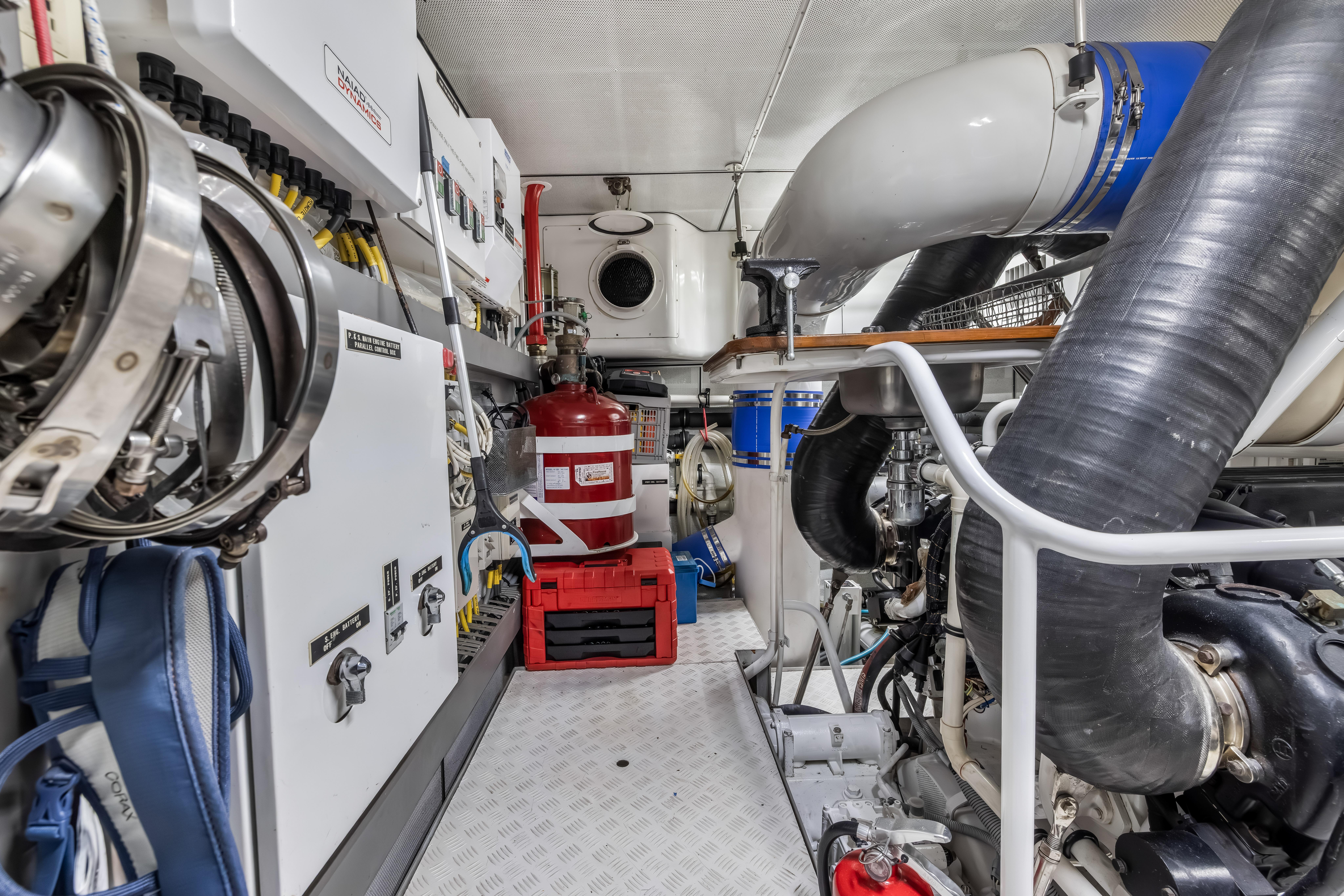 The crew quarters and engine room are accessed via a center-line transom door in the cockpit. From there, you first enter the crew area with one stateroom to port (2 berths) and another to stbd (full berth). Further forward is the engine room maintained to A-1 yacht quality standards and featuring twin Caterpillar C-32 Acert engines, twin 32kw Kohler generators and many more "big yacht" options.