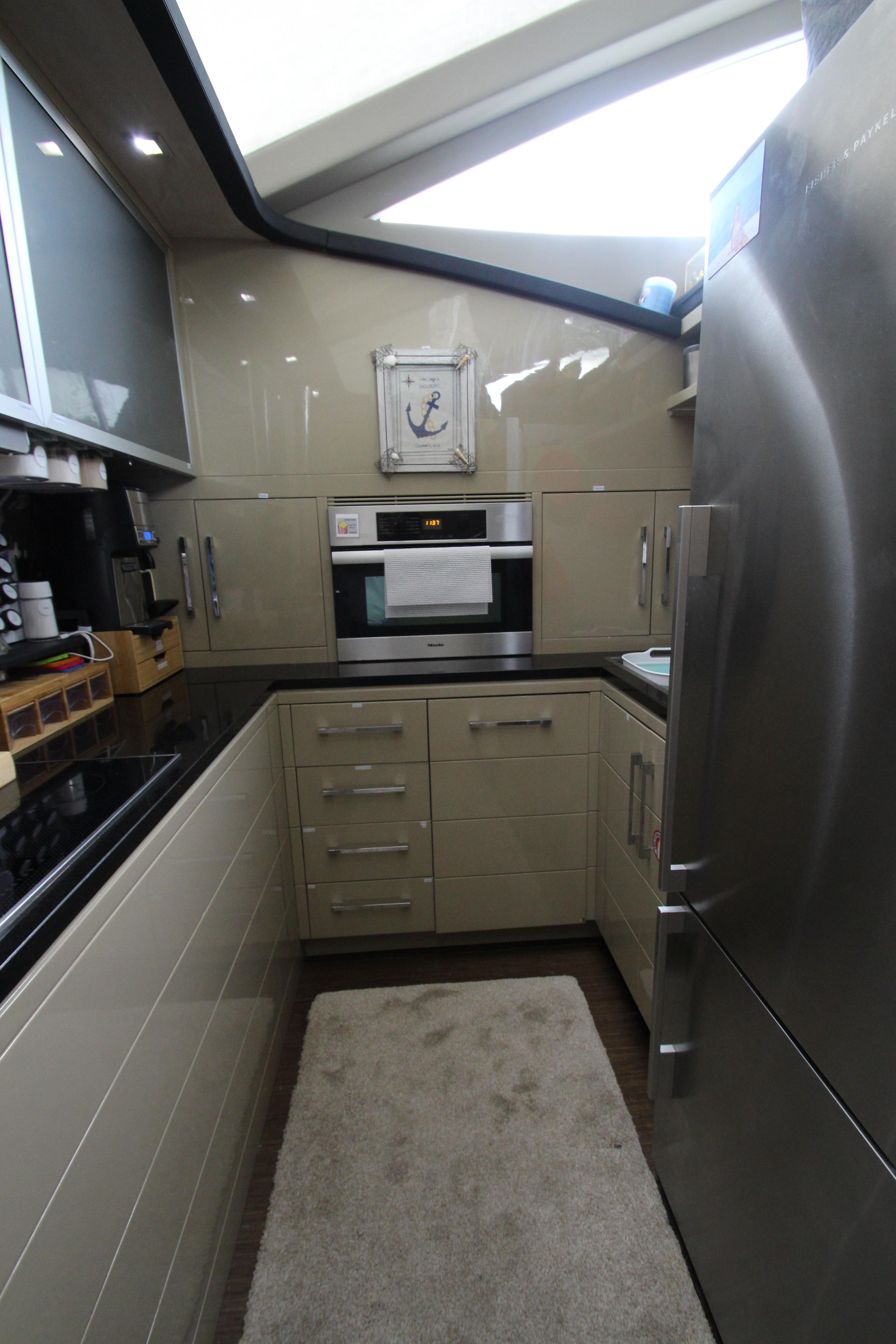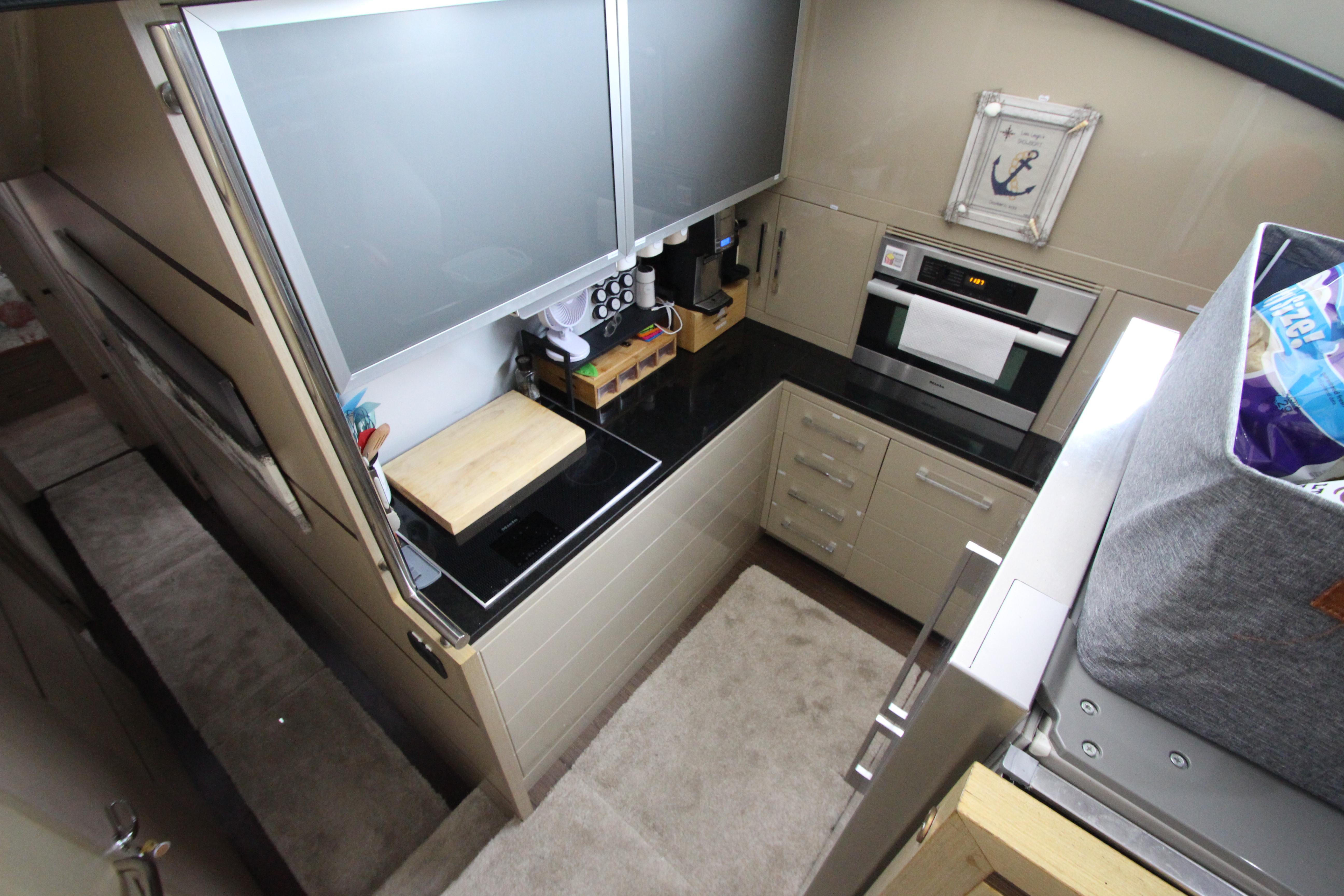 - Galley forward of salon, starboard on lower deck featuring black granite counter top, stainless-steel sink, and Miele appliances
