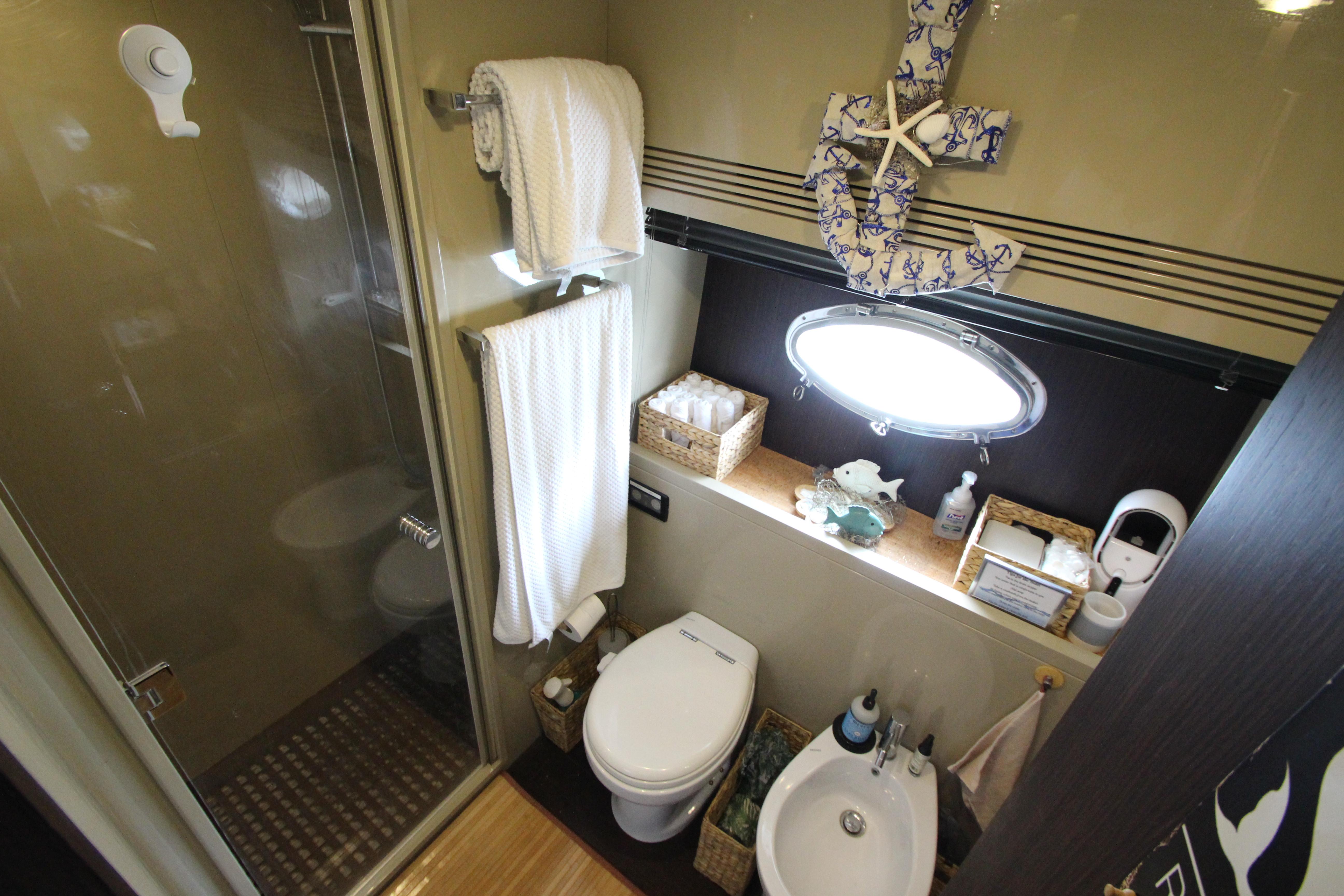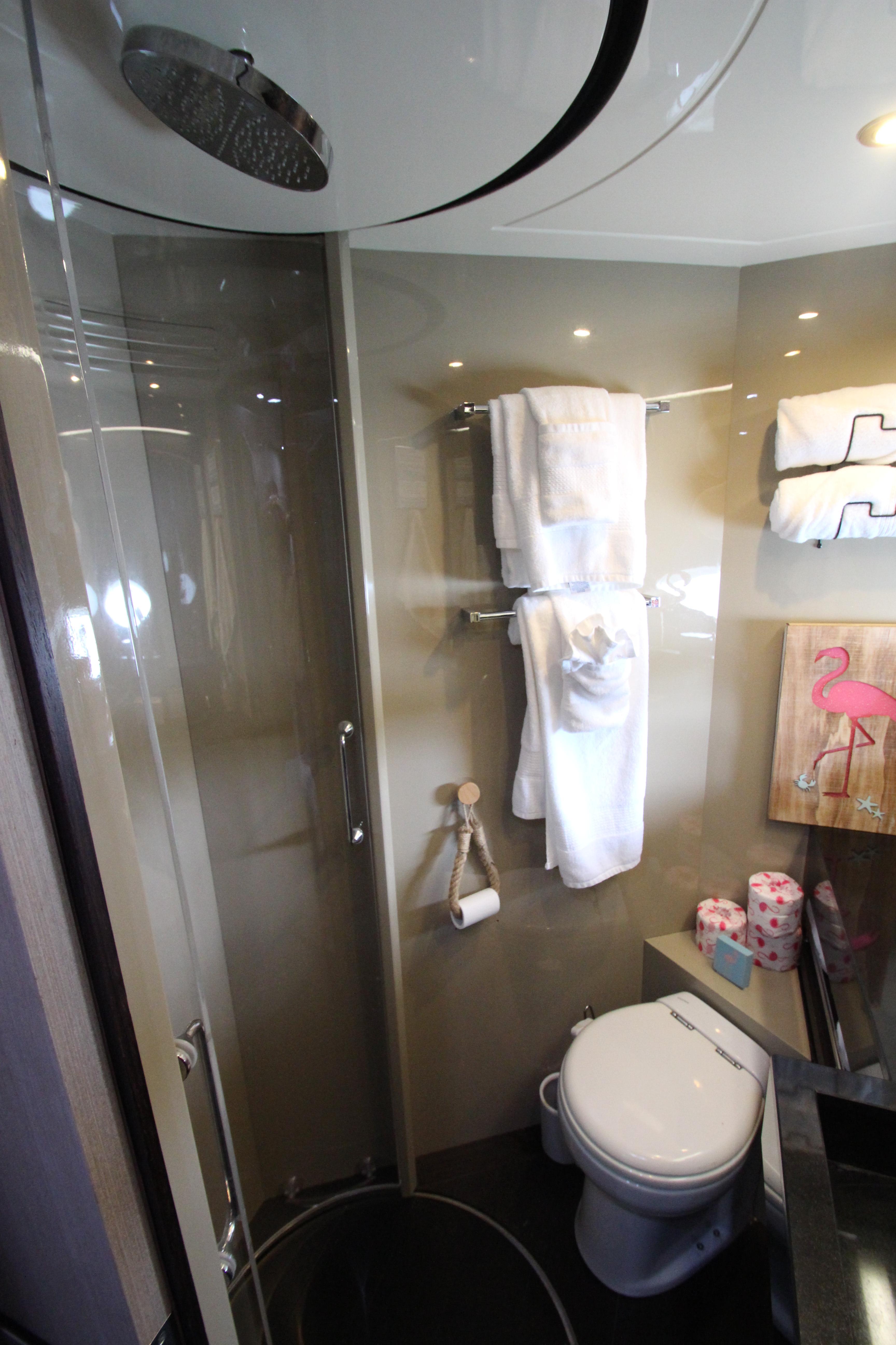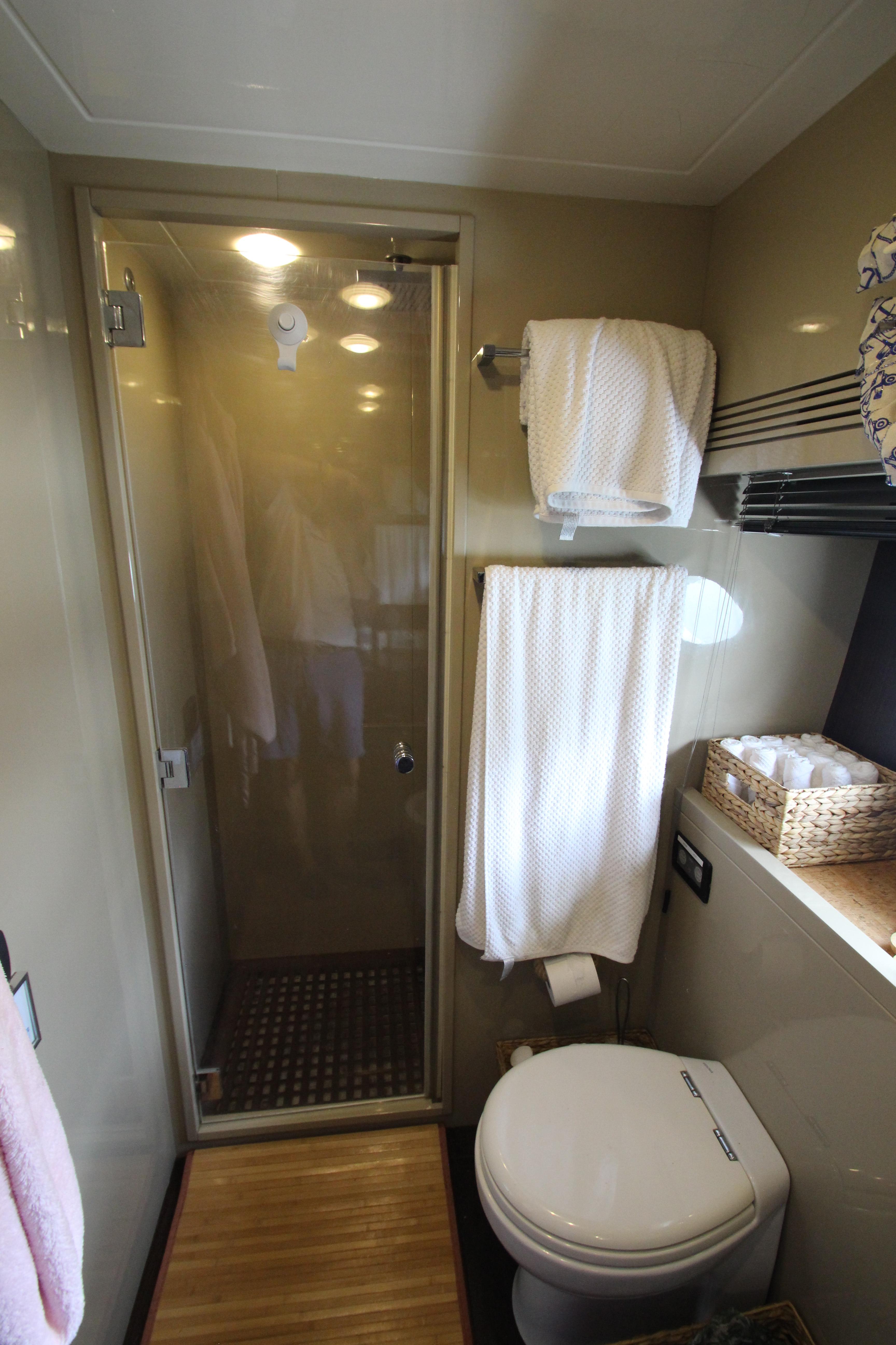 - Separate Plexiglas shower with teak grating