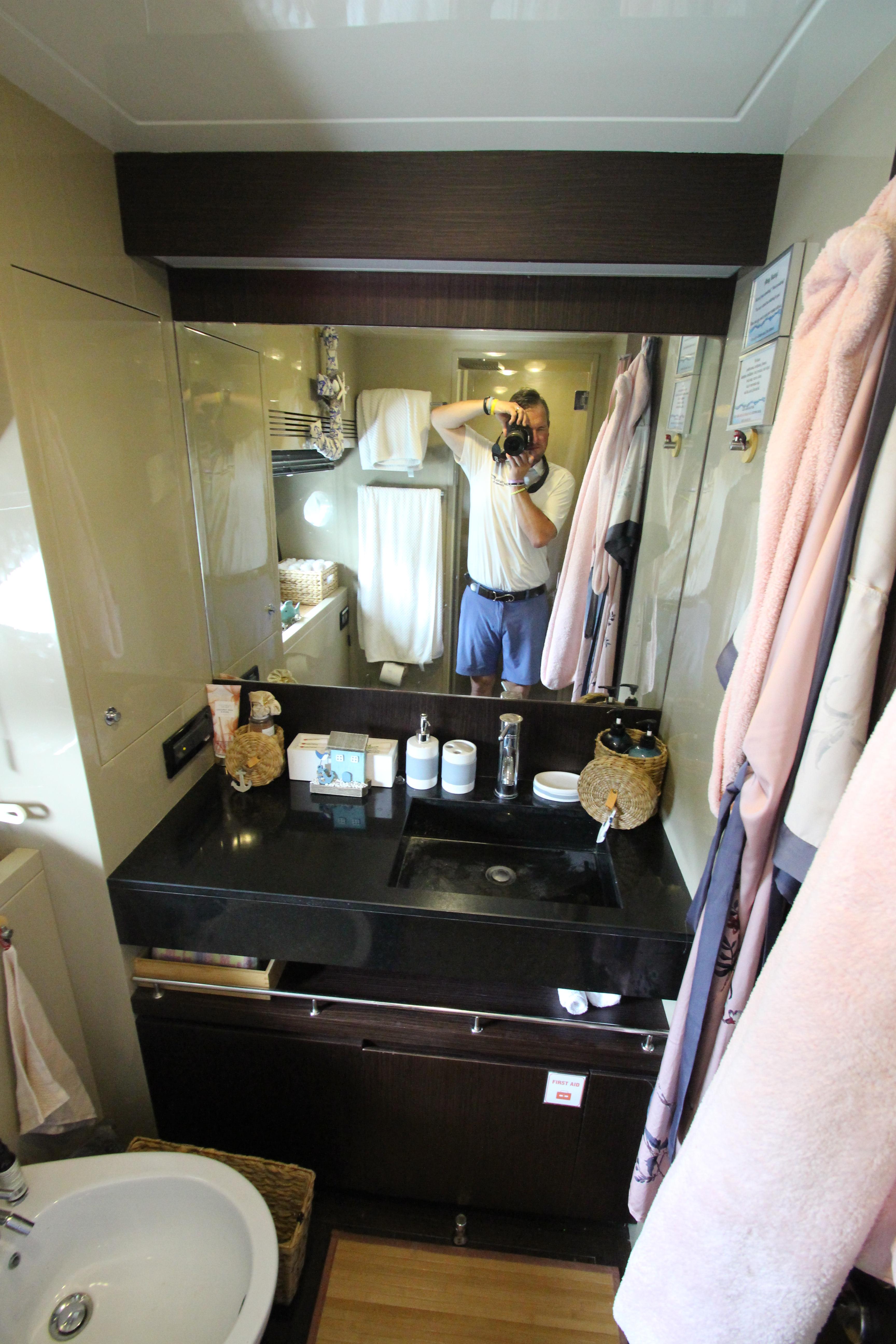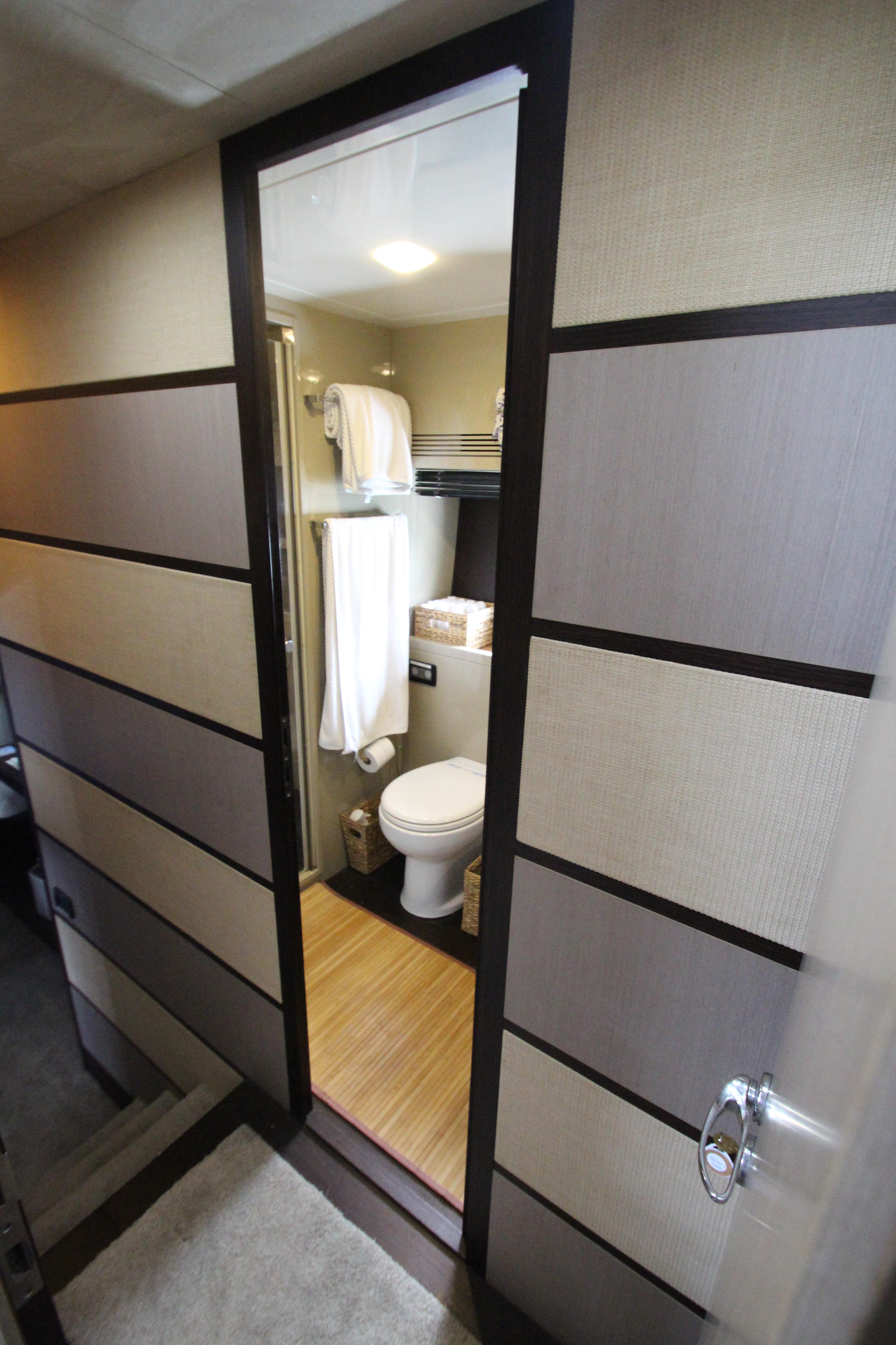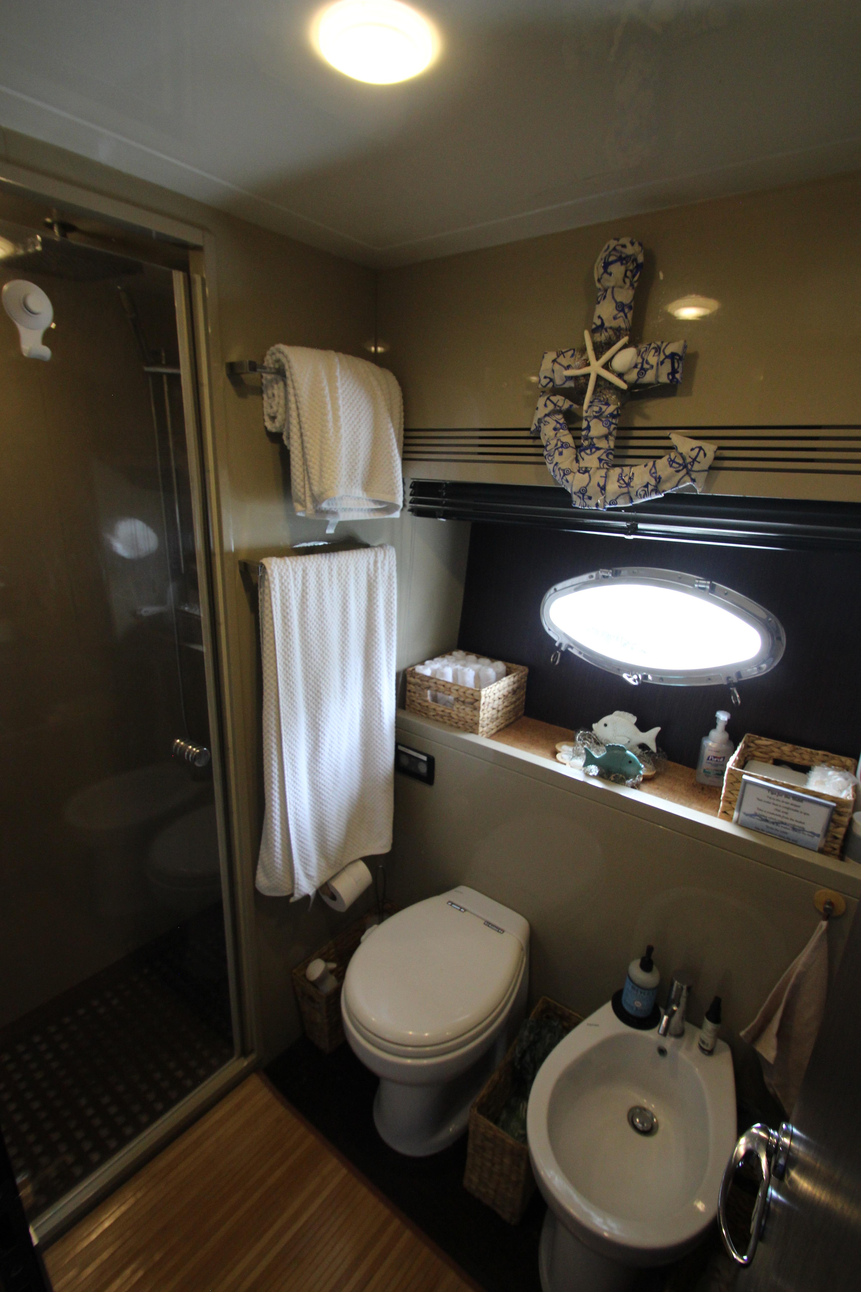 - Separate Plexiglas shower with teak grating
