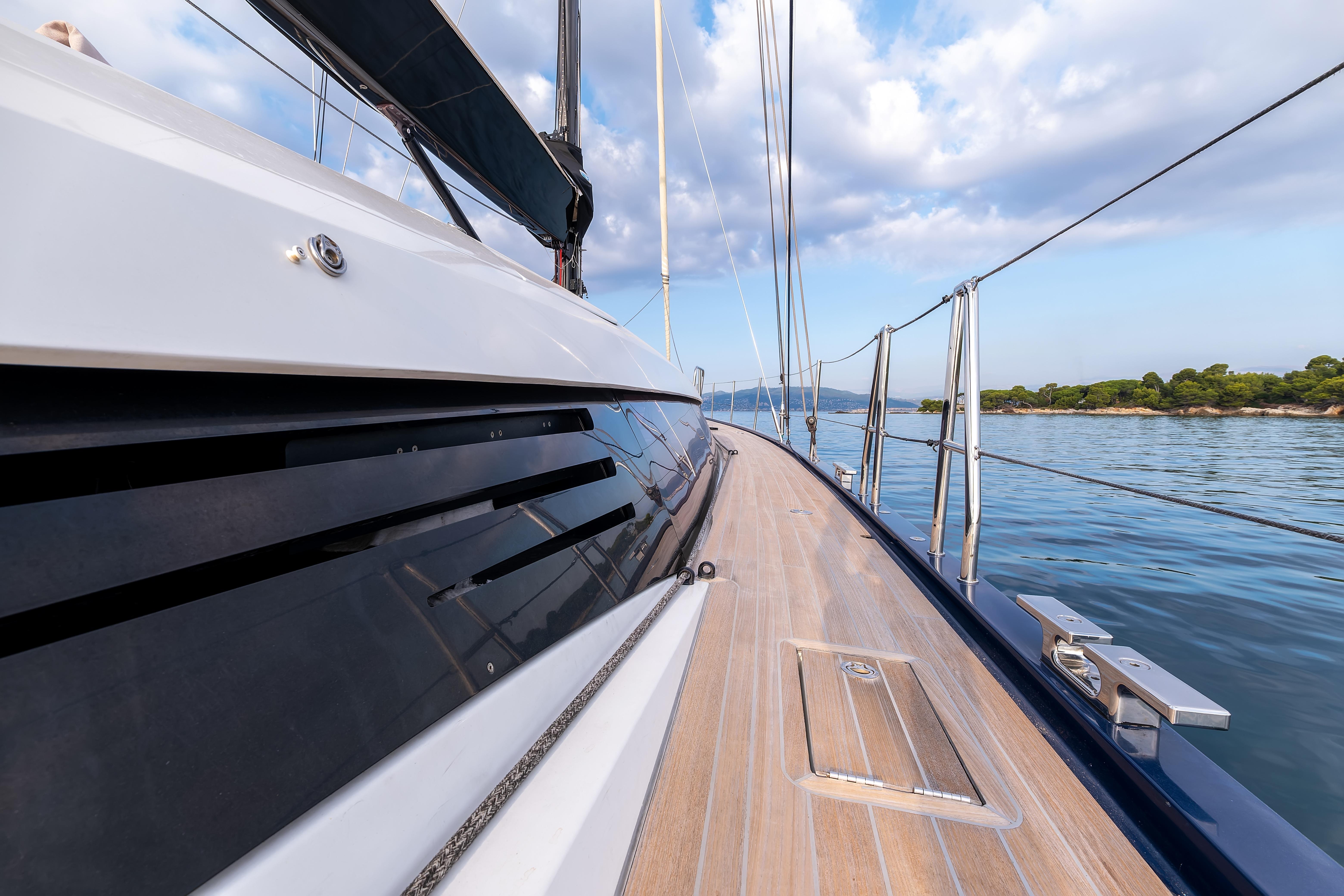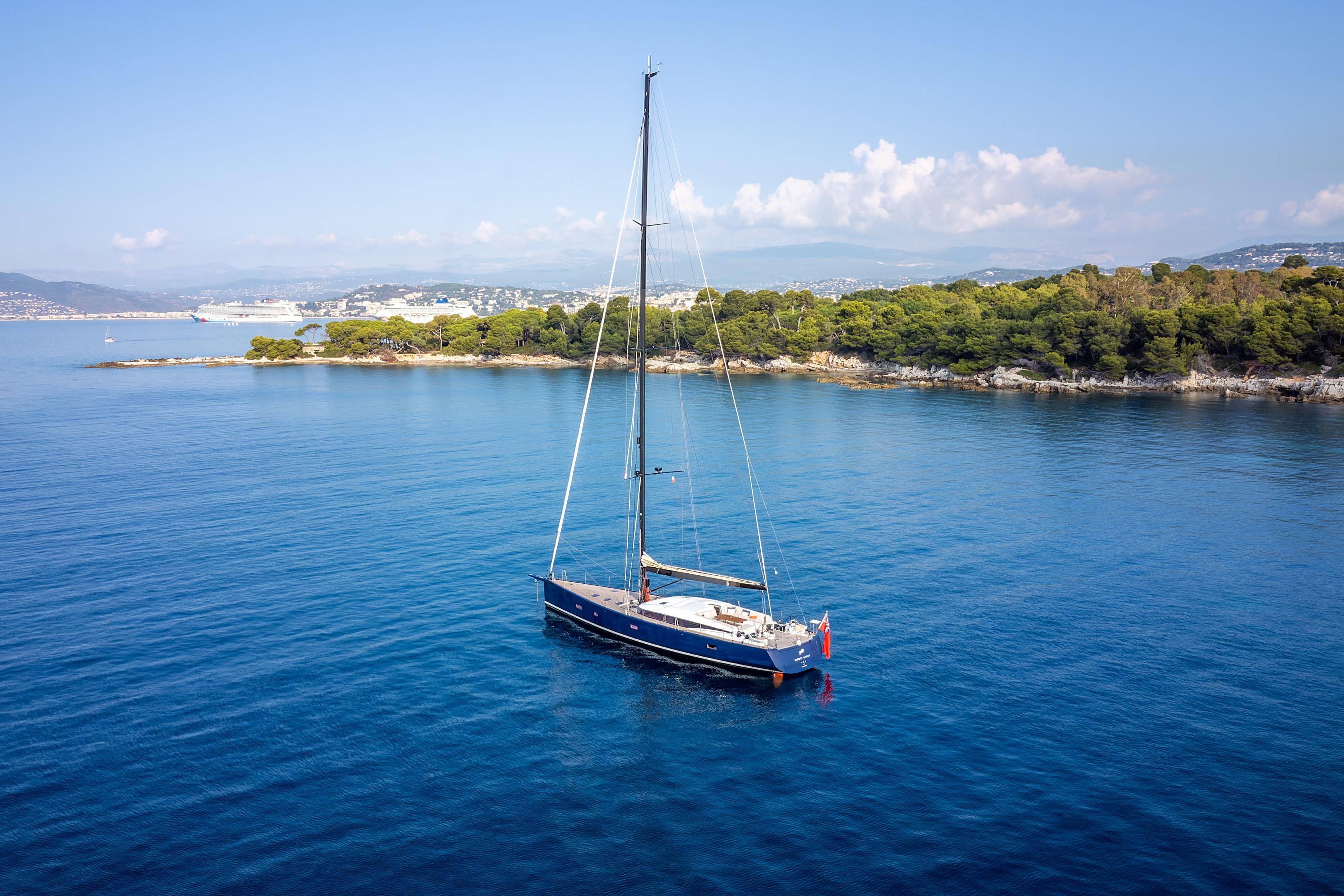 Built in Bordeaux as part of the upgraded MK2 series, CLOUDY NIGHT features a striking navy-blue hull with bowsprit, carbon fibre performance rig, and a teak deck with grey caulking. Her interior is both elegant and versatile, with neutral tones of white, limed oak, and beige upholstery. A flexible layout accommodates 6–8 guests plus 2 crew in comfort.
