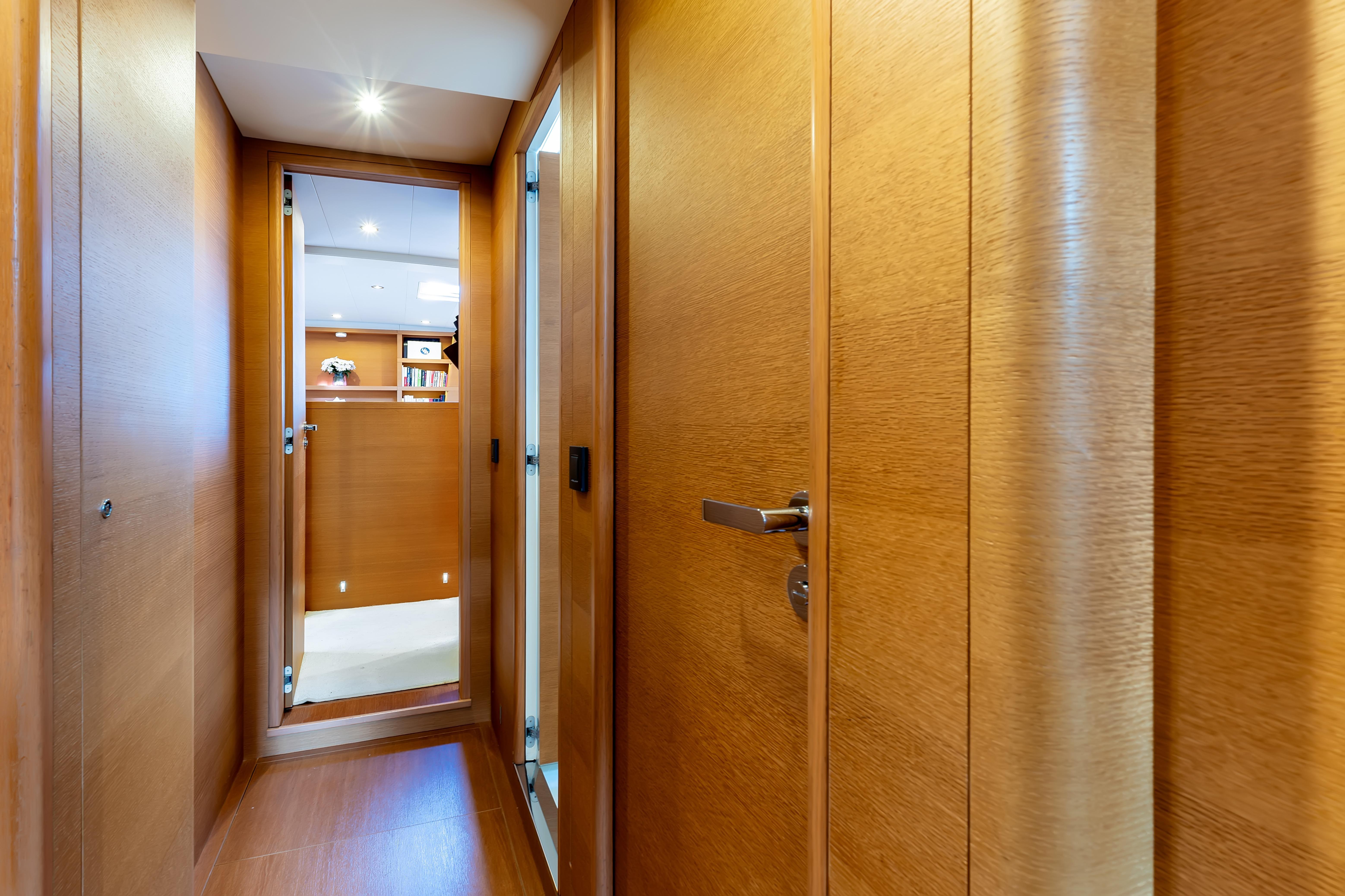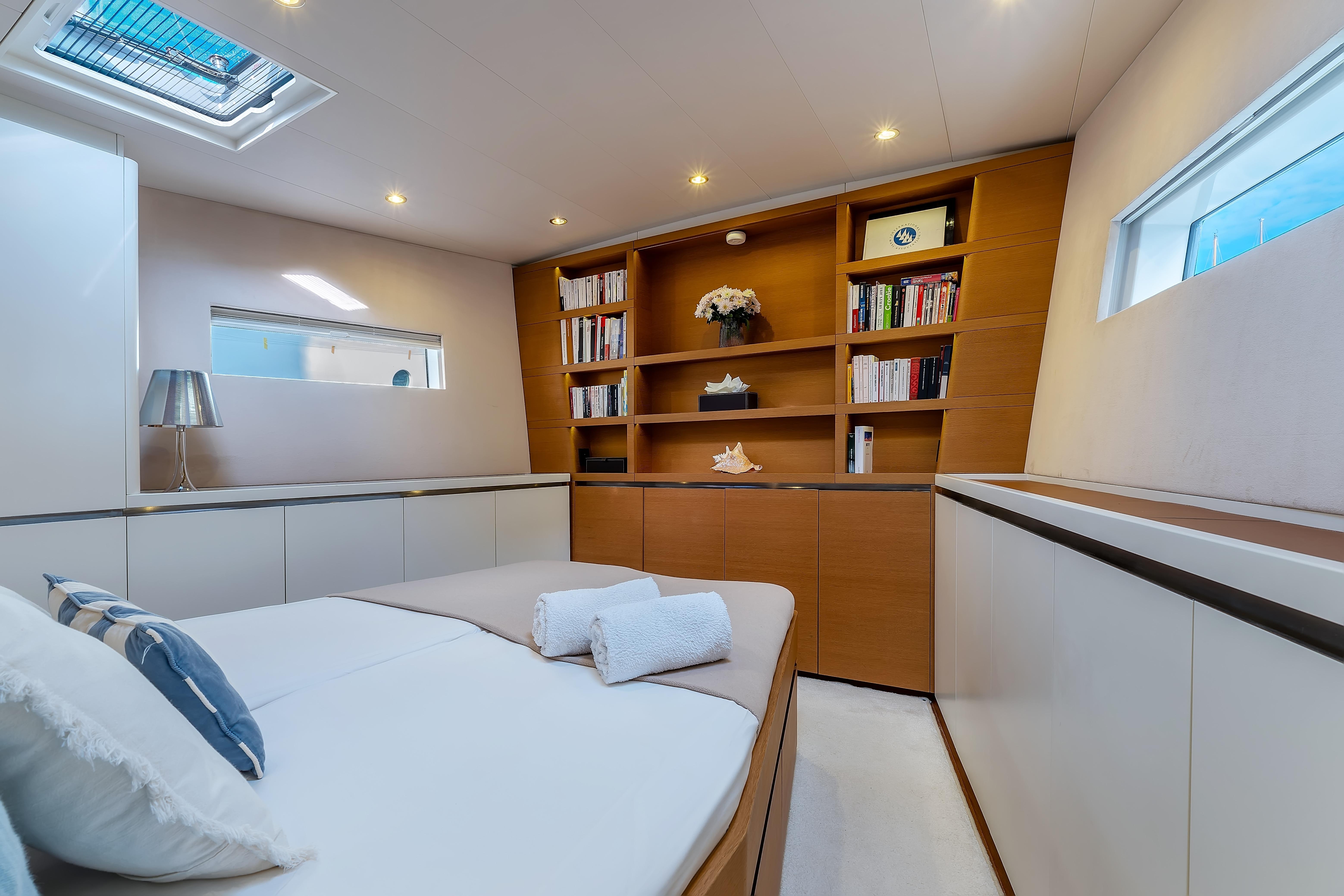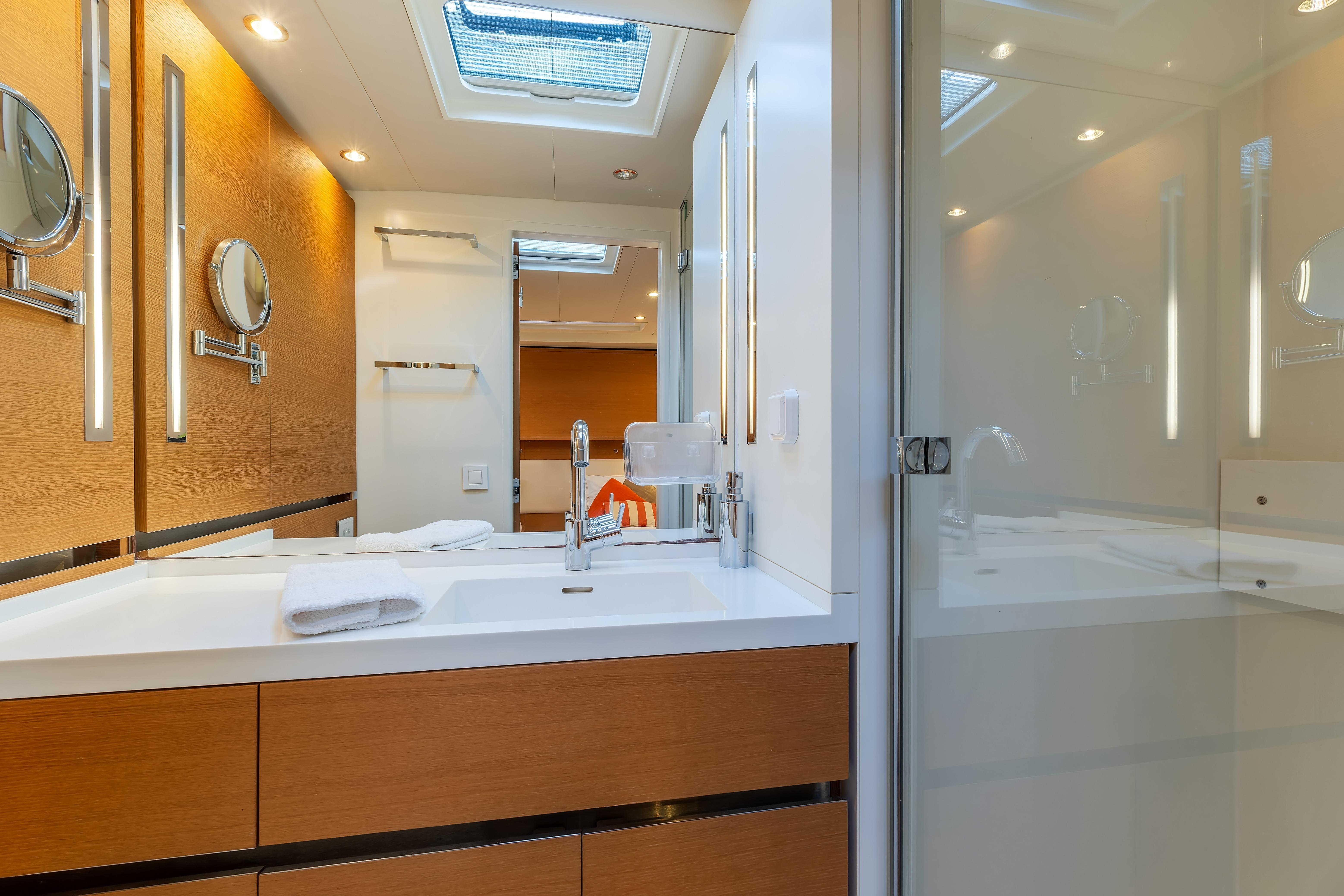 Forward owner’s cabin with walk-around, forward-facing queen-size bed, vanity table, and ample storage space. Great views are afforded by panoramic (eye-level) side hull windows and large deck hatches. Owners’ head with panoramic window, glass shower stall, Corian worktop, and heated towel rail.