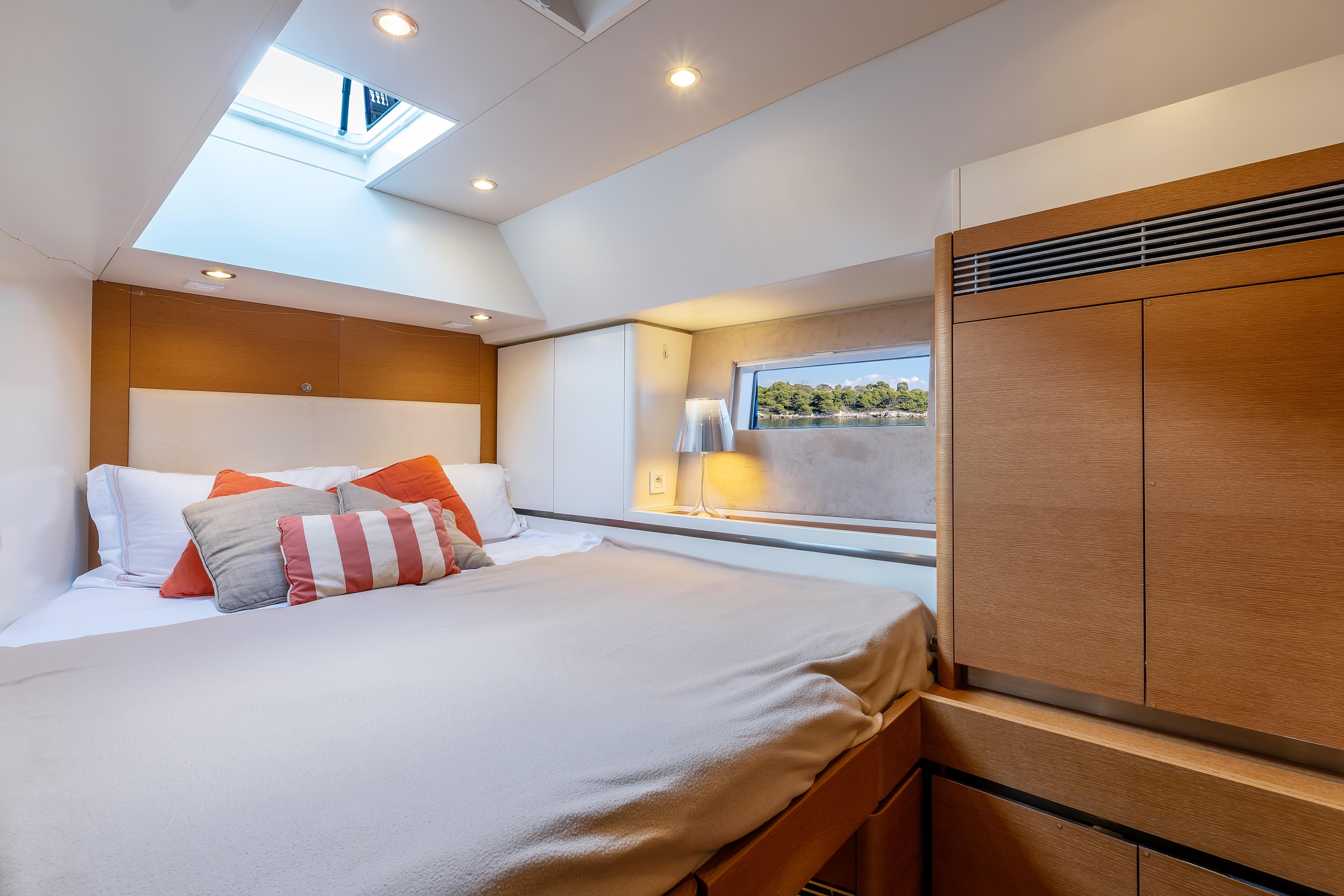 Starboard cabin with panoramic window, bunk beds (lower bed convertible to double), day head with integrated shower.