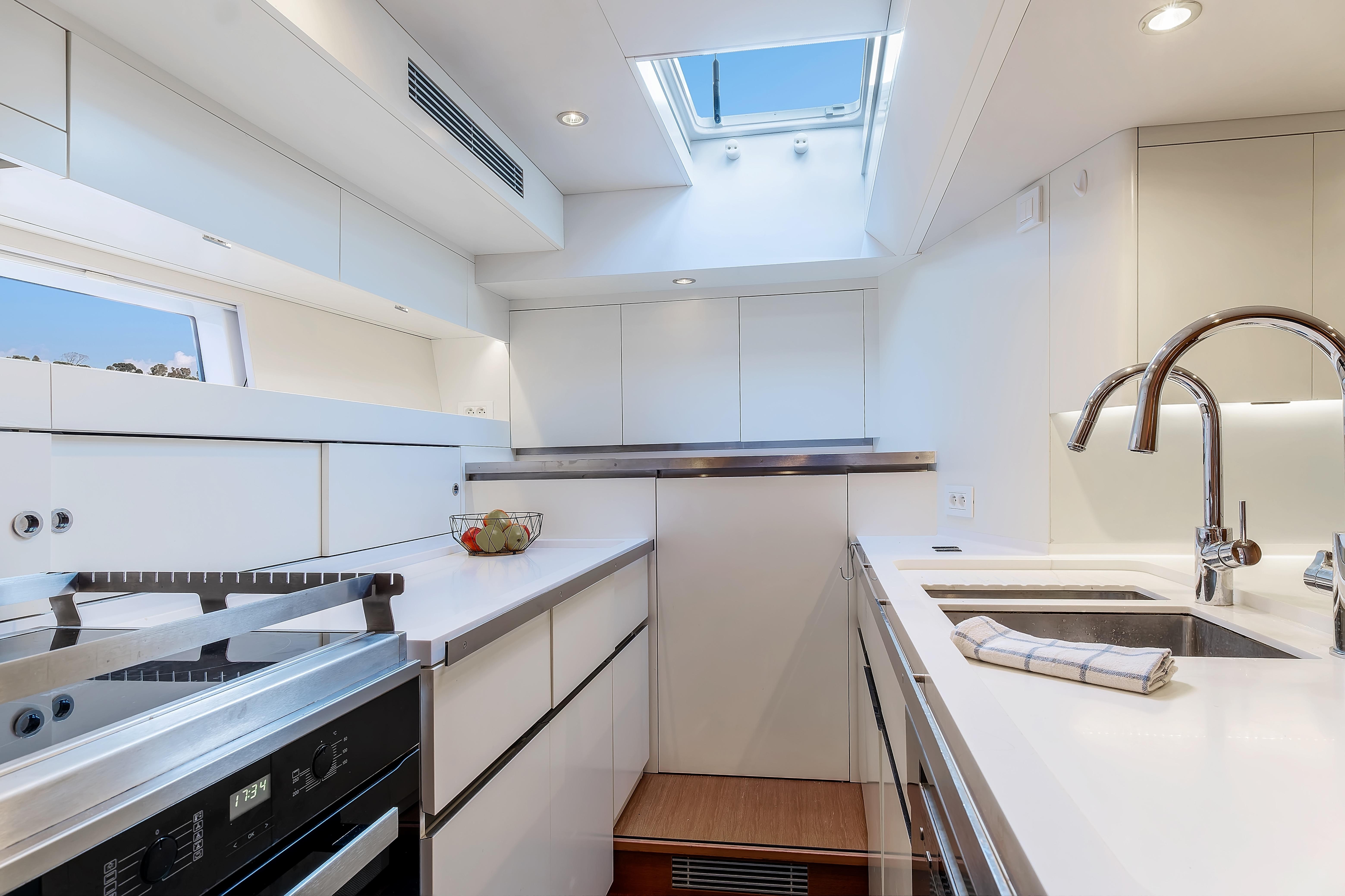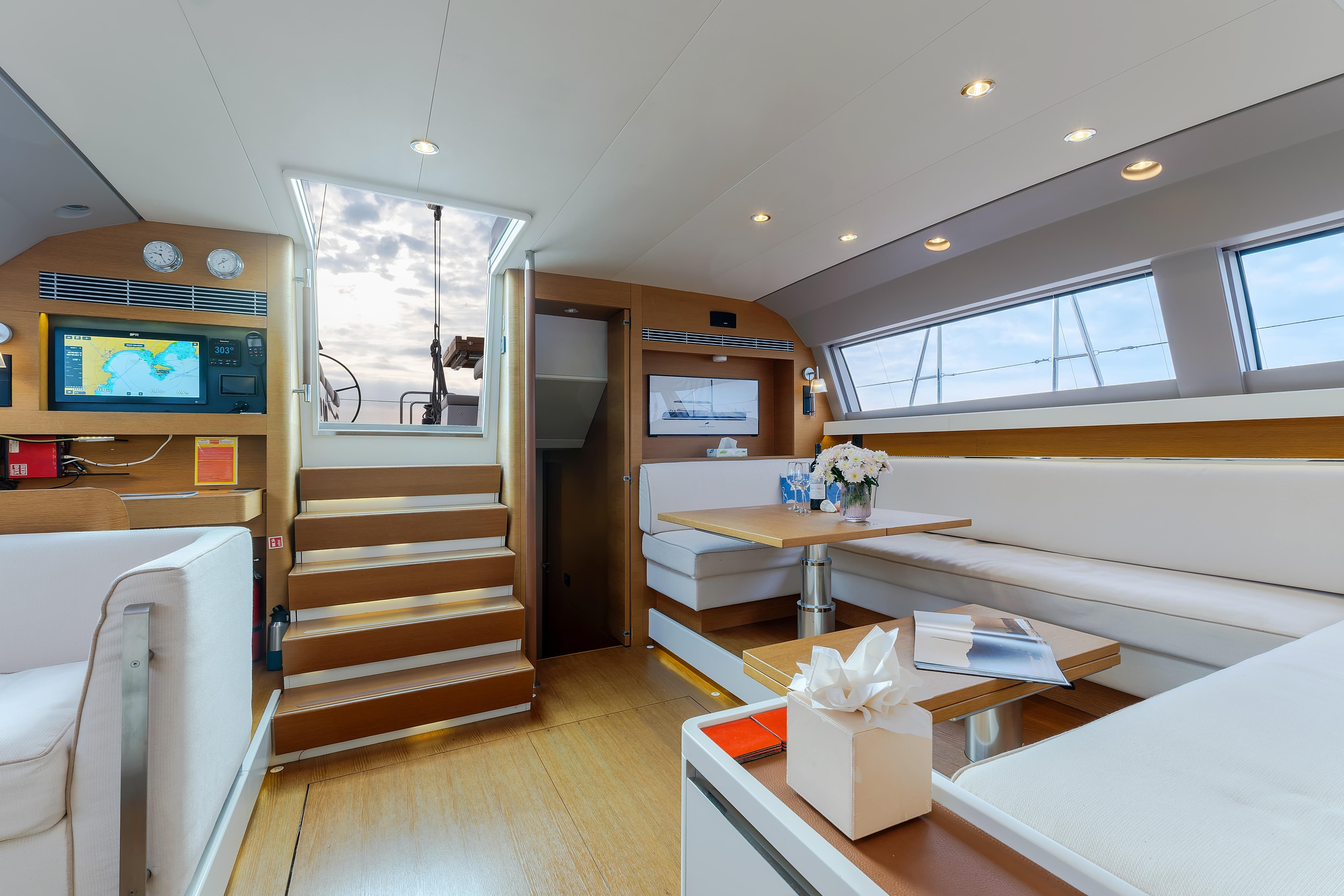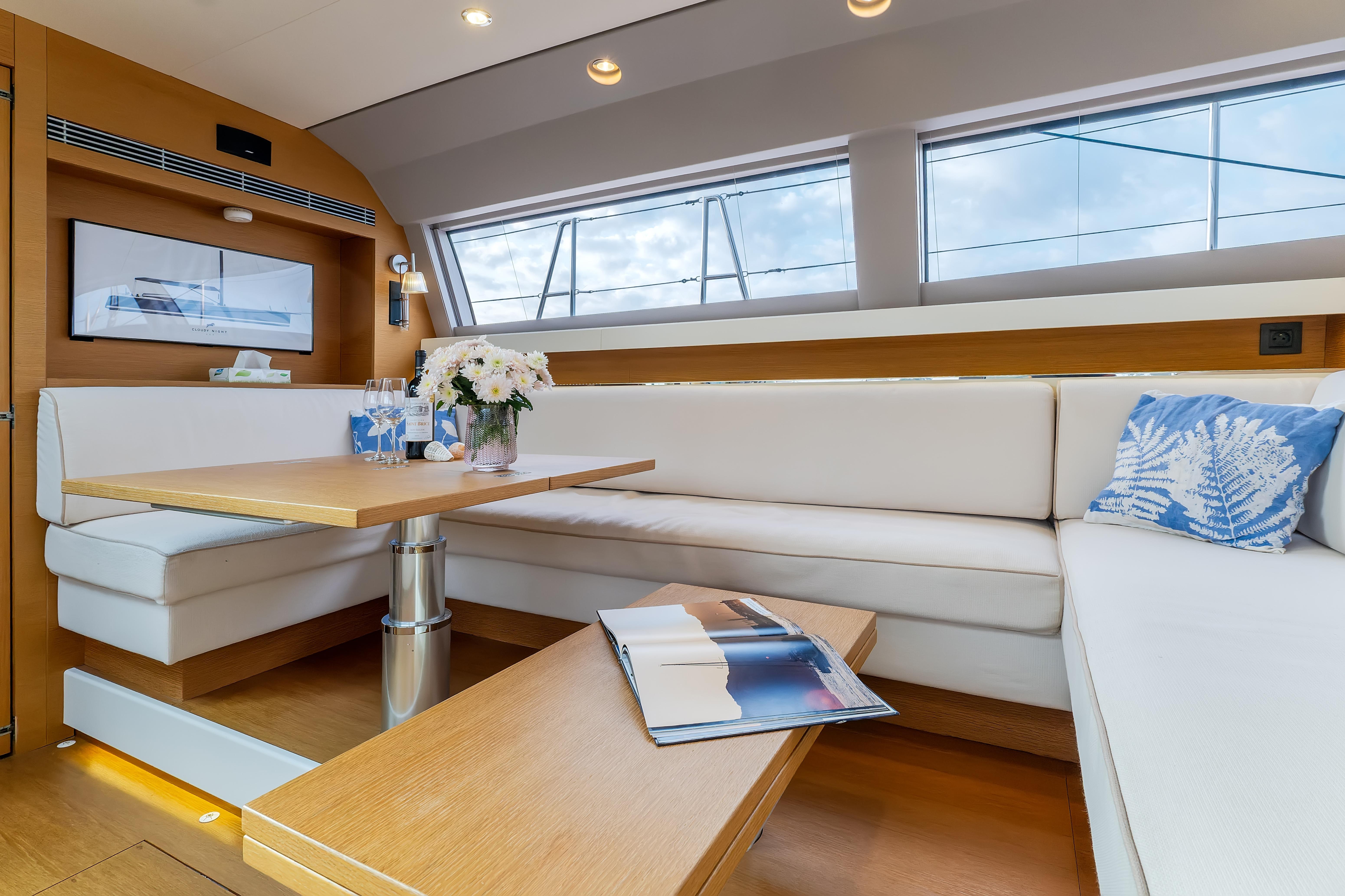Bright and spacious deck saloon finished in limed oak with a raised floor. A 180º view is afforded through panoramic windows, large hull windows, and deck hatches. The layout allows for three different dining/coffee table configurations, for 8 people to dine or relax in comfort. Beige sofa to port and a beige double armchair that converts to a sofa/bed to starboard.