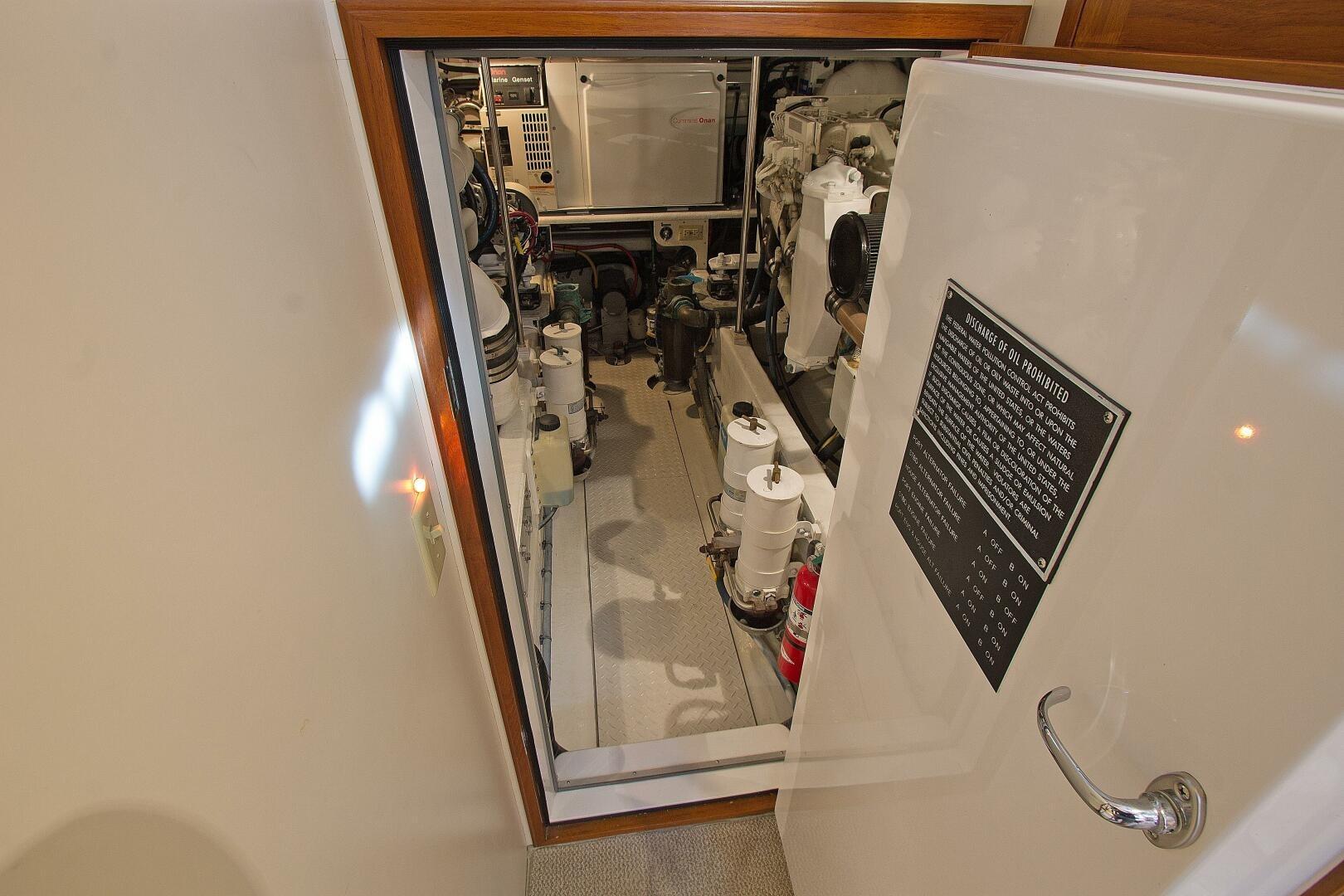 Engine Room and Mechanical SystemsThe engine room is accessed by a hatch in the middle of the aft deck. Additionally, nearly all of the aft deck is capable of unbolting and lifting off for unrestricted and non-invasive engine access. Once down below the engine room resides behind a latched, insulated door. The headroom and movement space is especially impressive for the engine room of a boat this size. Along with the convenient placement of components for easy maintenance, routine checks, and service; this engine room is a pleasure to be in. Equipped with two Cummins 6CTA8.3 diesels, 480 hp with V-drive transmissions, this Dettling is not shy on power and can achieve a high cruise of 16 knots and a max speed of nearly 27 knots.