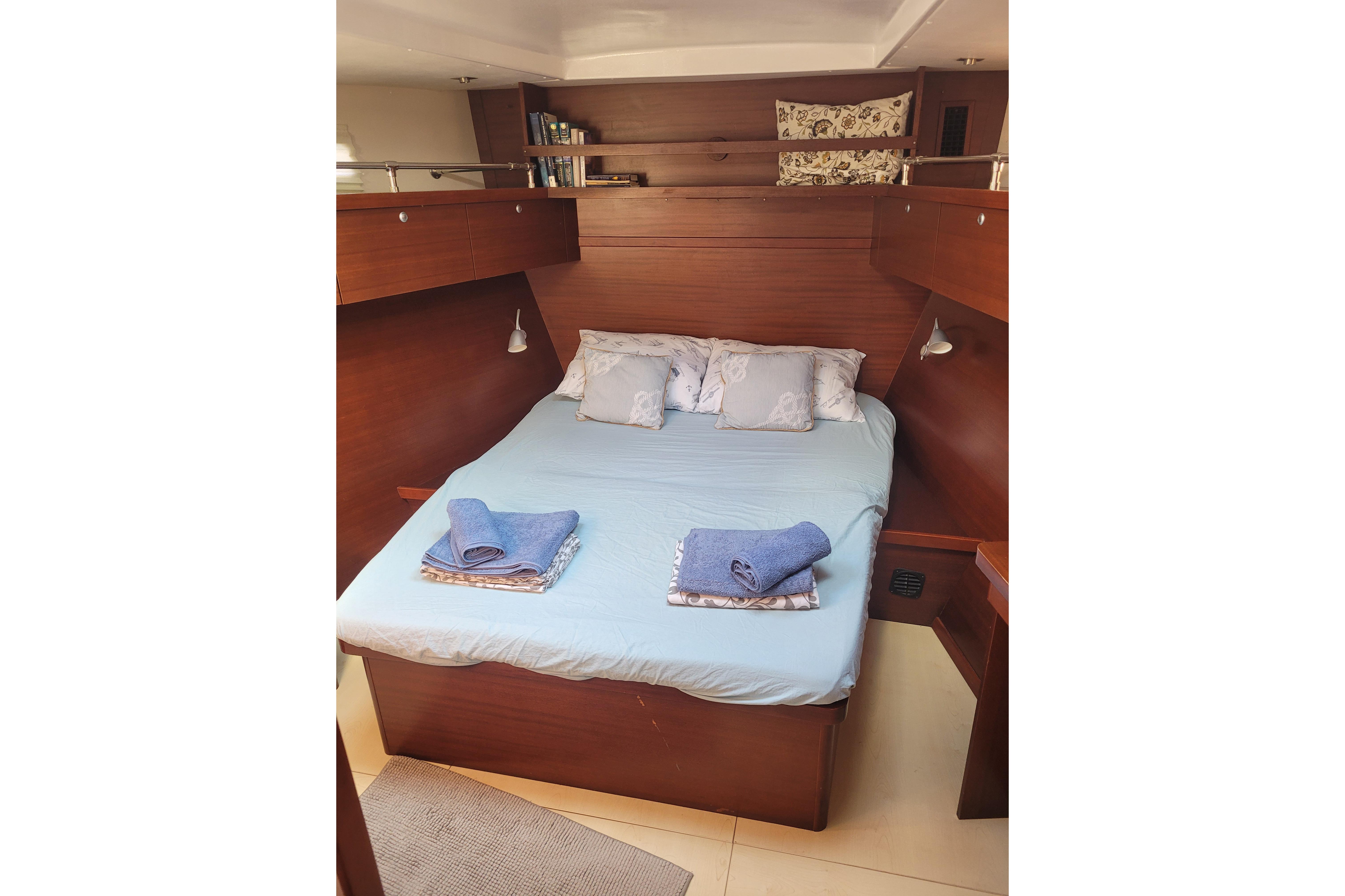 Dedicated skipper cabin in the forepeak with toilet, sink, and new mattress