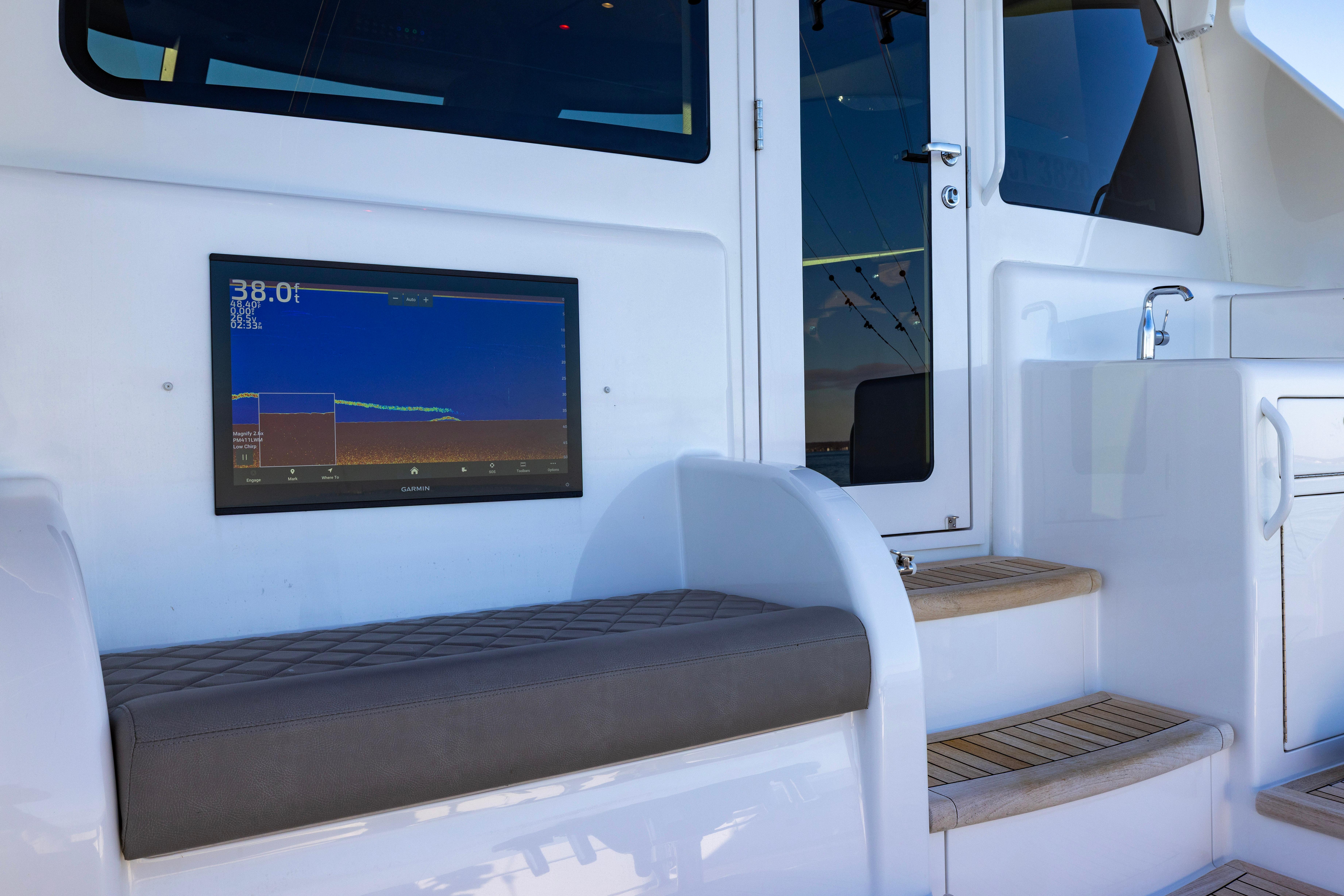 She has a AME package that includes ( 4 ) screens on a custom helm, Omni Sonar KVH and night vision. In her cockpit you will find a custom tackle center starboard with sink, ( 8 ) tackle drawers, engine controls, hydraulic bow thruster, custom molded spreaders and side lights, teak cockpit and an upgraded Seakeeper 18!