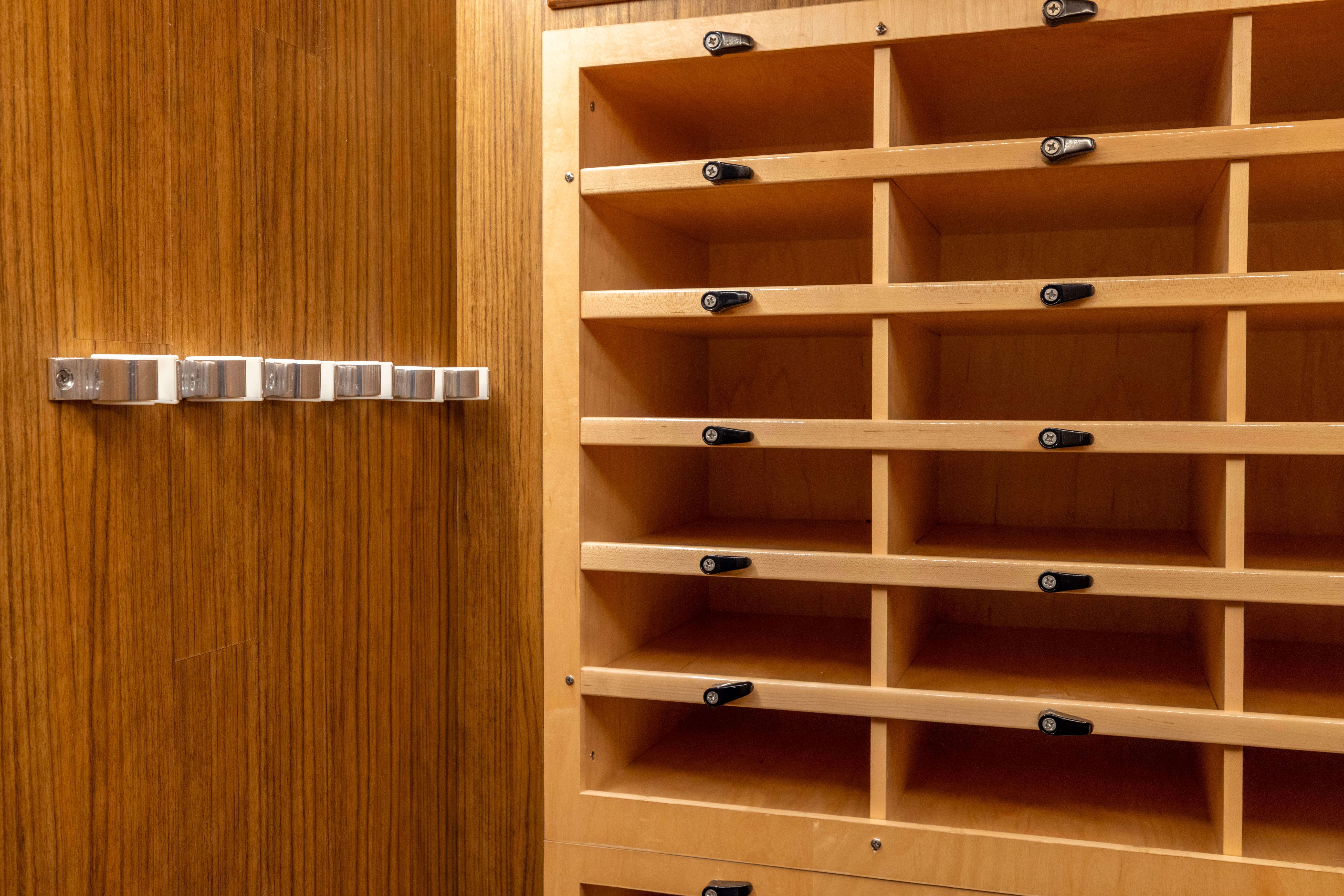 - Custom wall unit for plano boxes and spreader bars