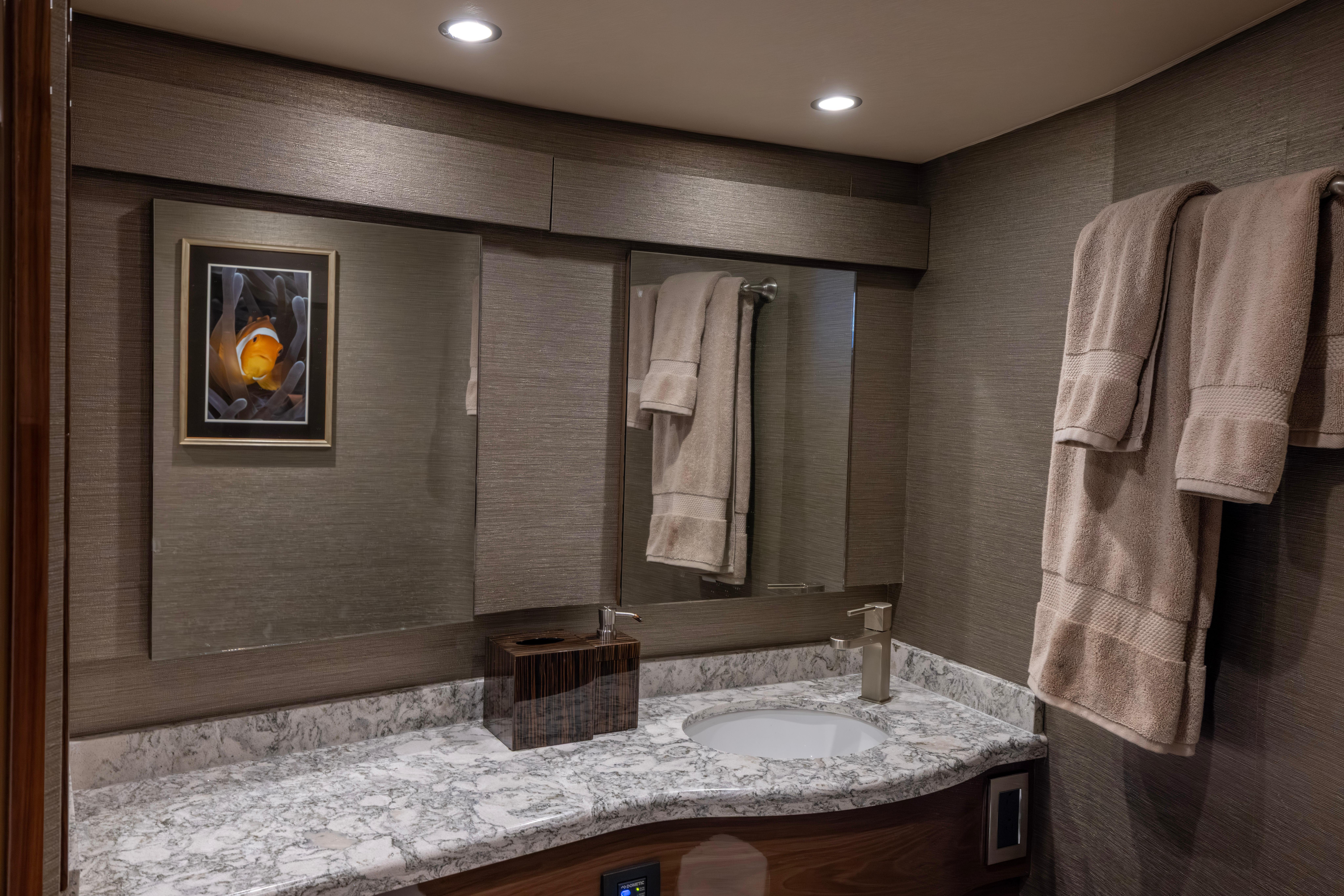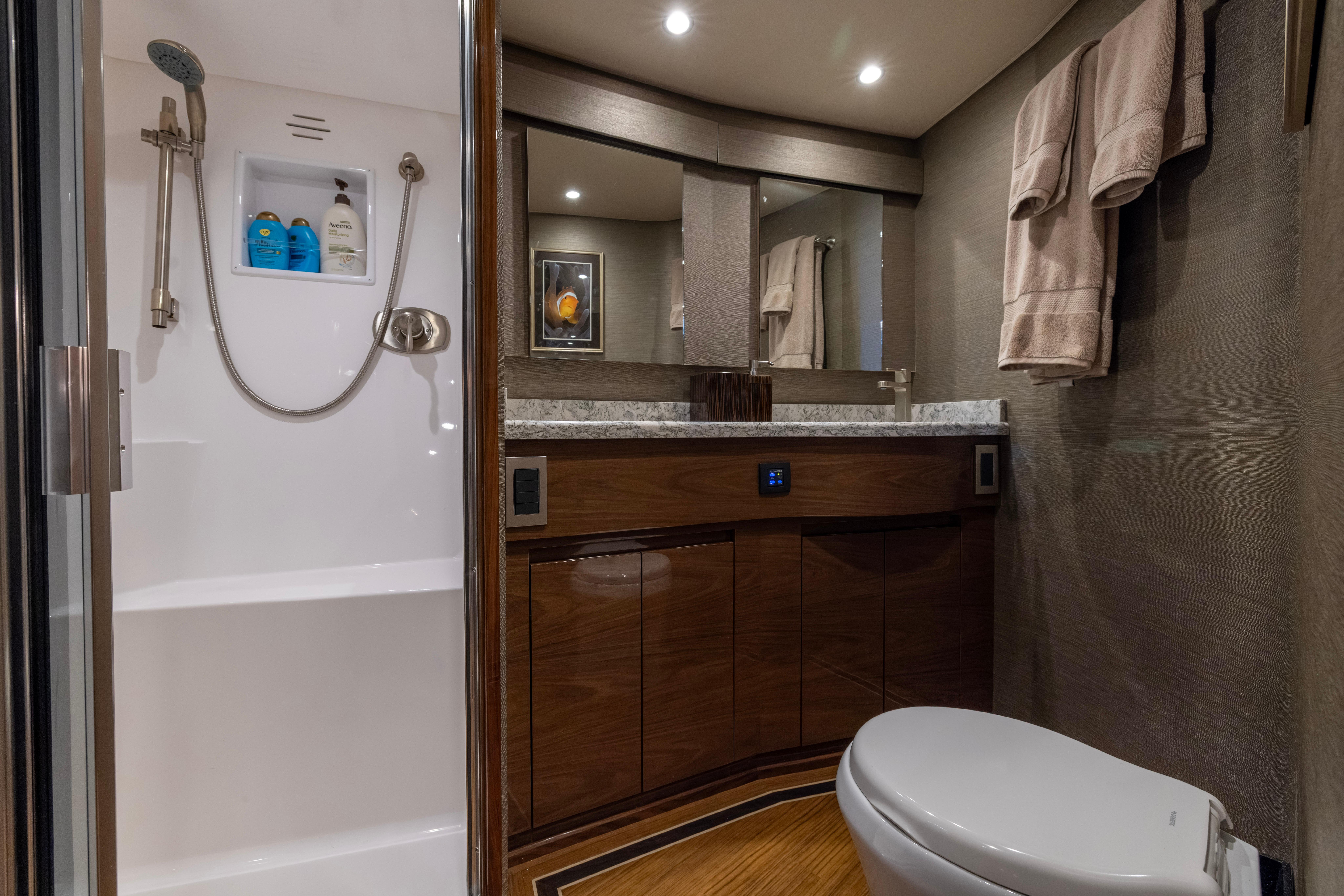 Her custom master stateroom is to port with walkaround queen berth and VIP Island queen berth forward. There is a custom oversized head with twin vanities and additional glass added to shower stall. The galley and salon area is also custom with galley, L-Shaped sofa and TV. Forward of sofa is a custom walk in tackle room that you would find on an 80' Viking.