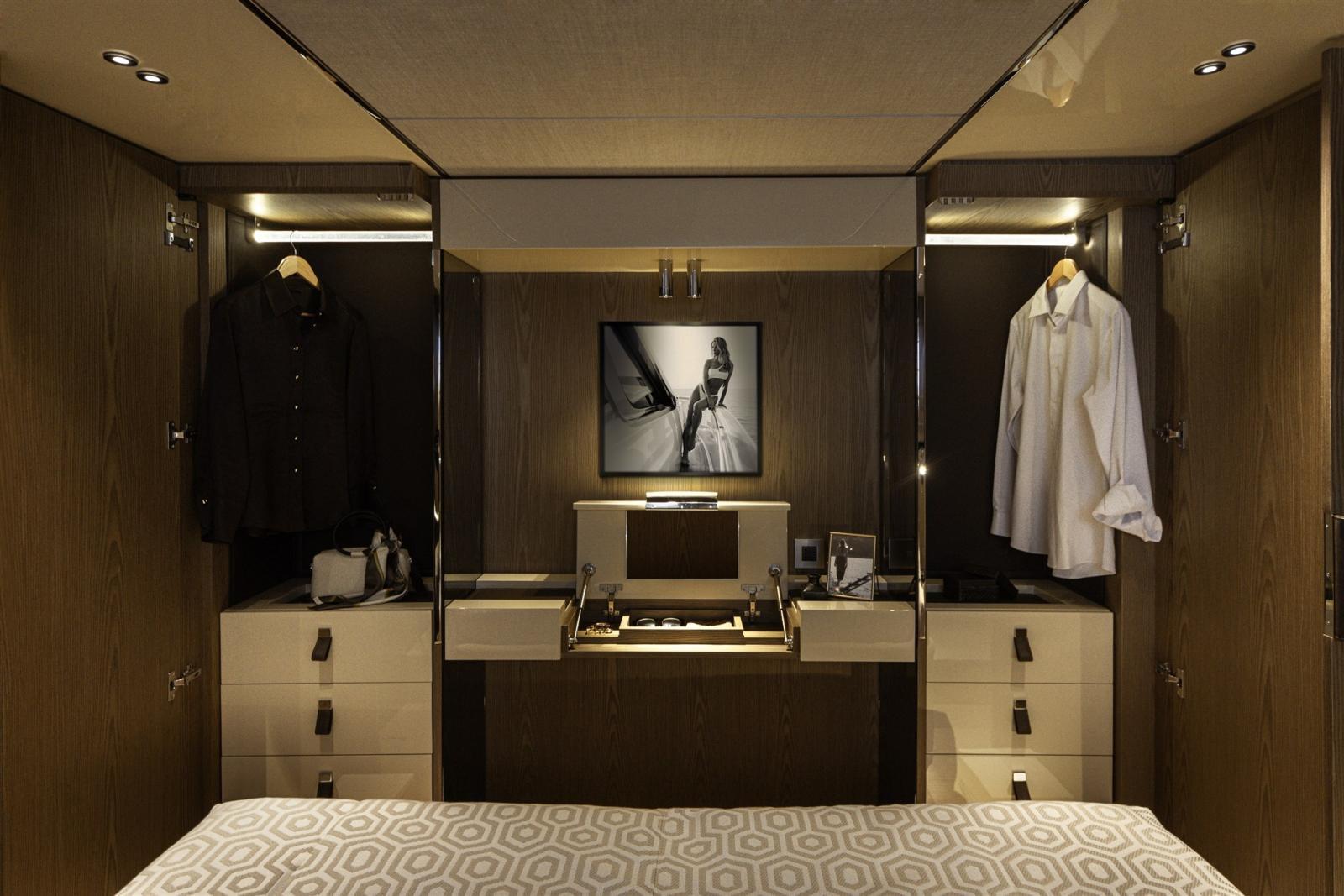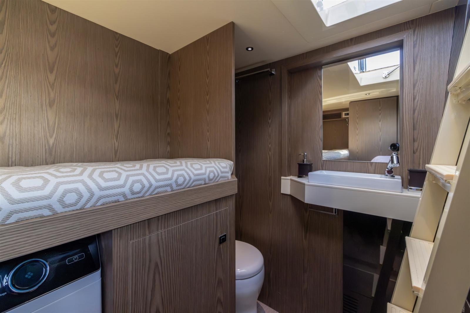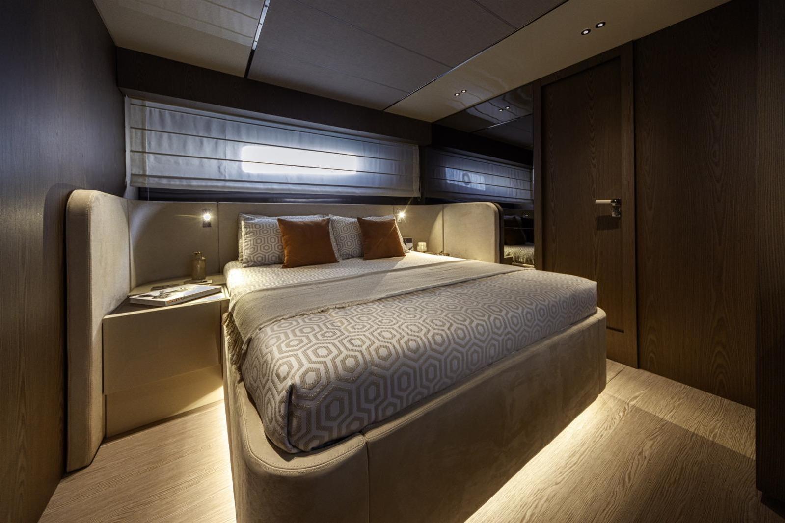 Le pont principal fermé offre un salon, une cuisine personnalisable et un poste de pilotage, tous offrant une vue panoramique grâce à de grandes surfaces vitrées. Sous le pont, deux élégantes cabines Master et VIP disposent chacune de salles de bain privées, tandis qu'un espace central convertible offre une flexibilité accrue.