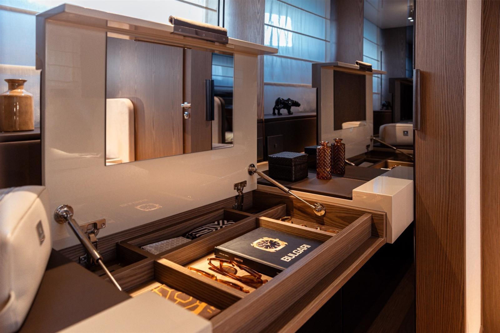 Chaque détail est pensé pour offrir une expérience de luxe authentique et relaxante. Des matériaux haut de gamme se marient à une palette alternant tons doux et couleurs plus vives, créant des touches sophistiquées et des contrastes clairs-obscurs qui enveloppent les passagers dans une atmosphère chaleureuse et raffinée.