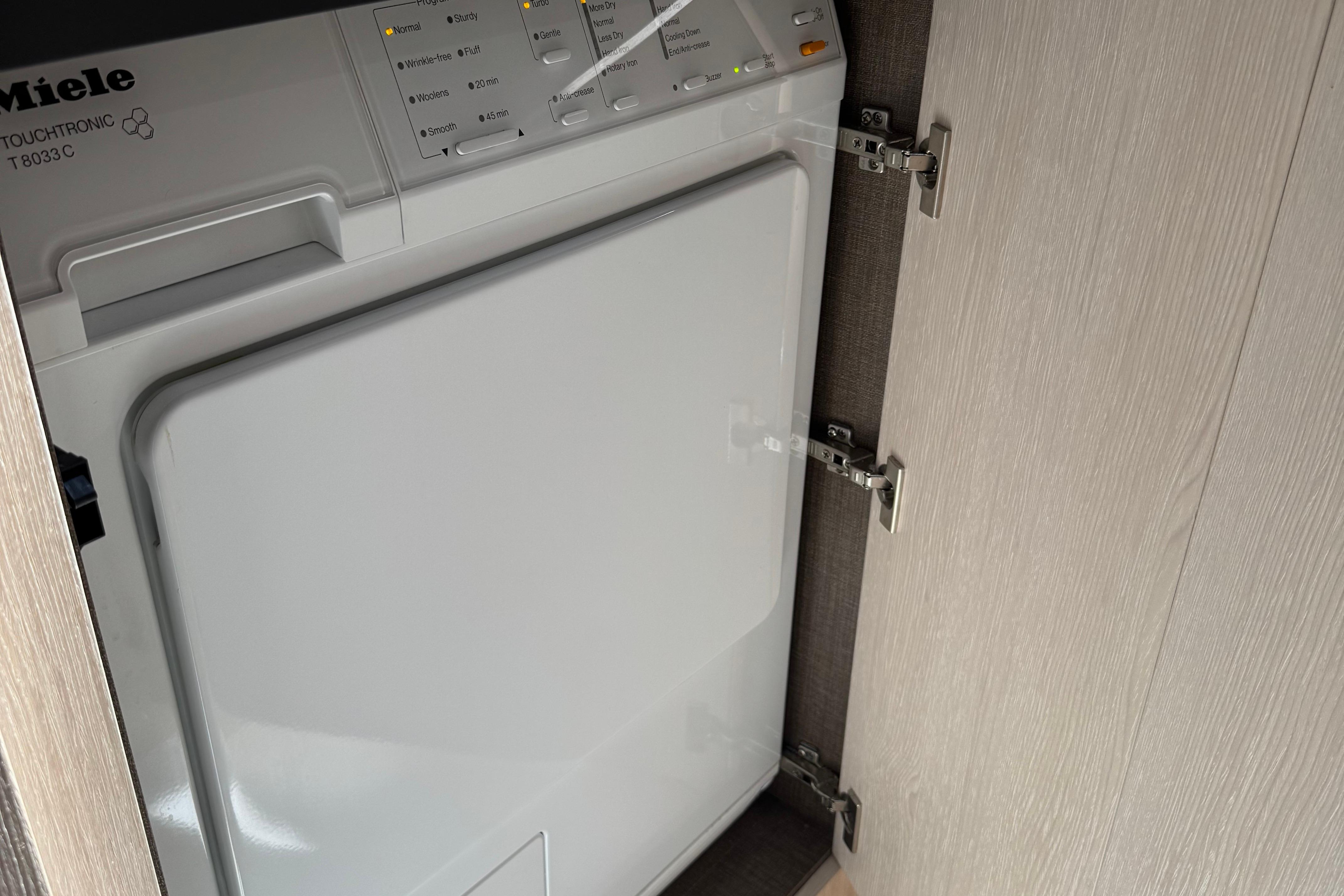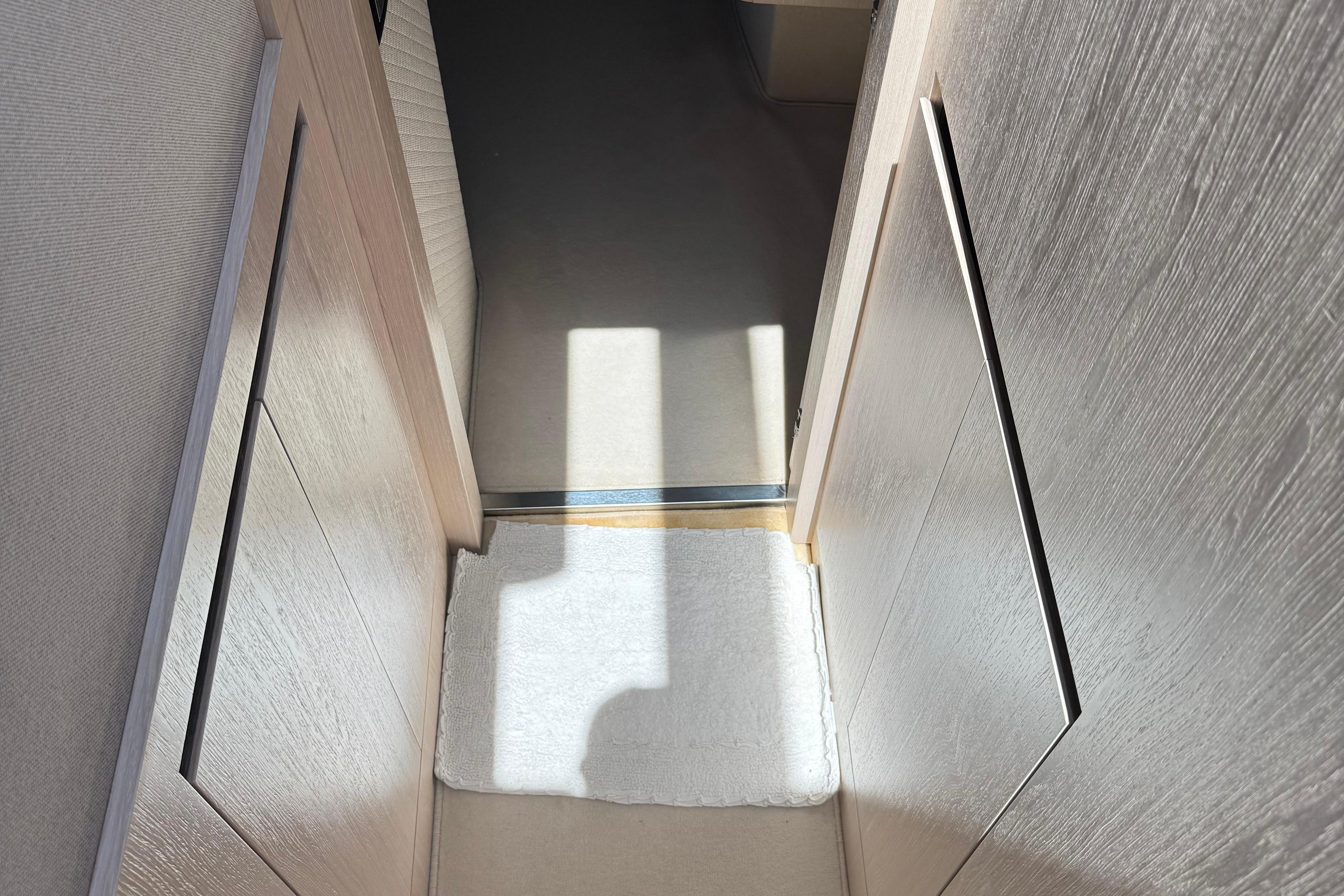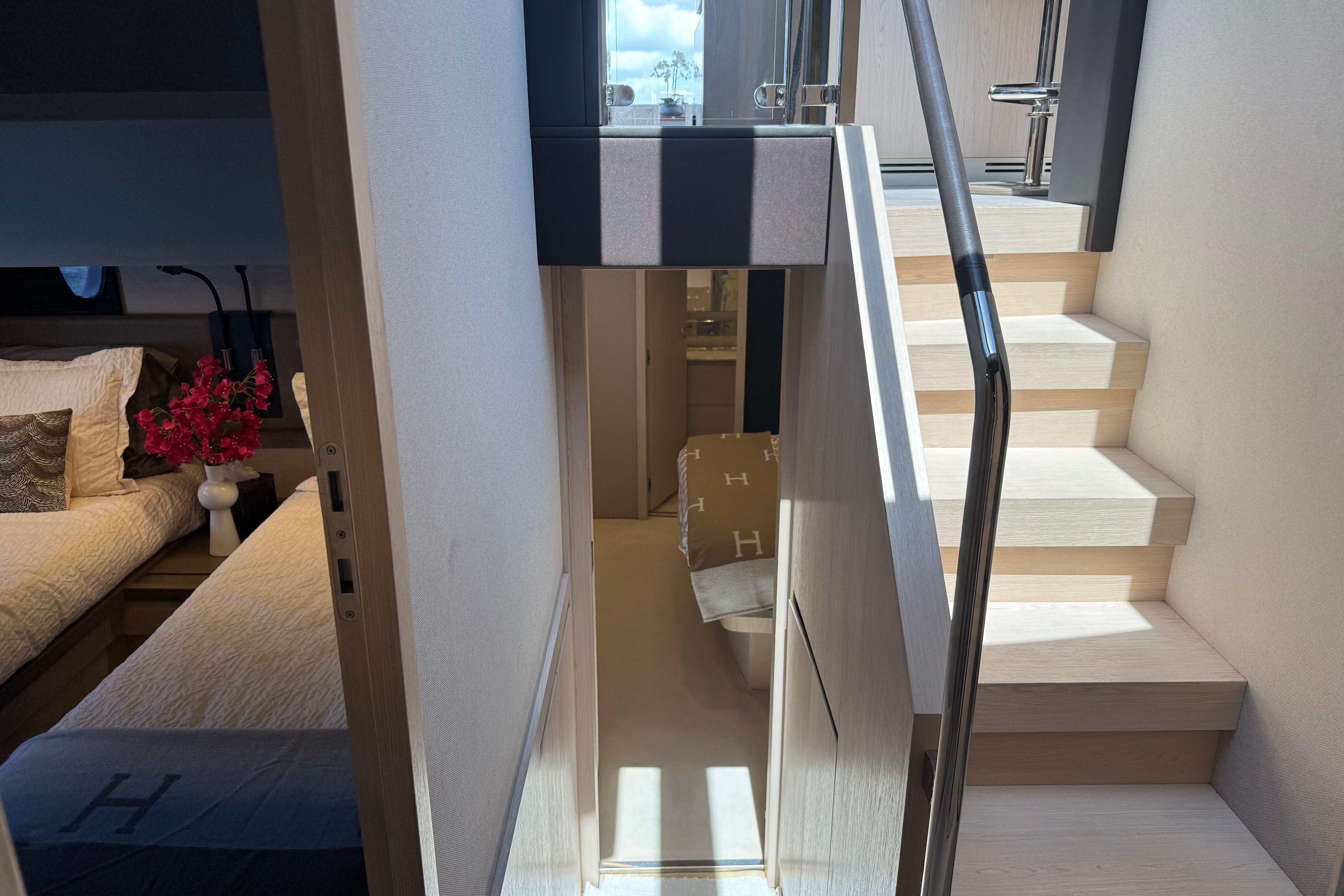 Step aboard and you’ll immediately notice the massive flybridge—one of the largest in its class—offering plenty of space to enjoy the sun, dine with friends, or simply take in the view. Inside, the salon is bright and airy, with oversized windows and elegant finishes that make it feel like a floating luxury apartment. The open-plan layout flows effortlessly from the galley to the lounge and dining areas.