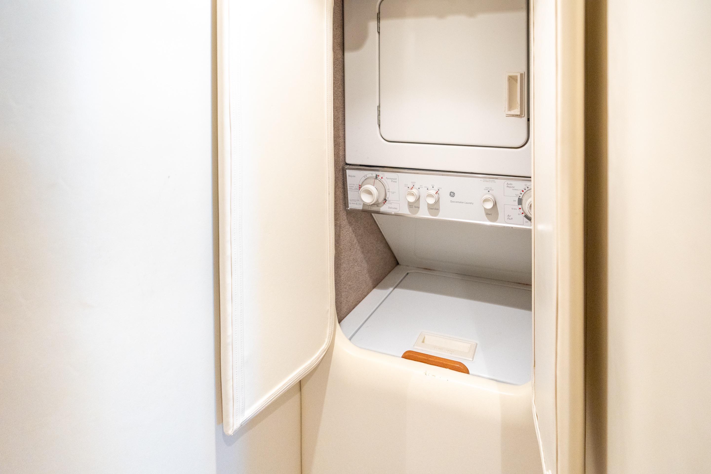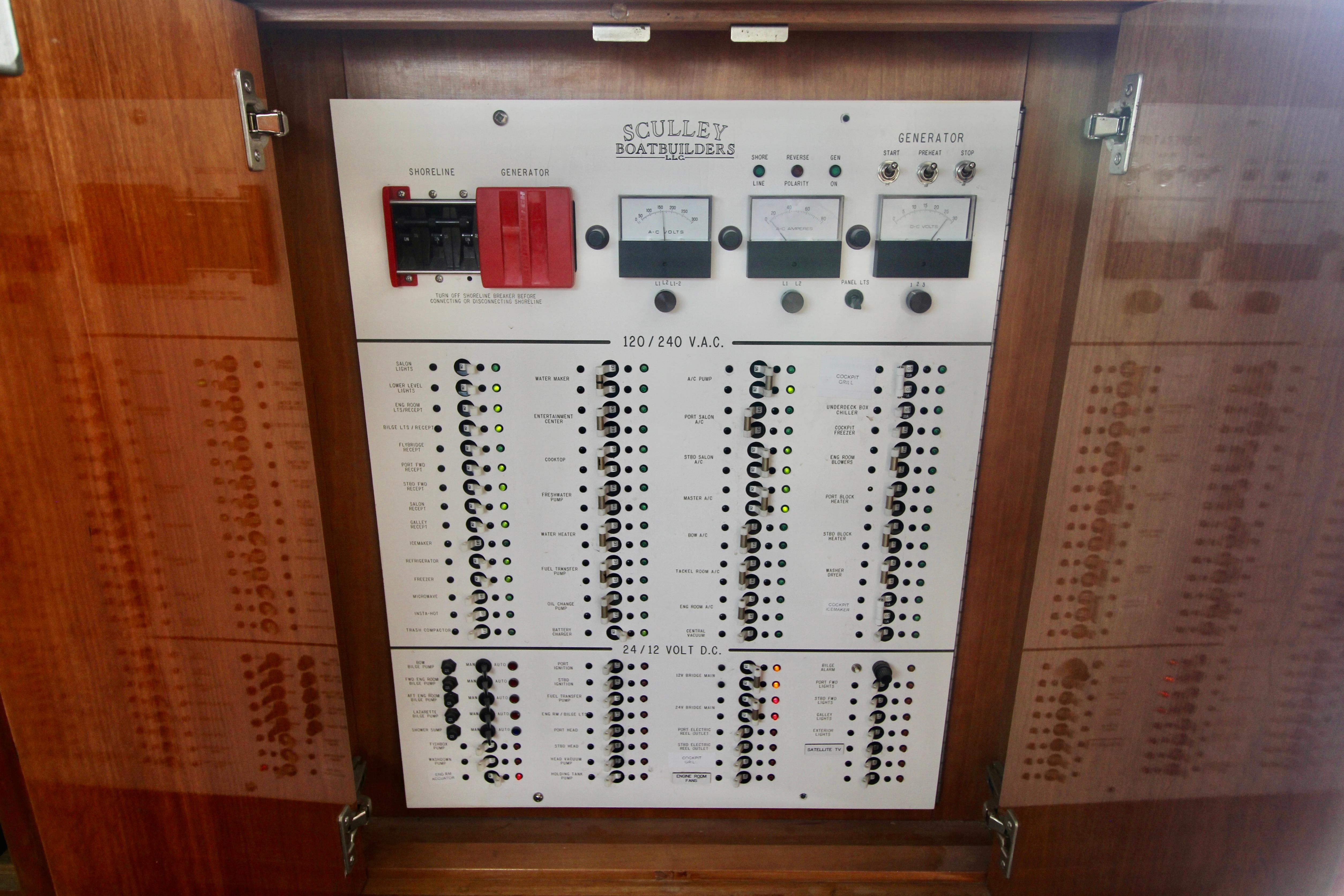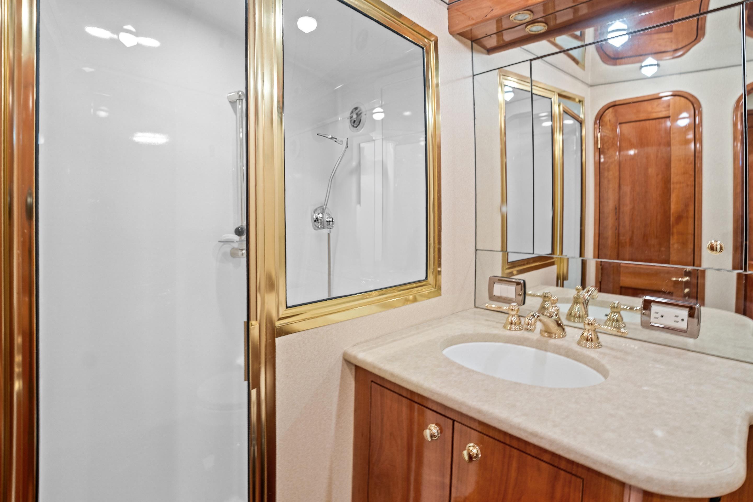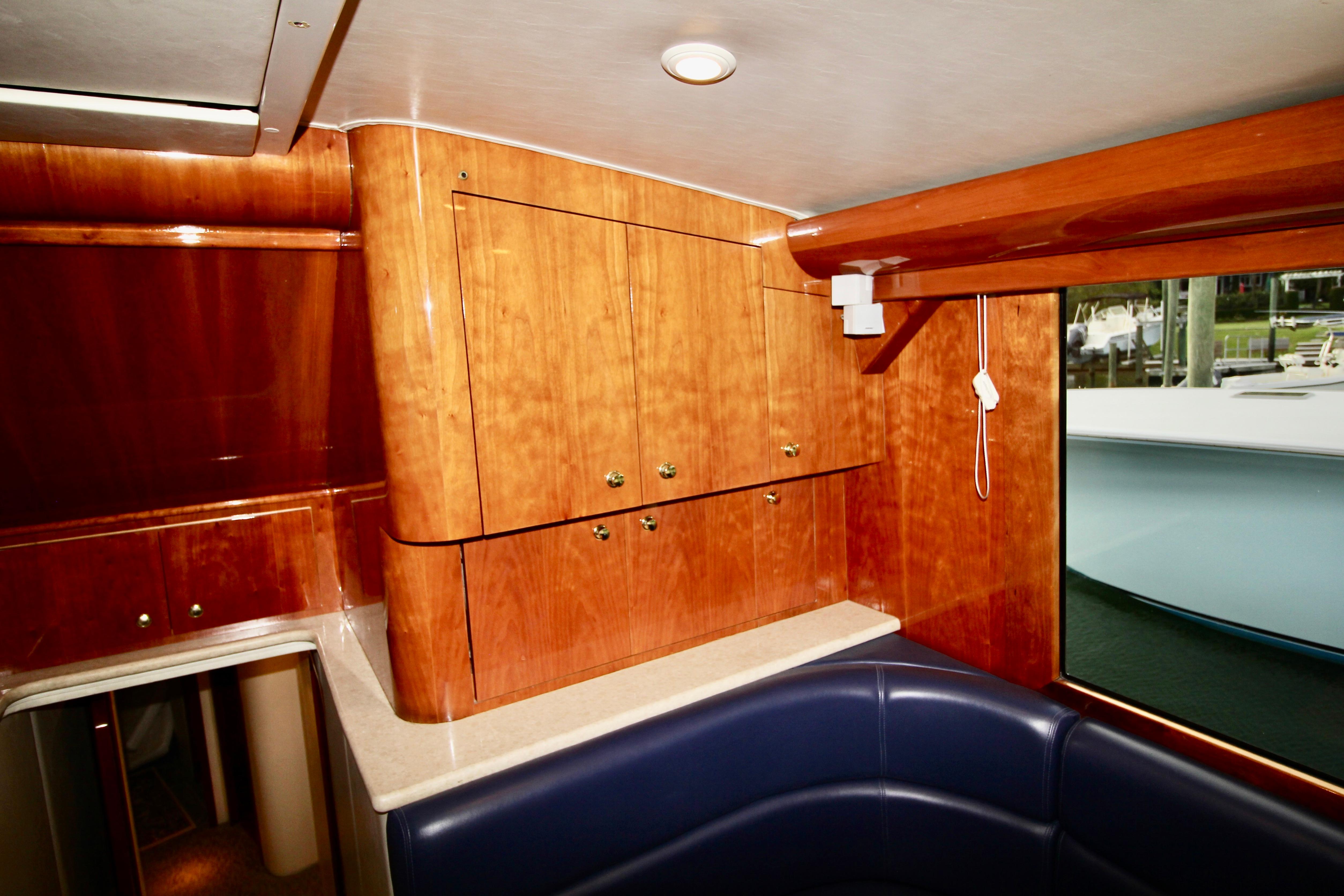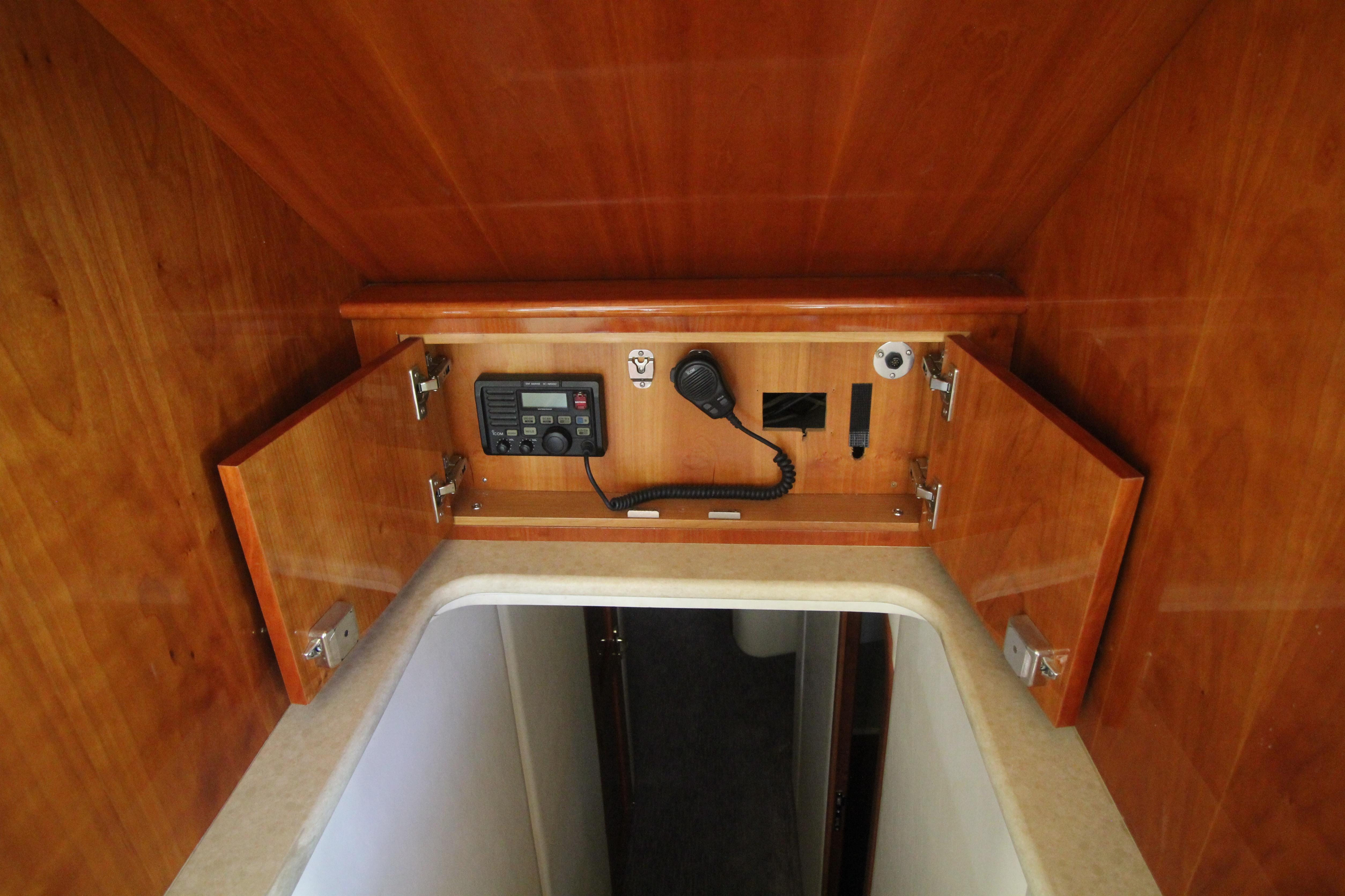 Entering the salon you find a very spacious layout with beautiful high gloss cherry cabinetry and lots of custom features. To the port is a large L-shapped leather couch with storage and inlaid high gloss wood coffee table, to your starboard is a long cabinet with a Corian countertop that includes the fully labeled electrical panel, the TV and stereo and the large Hoshizaki ice maker. AC is discharged through custom wood soffits for minimum noise and aesthetics. Forward starboard is the wrap around dinette with a high gloss wood table. To the port is the galley with Corian countertops, high gloss cabinets, (4) Sub-Zero refrigerator/freezer drawers, (4) burner cooktop, Corian sink and a microwave. At the top of the companion way is a custom drop down TV built into the headliner, lots of storage and a Icom VHF radio. As you move forward a central vac system is under the companionway steps, to the starboard is an enclosed bunk room with a hanging closet. Across the hall is the midship master with beautiful cabinetry, walk around queen, tons of custom storage and ensuite master head with shower, vanity and VacuFlush toilet. Moving forward again there is a washer / dryer combo unit to starboard in closet and to port is a rod storage closet. Starboard forward is the guest bath with shower, vanity and VacuFlush toilet. All the way forward is the bow stateroom with large crisscrossed over under bunks, the upper bunk to port is a double berth and starboard is a single below. There is a private entrance to the guest head and plenty of storage.