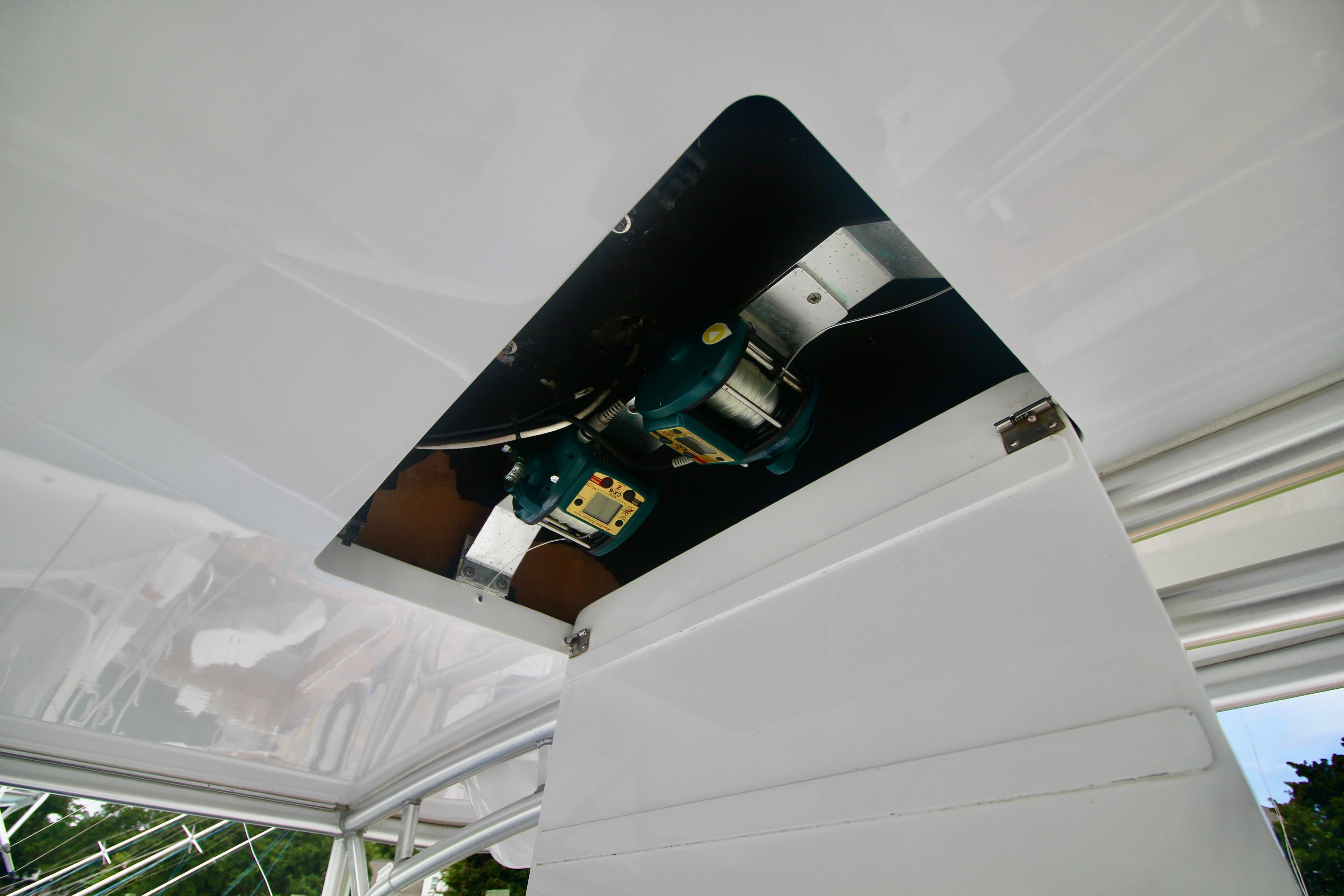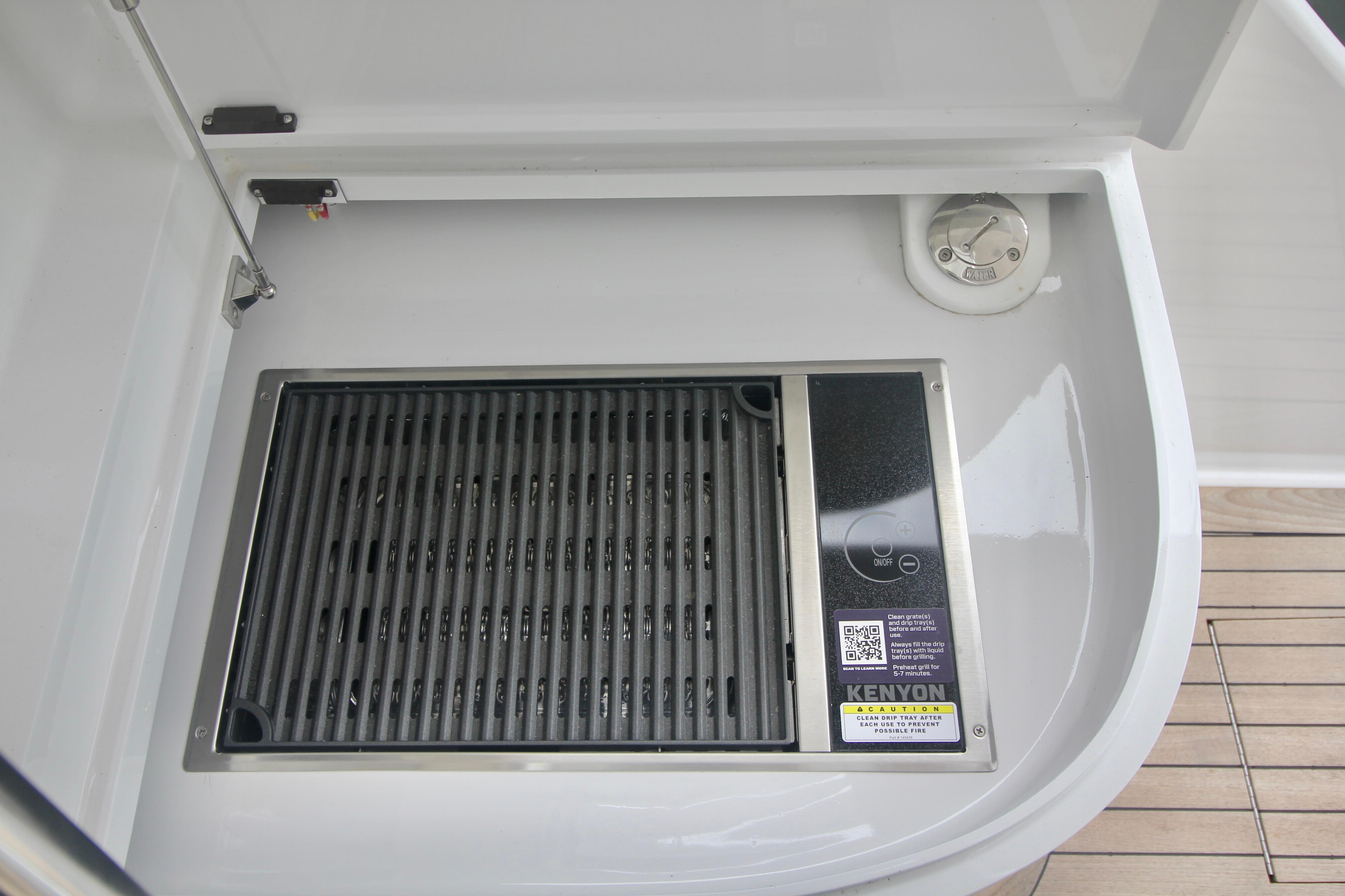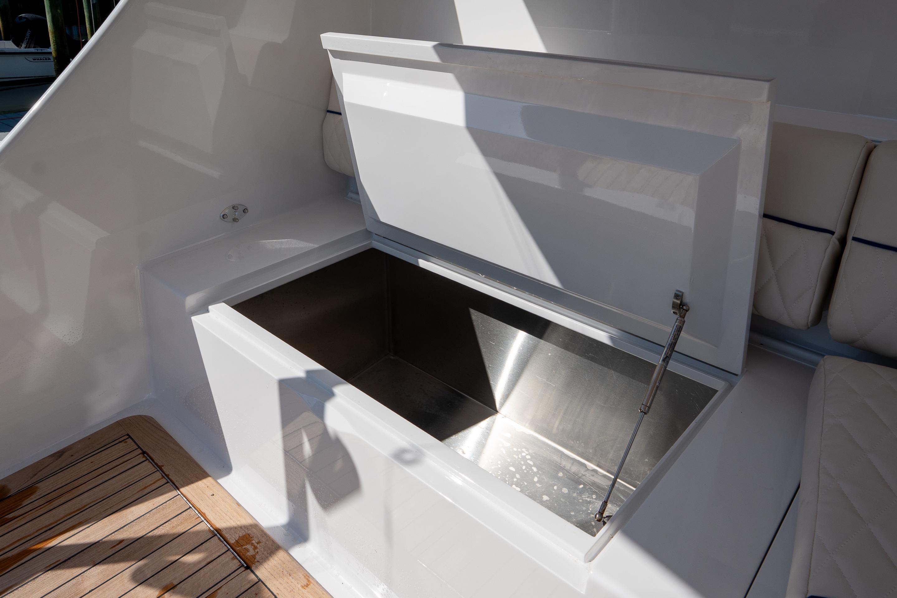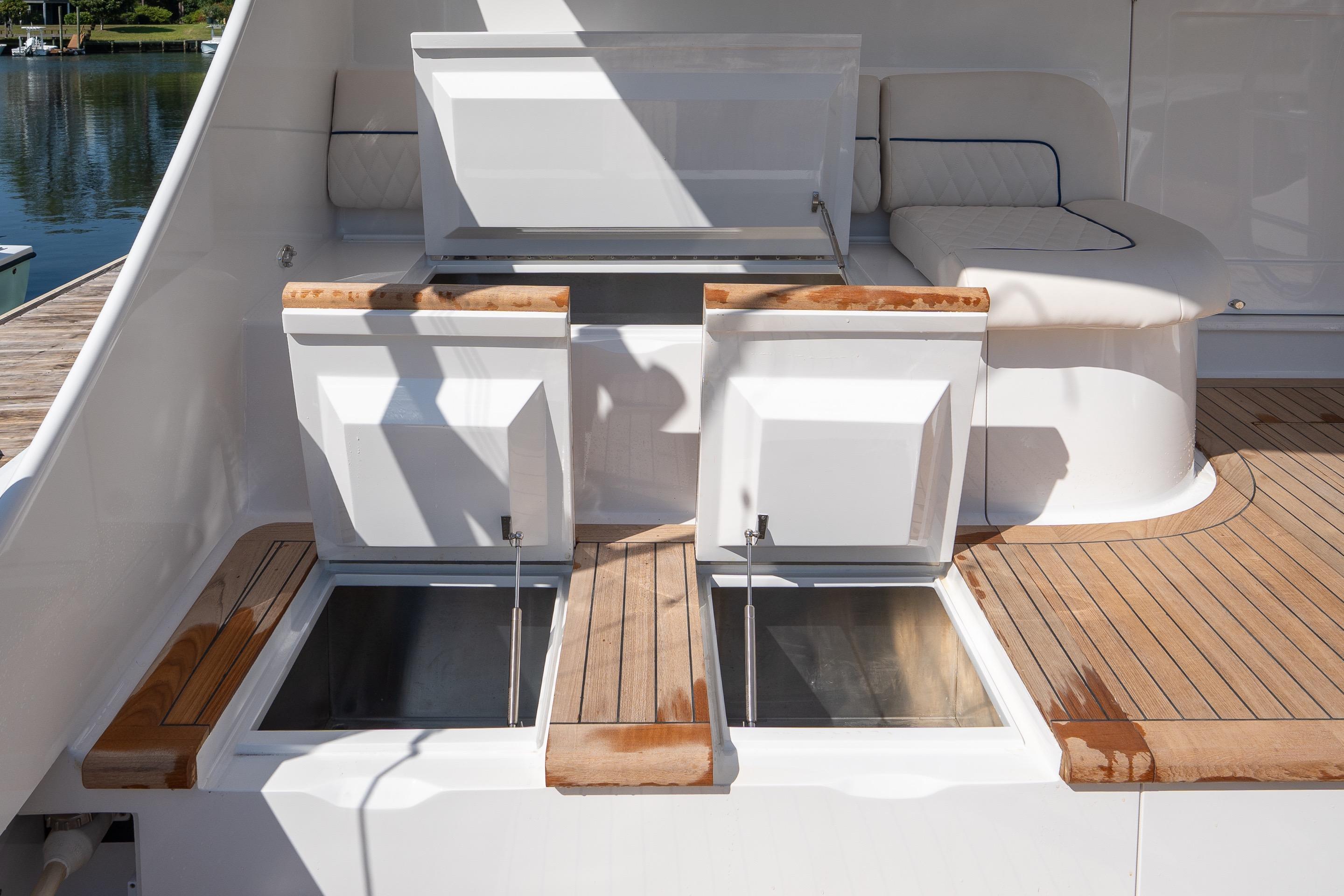 - Custom mezzanine with diamond stitch cushions, teak deck, ss lined storage, ice machine dump and a custom electric engine room door 2025