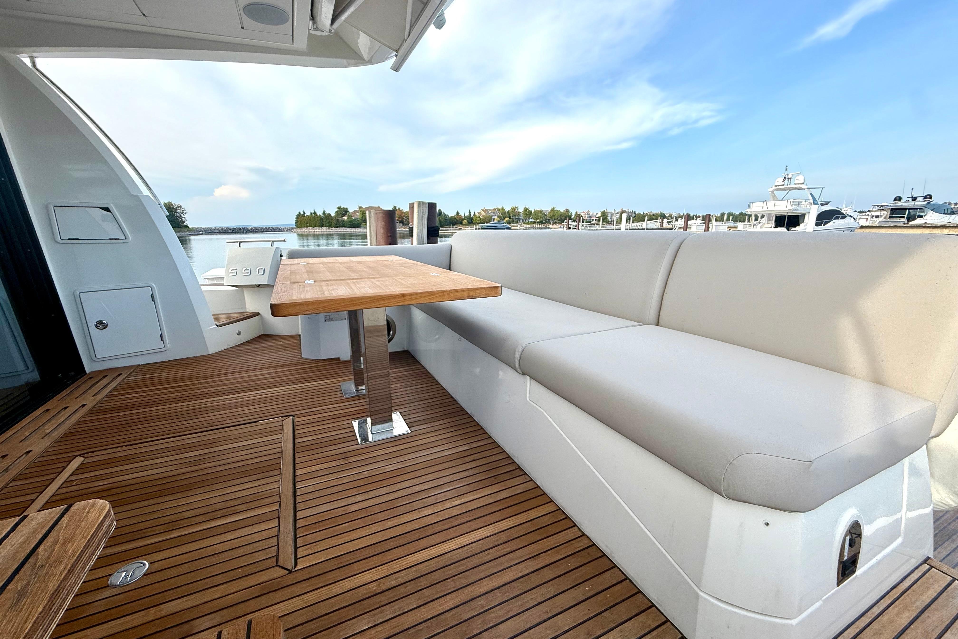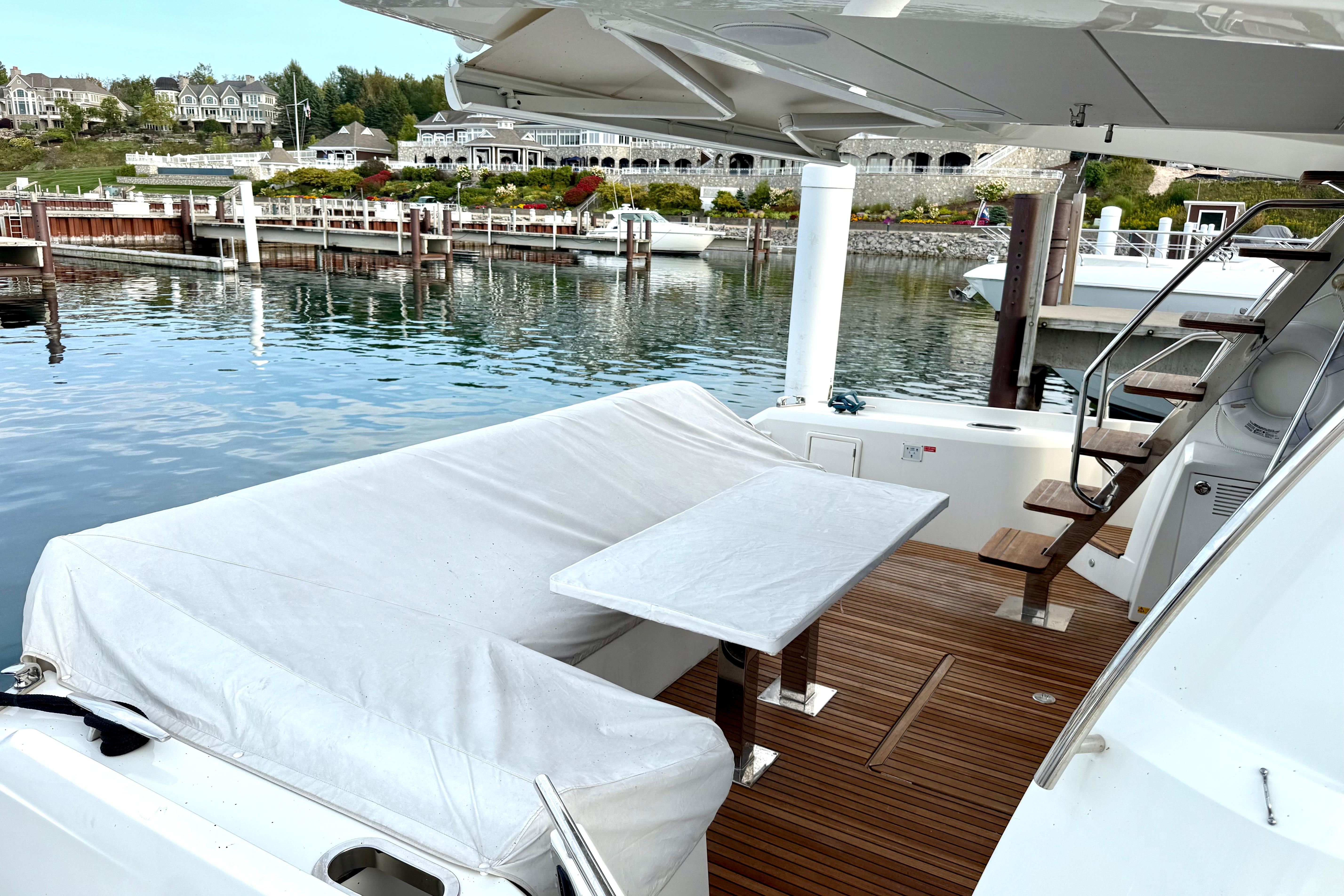A deep, teak-laid cockpit with wide, safe side-decks welcomes you aboard. The hydraulic swim platform lowers for tender launch and becomes a private beach—perfect for lounging at water level. An electric cockpit sunshade and aft docking controls simplify hot days and tight slips.